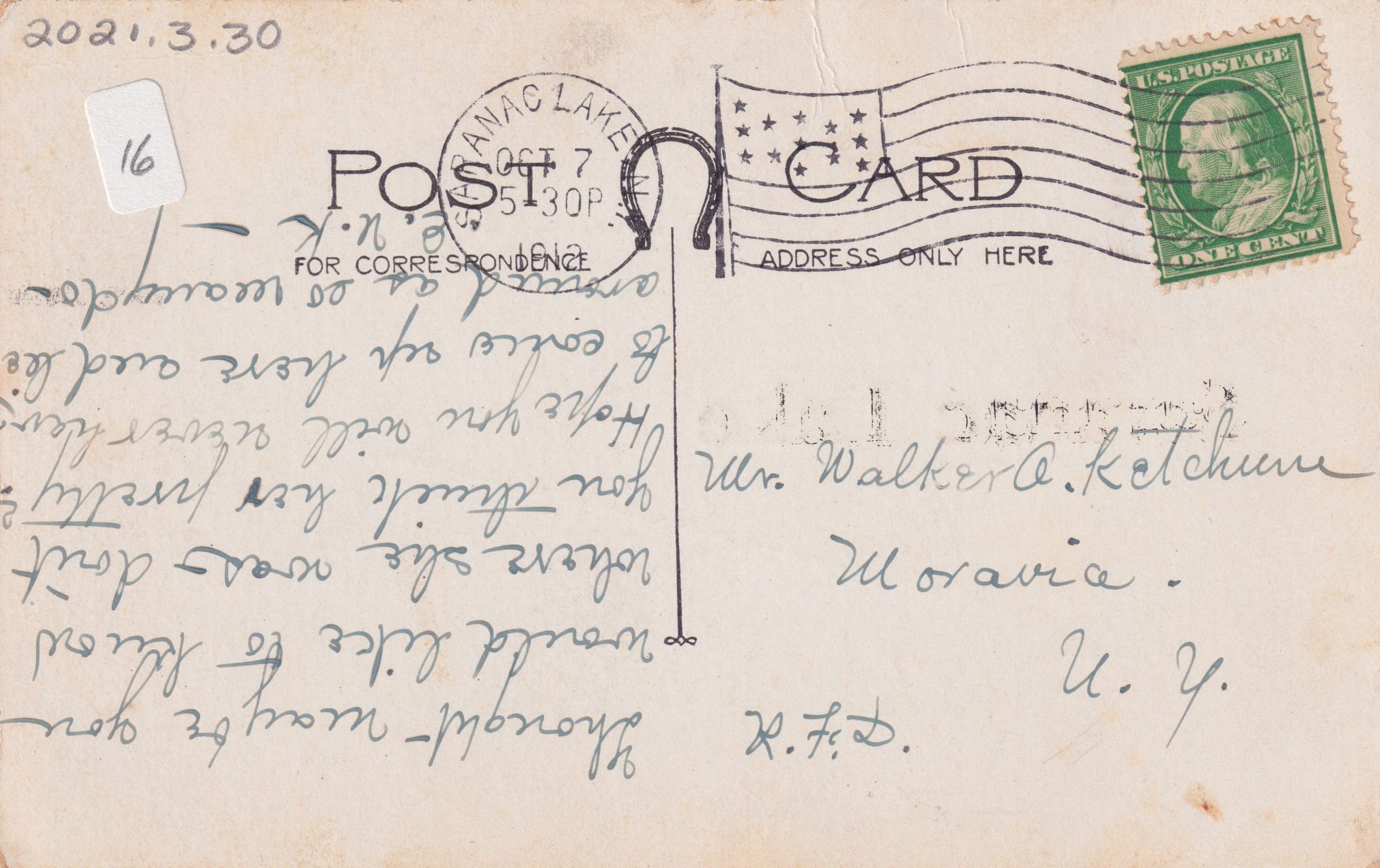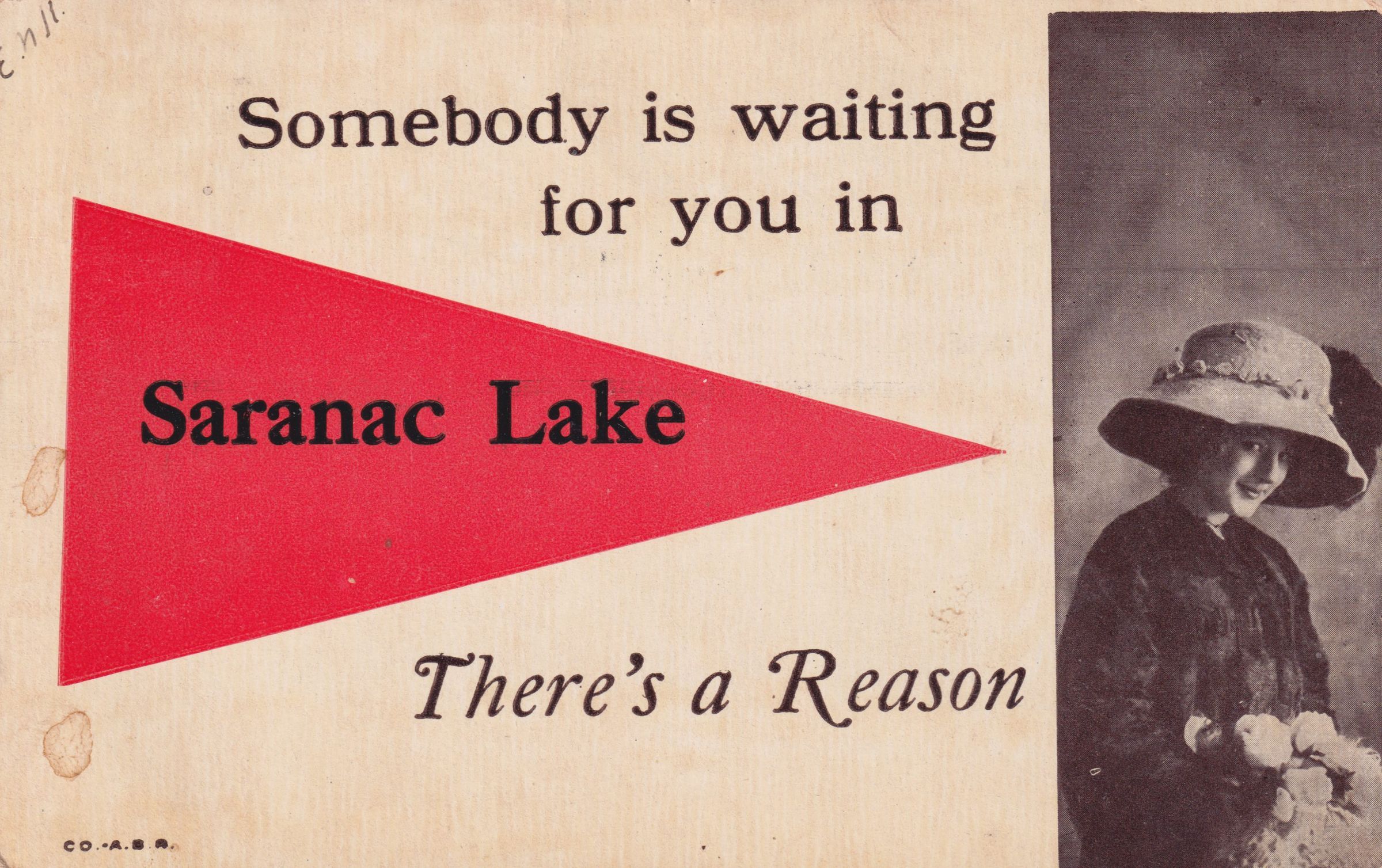 Color postcard reading, "Somebody is waiting for you in Saranac Lake [enclosed in pennant shape], There's a Reason," alongside a black and white photograph of a woman in a hat. Used, divided back, postmarked October 7, 1912, Saranac Lake, NY. Handwritten message on the back reads, "Thought maybe you would like to know where she was. Don't you think her pretty? Hope you will never have to come up here and lie around as so many do. E. U. K." Mailed to Mr. Walker A. Ketchum, Moravia, N.Y., R.F.D.Collection