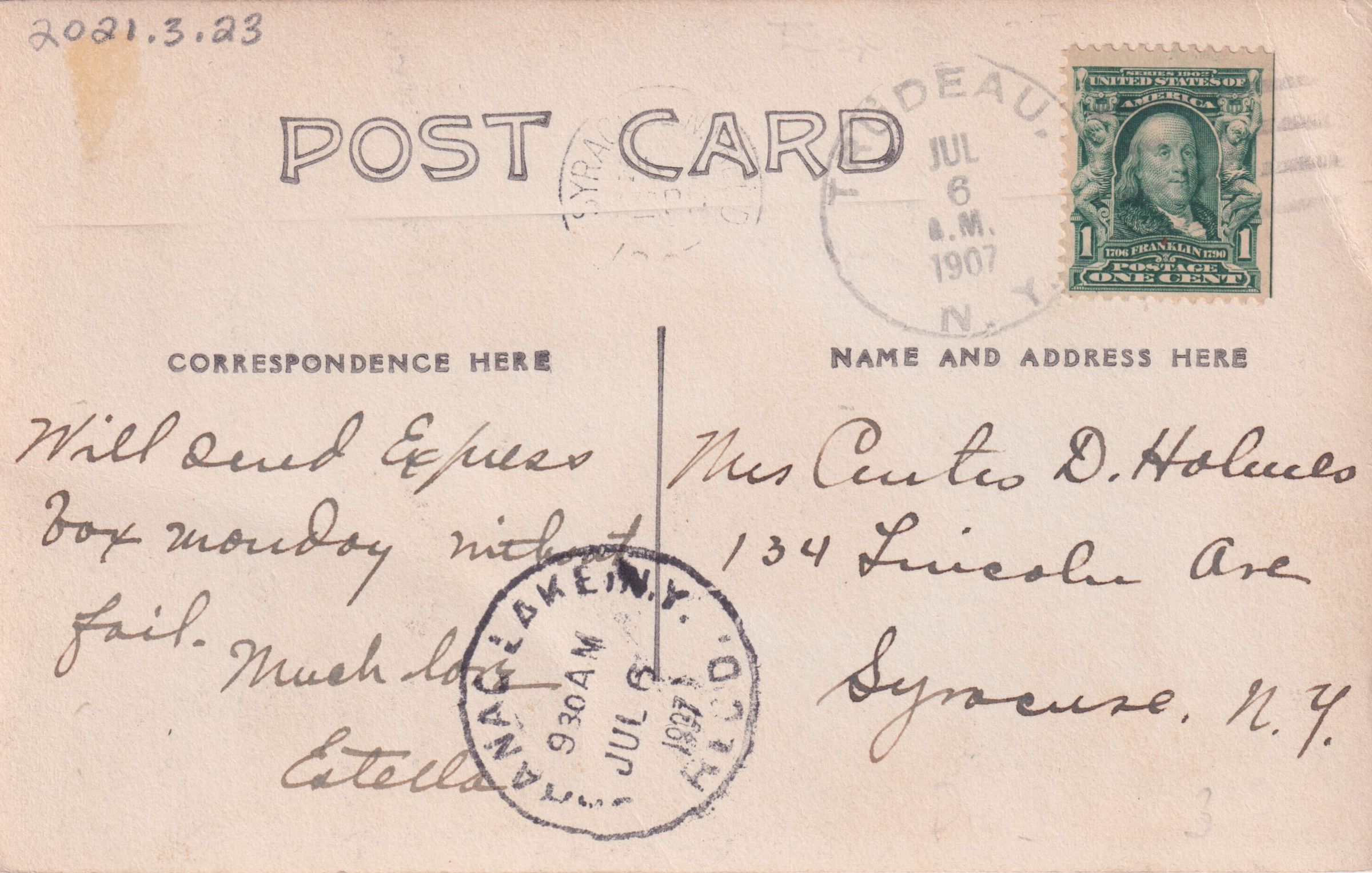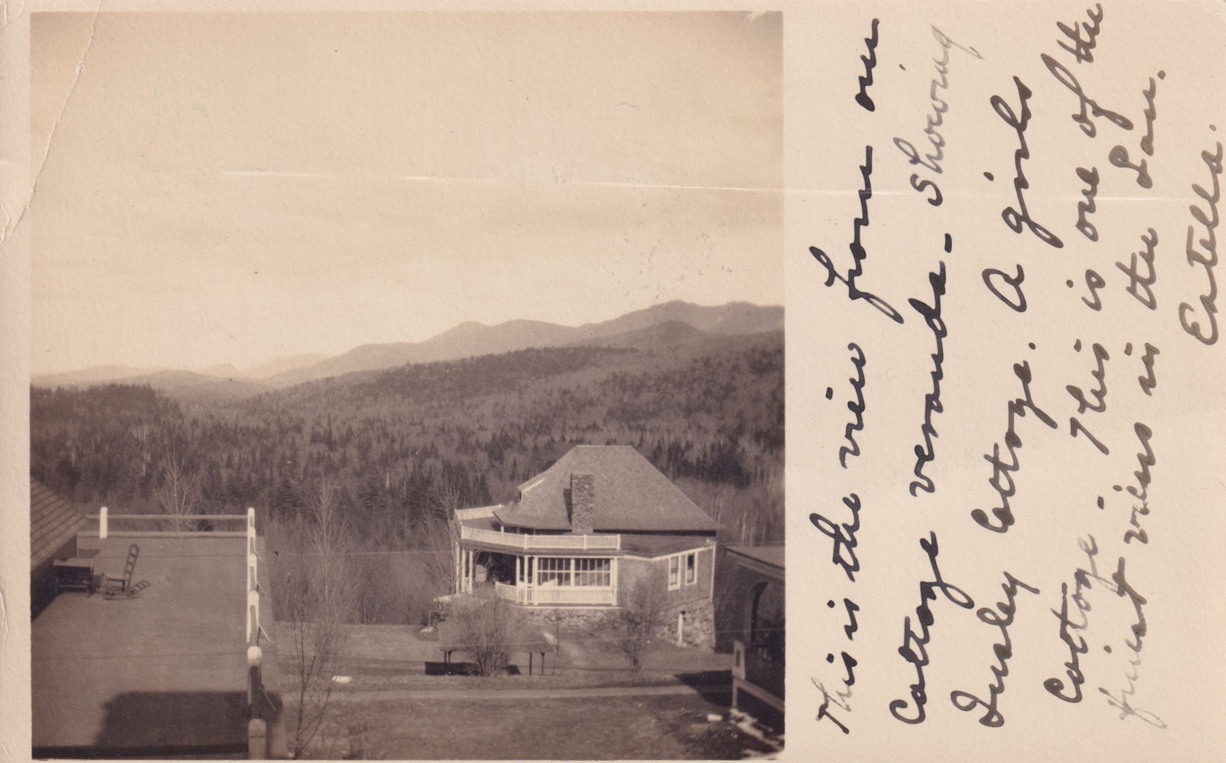 Black and white photo postcard showing Inslee Cottage and the grounds of Adirondack Cottage Sanitarium with mountains visible behind. Used, divided back, postmarked July 6, 1907, Trudeau, NY. No printer or photographer listed. Handwritten message on front reads, "This is the view from our cottage veranda. Showing Inslee Cottage. A girls cottage. This is one of the finest views in the San. Estella." Handwritten message on the back reads, "Will send express box Monday without fails. Much love, Estella." Mailed to Mrs. Curtis D. Holmes, 134 Lincoln Ave, Syracuse, N.Y.Subject Place