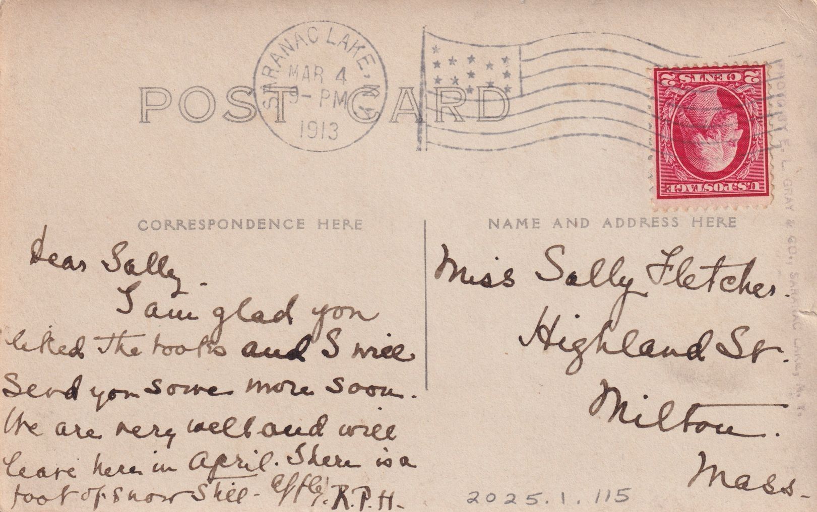 Handwritten message on reverse reads, "Dear Sally, I am glad you liked the books and I will send you some more soon. We are very well and will leave here in April. There is a foot of snow still. [?] R. P. H." Mailed to Miss Sally Fletcher, Highland St., Milton, MA.Subject Place