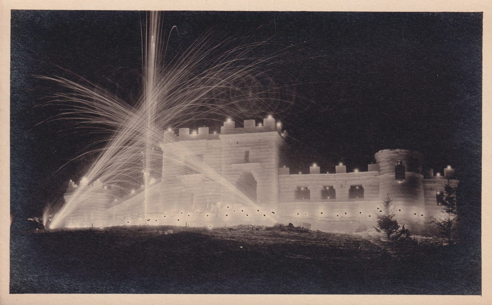 Black-and-White photograph postcard showing a nighttime view of an ice palace from an unidentified Winter Carnival. There are fireworks exploding in front of the palace, and candles can be seen surrounding it. "Photo by Adirondack Art Store, Saranac Lake, N. Y." stamped on reverse. Unused, divided back, white border.Subject Place