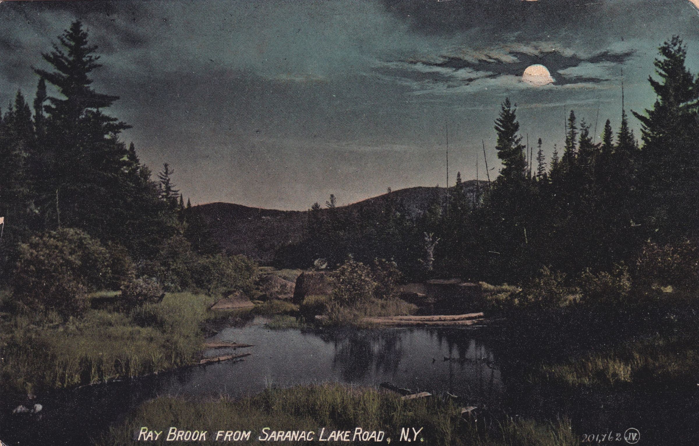 Color postcard showing the moon shining over a body of water, surrounded by trees. Printed caption on the front reads, "Ray Brook from Saranac Lake Road, N.Y." Used, divided back, postmarked Ray Brook, December 4, 1916. Printed by the Valentine & Sons Publishing Co., Ltd., New York. Handwritten message on the back reads, "My Dear Friend. Your most welcome letter rec'd. Was pleased to hear from you. I am feeling fine. Are you going to the Fair? Sorry I can't go. Hope they have a nice time. Hope this card finds you all well. Dec. 3/16 Rose." Mailed to Mrs. Alva Paul, East Aurora, NY, Erie Co.Subject Place