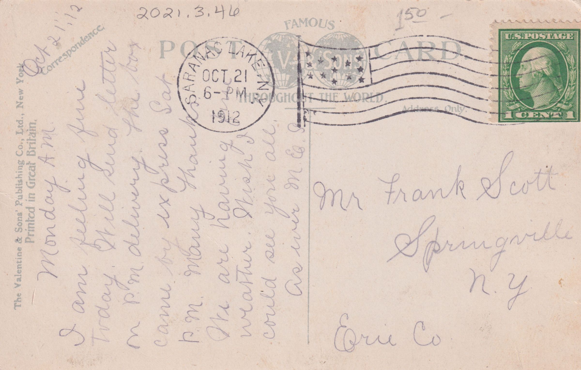 Color postcard showing an image of the south face of the Prescott House / Reception Hospital. The printed caption on the front of the card reads, "Reception Hospital, Saranac Lake, N.Y." Used, divided back, postmarked October 21, 1912, Saranac Lake, NY. Printed by the Valentine & Sons' Publishing Co., Ltd., New York. Handwritten message on back reads, "Monday AM. I am feeling fine today. Will send letter on PM delivery. The box came by express Sat. PM. Many thanks. We are having fine weather. Wish I could see you all. As Ever, M.E.S." Mailed to Mr. Frank Scott, Springvillle, N. Y., Erie Co.Subject Place