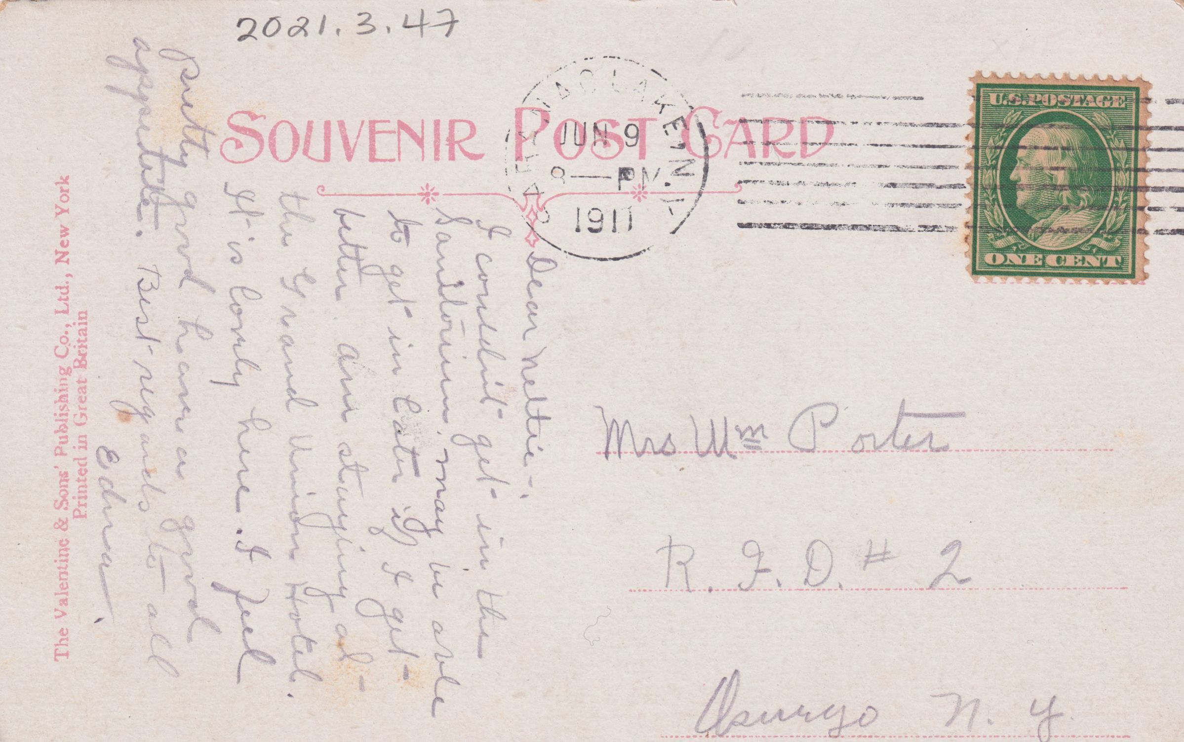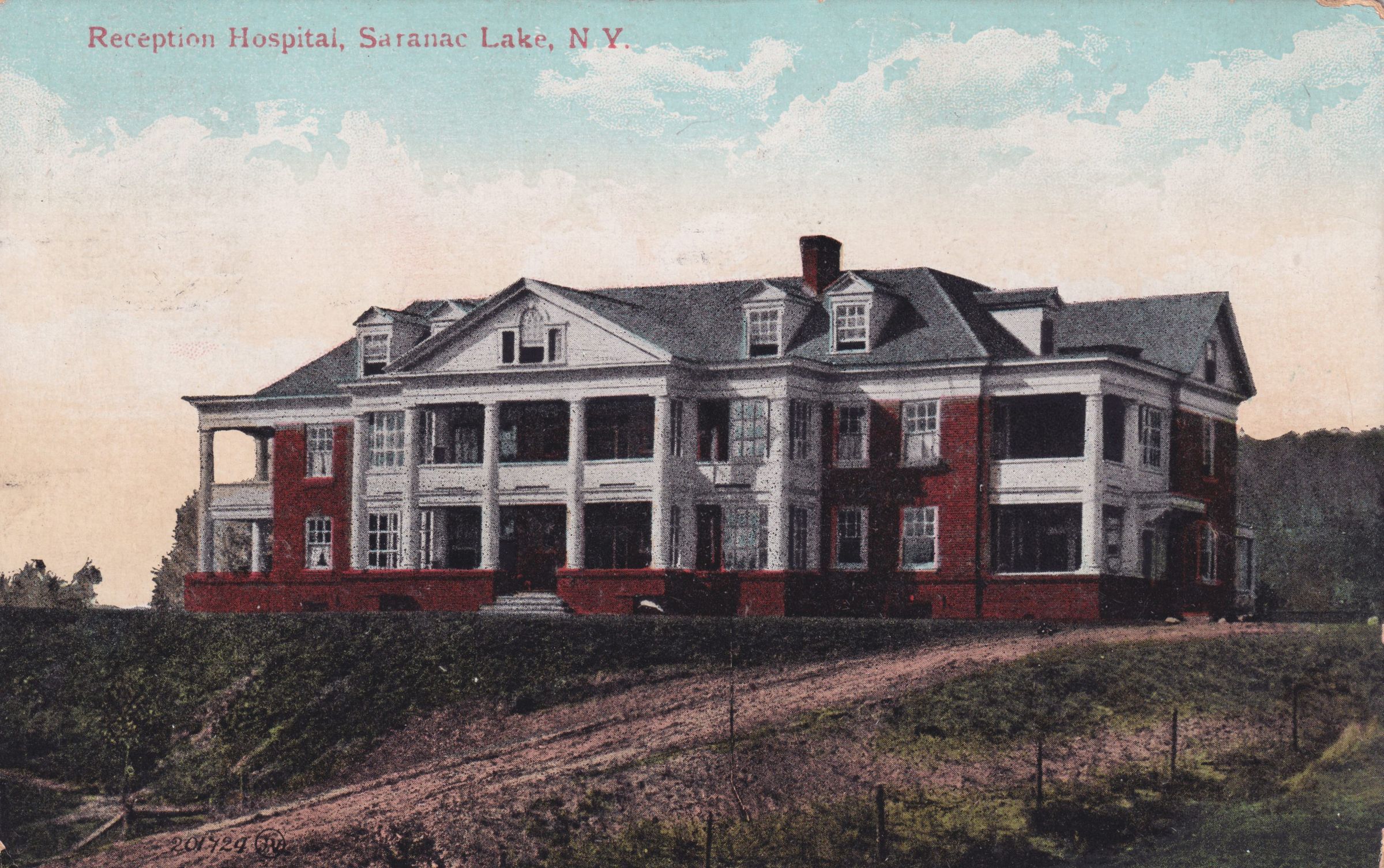 Color postcard showing an image of the south face of the Prescott House / Reception Hospital. The printed caption on the front of the card reads, "Reception Hospital, Saranac Lake, N. Y." Used, divided back, postmarked June 9, 1911, Saranac Lake, NY. Printed by the Valentine & Sons' Publishing Co., Ltd., New York. Handwritten message on the back reads, "Dear Nettie. I couldn't get in the Sanitorium. May be able to get in later if I get better. Am staying at the Grand Union Hotel. It is lovely here. I feel pretty good, have a good appetite. Best regards to all, Edna." Mailed to Mrs. Wm Porter, R. F. D. #2, Oswego, N. Y.Subject Place