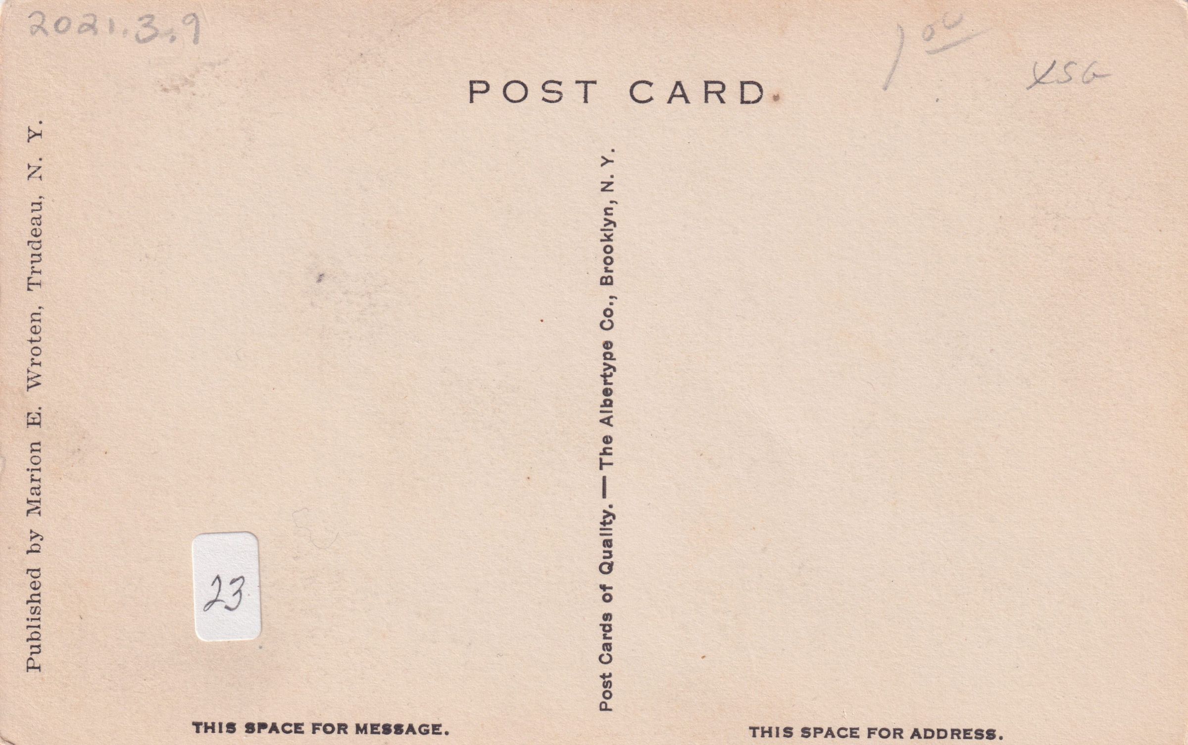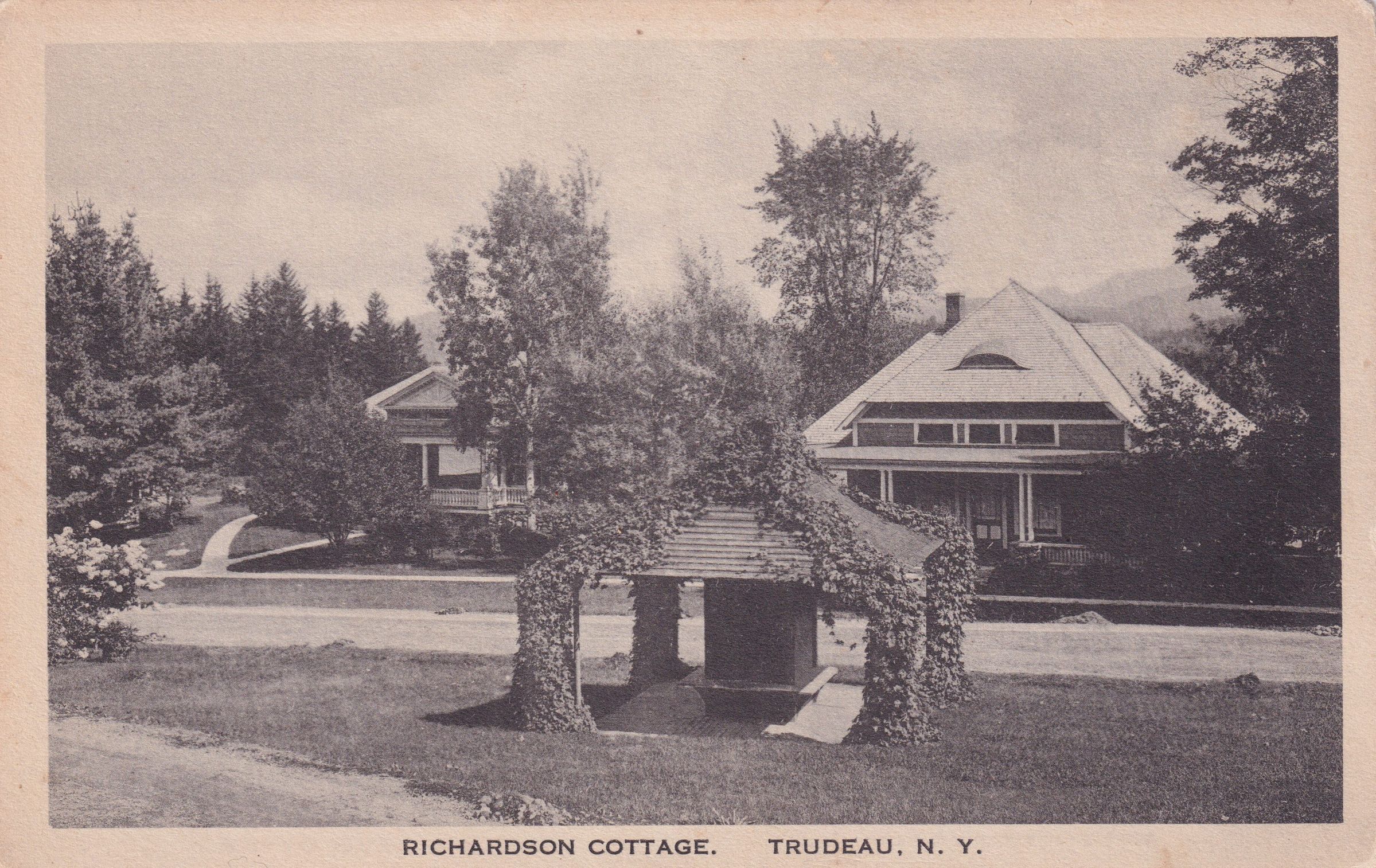 Black and white postcard showing the Richardson Cottage [left, behind trees] and grounds at Trudeau Sanatorium. Unused, divided back. Published by Marion E. Wroten, Trudeau, N.Y. Caption printed on front reads "Richardson Cottage, Trudeau, N.Y."Subject Place