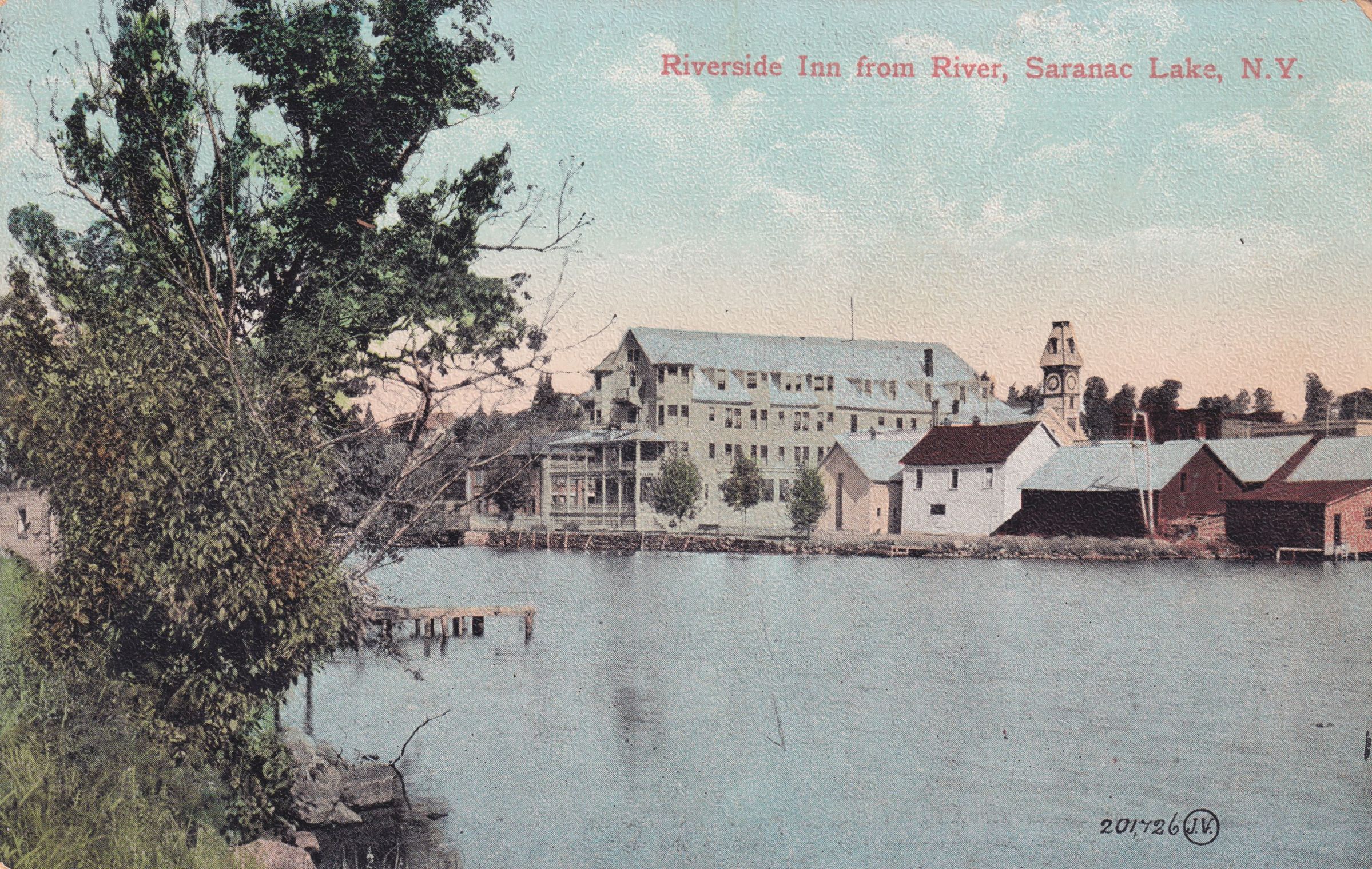 Color postcard showing the Riverside Inn across the Saranac River, looking to the northeast. The original Harrietstown Town Hall and other buildings are visible around it. Printed caption on the front reads, "Riverside Inn from River, Saranac Lake, N.Y." Used, divided back, not mailed. Printed by the Valentine & Sons' Publishing Co., Ltd. Handwritten message across the entire back of the card reads, "DeKalb Junction, June 23, 1910. Dear Husband, I will write you just a few lines this morning. We are all well. I received your letter of the seventeenth yesterday, also a letter from home and a couple of very pretty birthday cards. Well Lester, you can think that the boys and I are over to Depeyster the second or third of July, if nothing happens, to stay a couple of days, going after strawberries to can. And, also some plants to set out. Everything is growing fine in the garden, but oh my it is hard work to do so much weeding. I wish you had half of it up there to busy yourself with. With my love to you I will say good-by. From Your Wife. I am glad you are feeling so much better if it only lasts."Subject Place