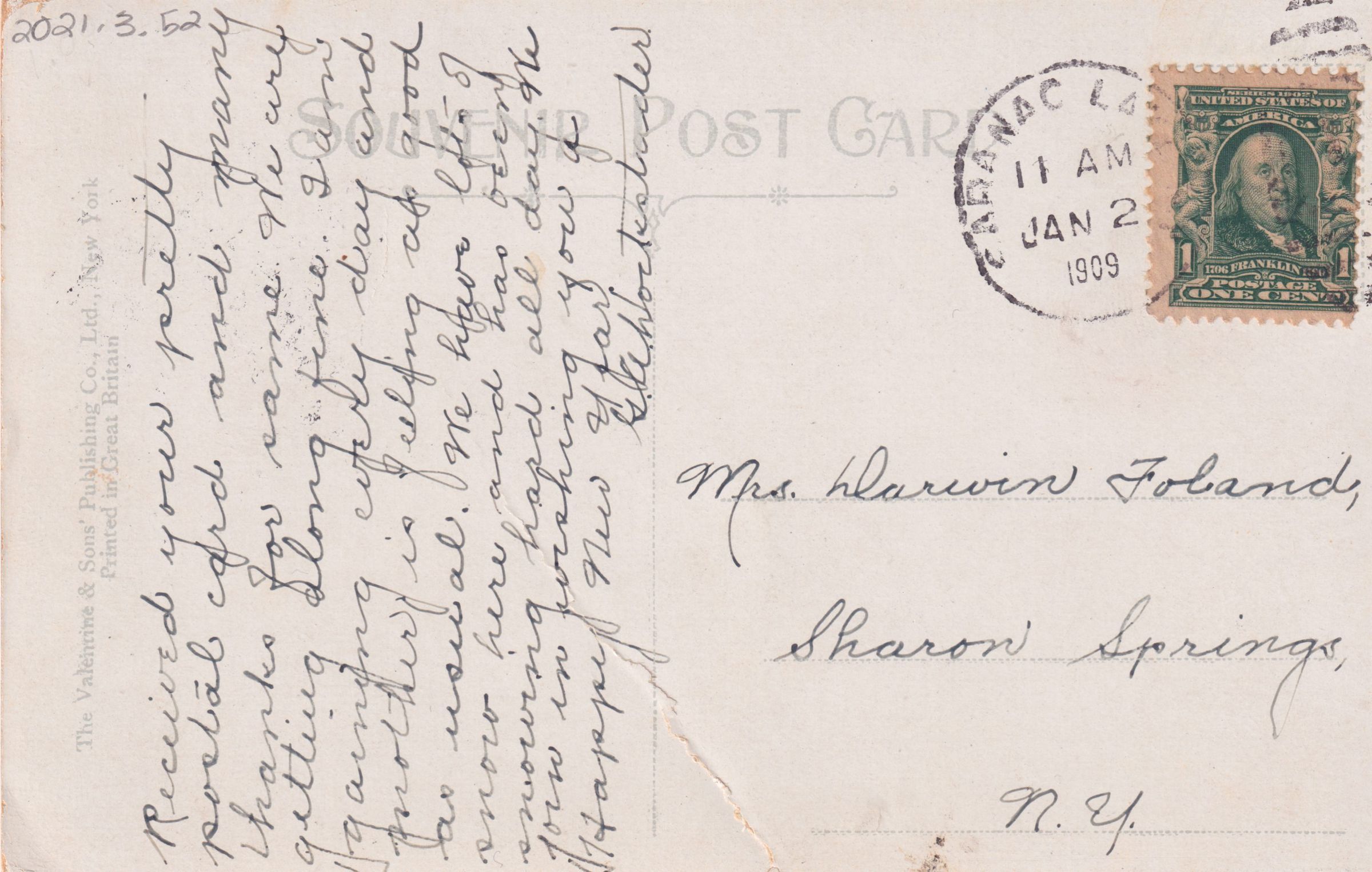 Color postcard showing the north and west faces of the Riverside Inn. A horse drawn carriage is parked alongside the building and some people can be seen on first floor porch. Printed caption on the front reads, "Riverside Inn, Saranac Lake, N. Y." Used, divided back, postmarked January 2, 1909. Printed by the Valentine & Sons' Publishing Co., Ltd., New York. Handwritten message on the back reads, "Received your pretty postal card and many thanks for same. We are getting along fine. I am gaining every day and Mother is feeling as good as usual. We have lots of snow here and has been snowing hard all day. We join in wishing you a Happy New Year. G.W. Hockstader." Mailed to Mrs. Darwin Toland, Sharon Springs, N. Y.Subject Place