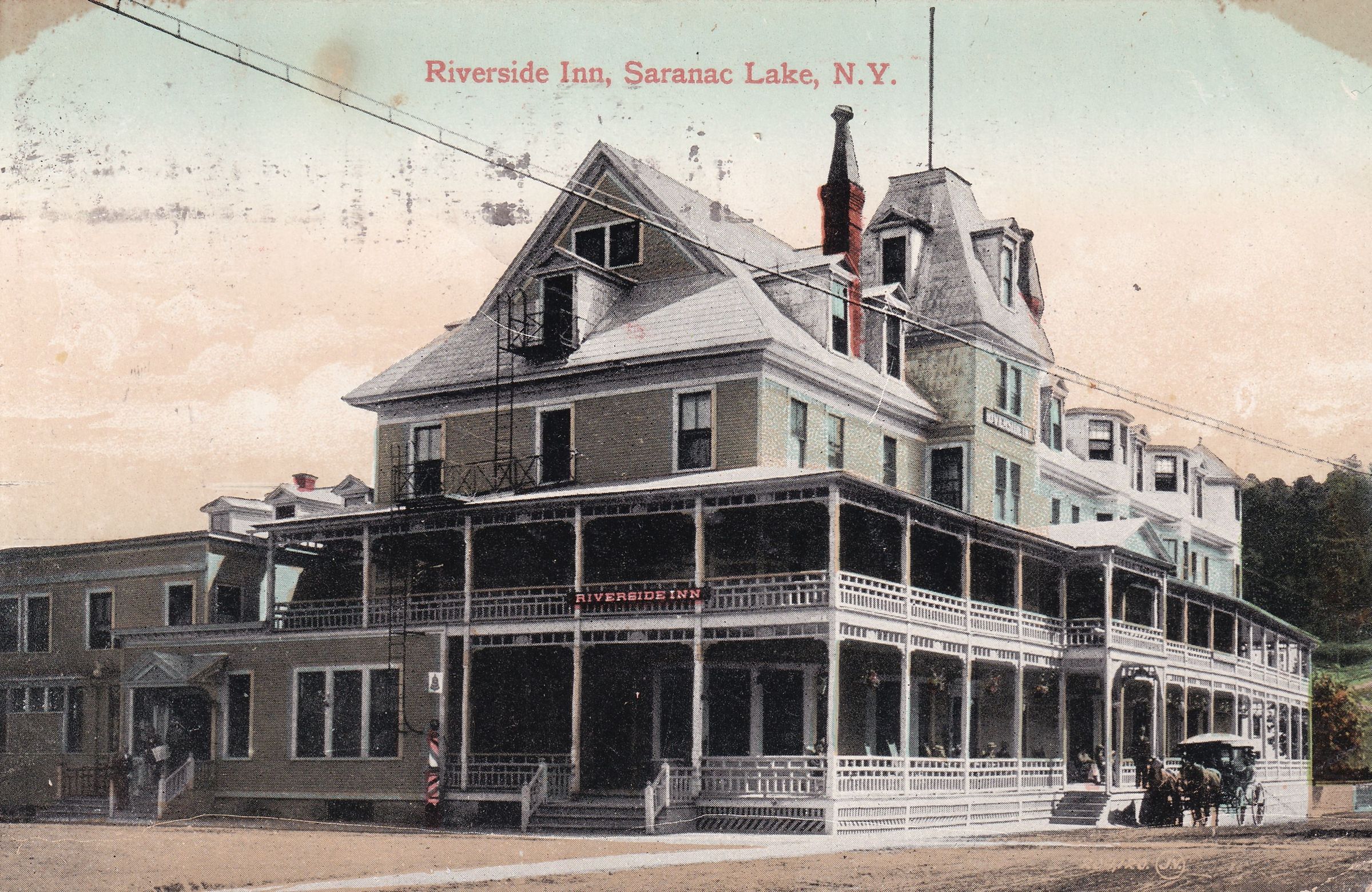 Color postcard showing the Riverside Inn. Printed caption on front reads, "Riverside Inn, Saranac Lake, N.Y." Printed by the Valentine & Sons' Publishing Co., Ltd., New York. Used, divided back, postmarked Saranac Lake, September 7, 1908. Handwritten message on back reads, "Dear Bro & Sister, Rec'd the childrens cards, thank you. Rec'd card, I am getting along fine, Doctor says I ought to stay here all winter, & get cured, but I don't see how I can now, as Mont has lost his job again, & I am down & out. I am trying to find a way to stay, but I don't know how I'll make out as I can't work yet for awhile. I'll write later, when I don't feel so blue. I am all broke up over it, just my luck. Love to all, Addie." Mailed to Mr. Henry Pofie [?], National City, California.Subject Place