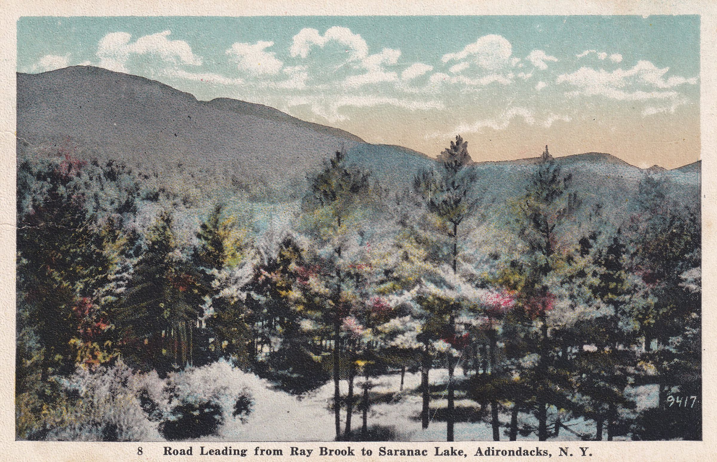 Color postcard showing a snowy road along a mountain. Printed caption on front reads, "Road Leading from Ray Brook to Saranac Lake, Adirondacks, N. Y." No printer's mark. Used, divided back, white border, postmarked Ray Brook, January 3, 1921. Handwritten message on back reads, "Jan 2, 1920 [sic]. Dear Johnie, I got your letter and got the two boxes my coat and the cats [?]. Come up when you get a job. Write to me often. Eva XX." Mailed to John Stagner, 409 West Liberty St., Rome, NY.Subject Place