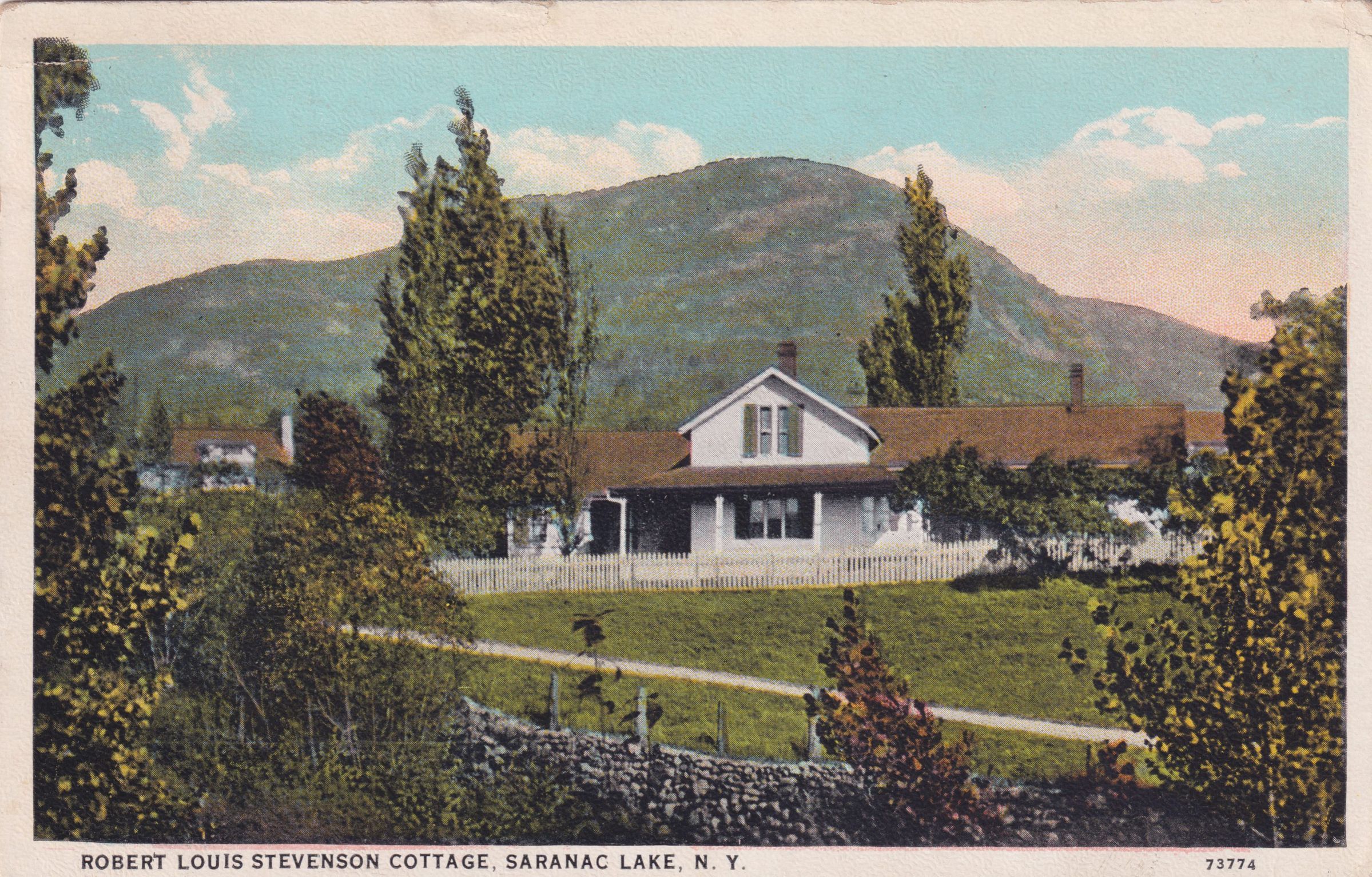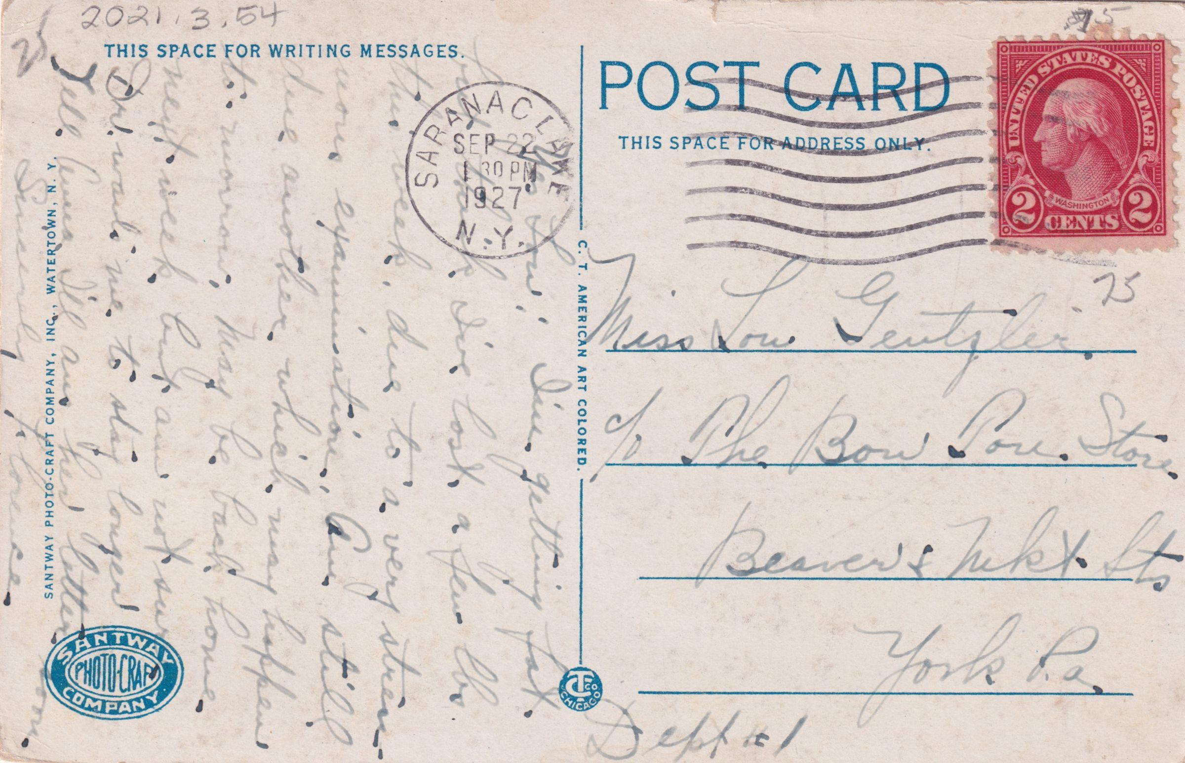Color postcard showing the Robert Louis Stevenson Cottage [Baker Cottage] surrounded by trees and bushes. Mt. Baker is visible in the background. Printed caption on the front reads, "Robert Louis Stevenson Cottage, Saranac Lake, N. Y." Used, divided back, postmarked September 22, 1927, Saranac Lake, NY. Printed by the Santway Photo-Craft Company, Inc., Watertown, NY. Handwritten message on the back reads, "Yes, Lou: I'm getting fat, but think I've lost a few lbs this week due to a very strenuous examination. Am still due another which may happen tomorrow. May be back home next week, but not sure. Dr. wants me to stay longer. Tell Anna I will answer her letter soon. Florence." Mailed to Miss Lou Gentzler, c/o the Bon Ton Store, Beaver & Mkt Sts, York, Pa, Dept #1.Subject Person/Organization