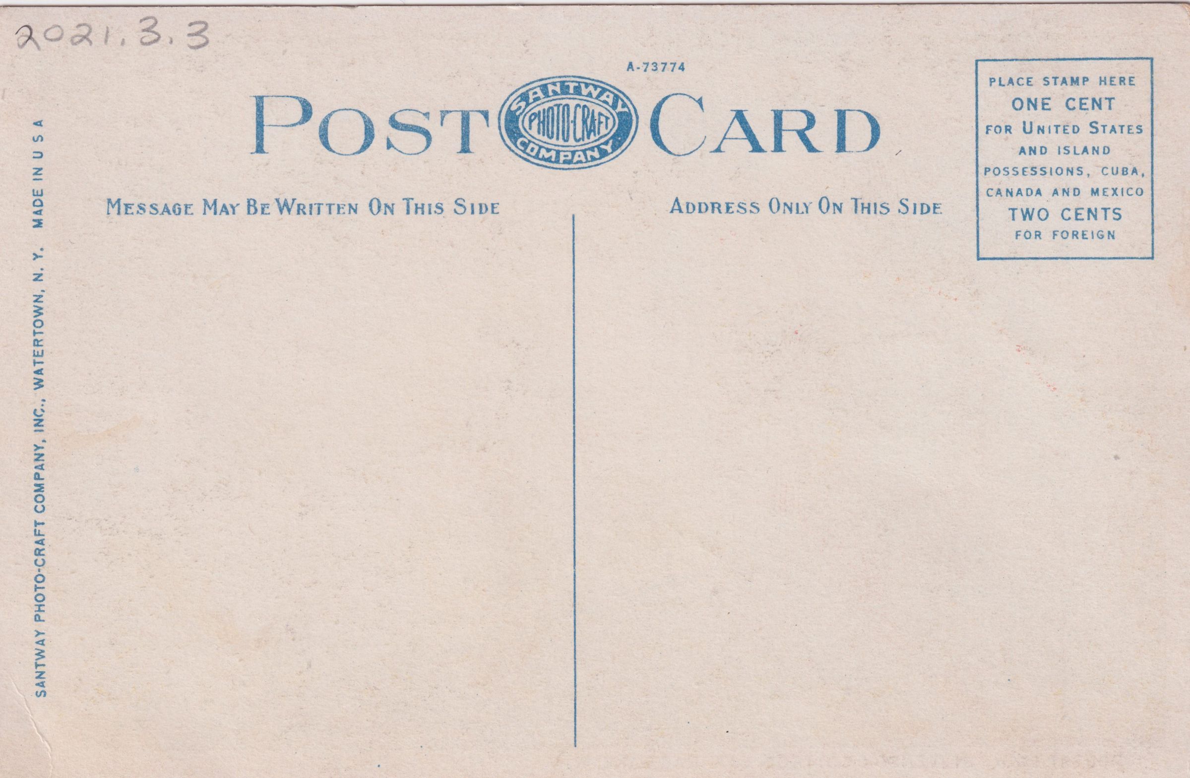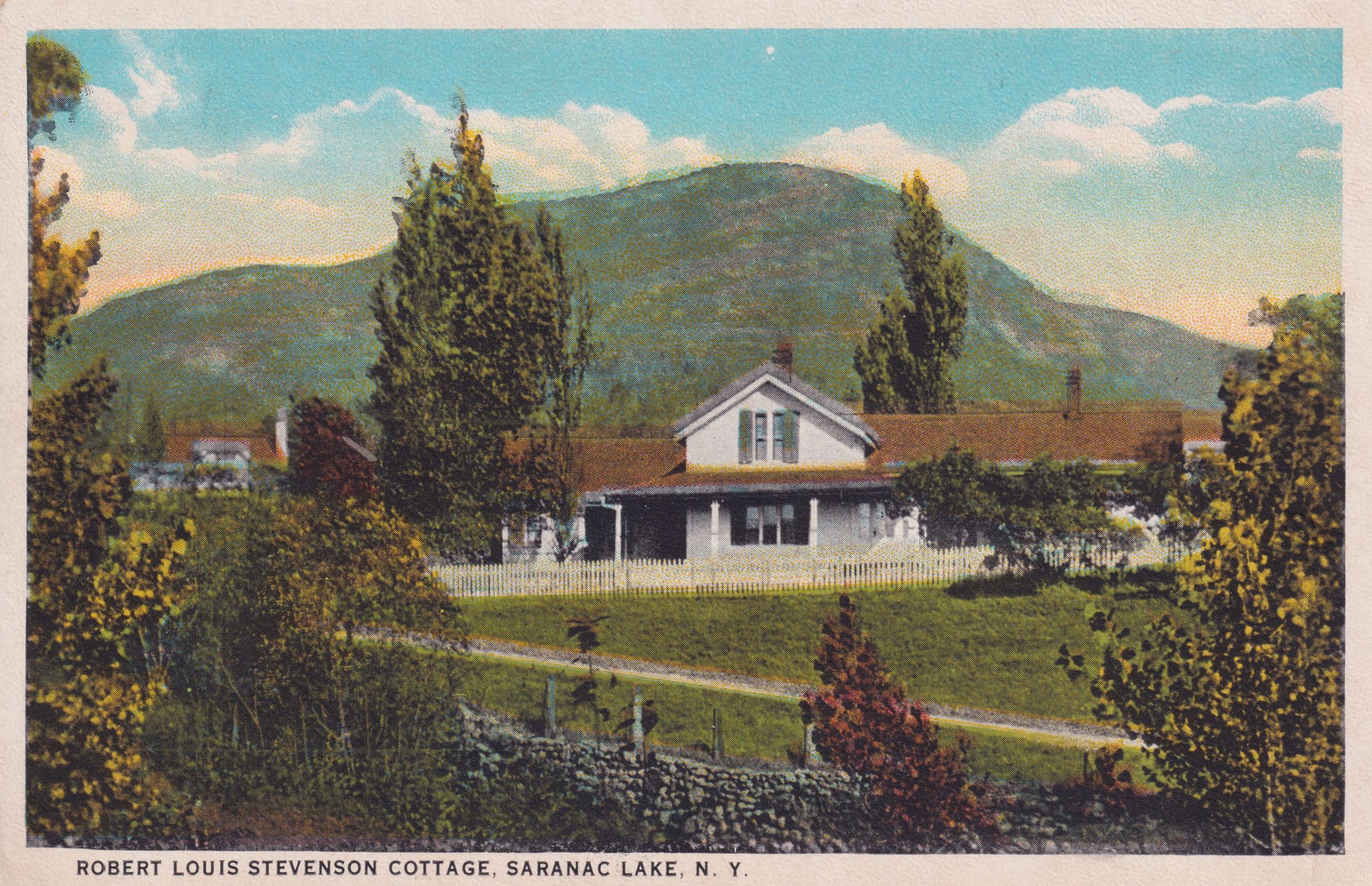 Color postcard of the Robert Louis Stevenson Cottage. Unused, divided back. Printed by Santway Photo-craft Company, Inc., Watertown, N.Y. Caption on front reads, "Robert Louis Stevenson Cottage, Saranac Lake, N.Y."Subject Place