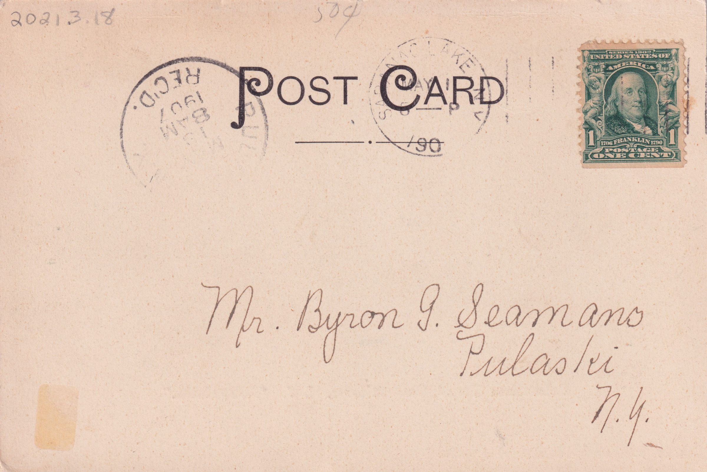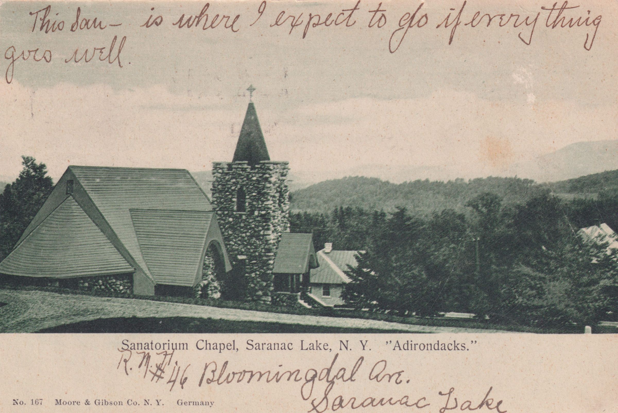 Black and white postcard of Baker Memorial Chapel at Adirondack Cottage Sanitarium from the rear looking east. Used, undivided back, postmarked May 1, 1907. Printed by Moore & Gibson Co., N.Y., Germany. Caption printed on front reads, "Sanatorium Chapel, Saranac Lake, N.Y. 'Adirondacks'." Handwritten note on front reads, "This San--is where I expect to go if everything goes well. R.M.H. #46 Bloomingdal [sic] Ave., Saranac Lake." Sent to Mr. Byron G. Seamans, Pulaski, N.Y.Subject Place
