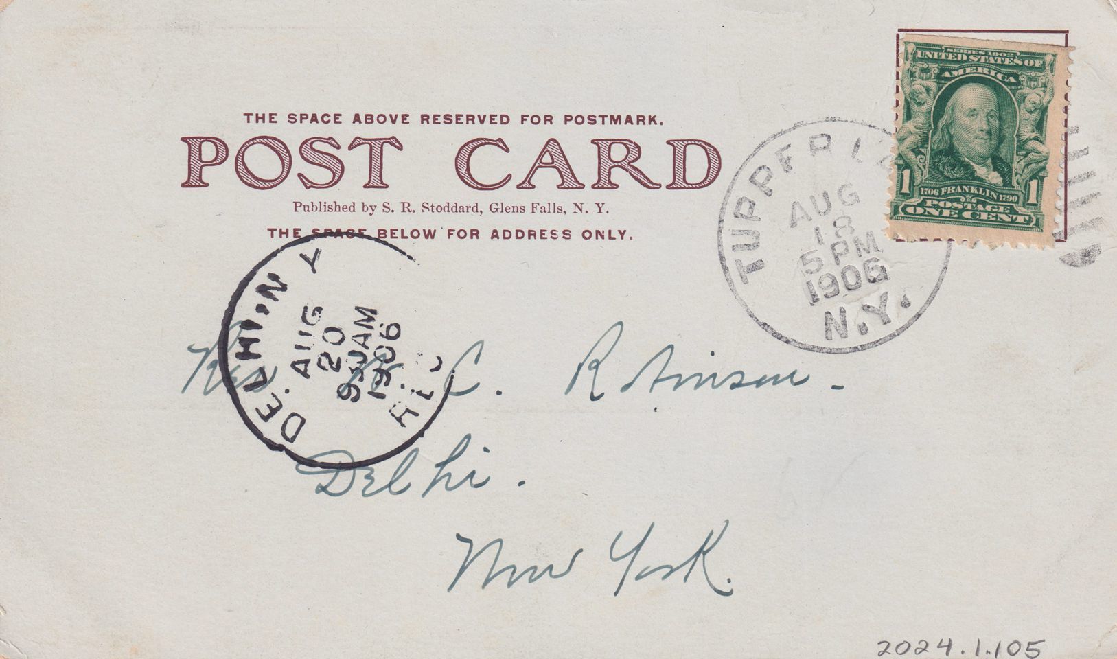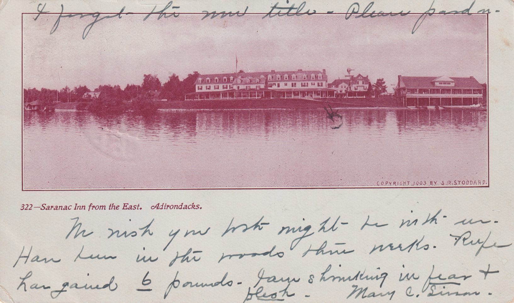 Red-toned postcard showing the Saranac Inn property from the east. Printed caption on front reads, "Saranac Inn from the East, Adirondacks." Printed by S. R. Stoddard, Glens Falls, NY. Used, undivided back, white border/space for message on front, postmarked Tupper Lake, NY, August 18, 1906. Handwritten message on front reads, "We wish you both might be with us. Have been in the woods three weeks. [?] has gained 6 pounds. I am shrinking in fear & flesh. Mary C. Simon. I forgot the new title. Please pardon." Mailed to Rev. W. C. Robinson, Delhi, New York.Subject Place
