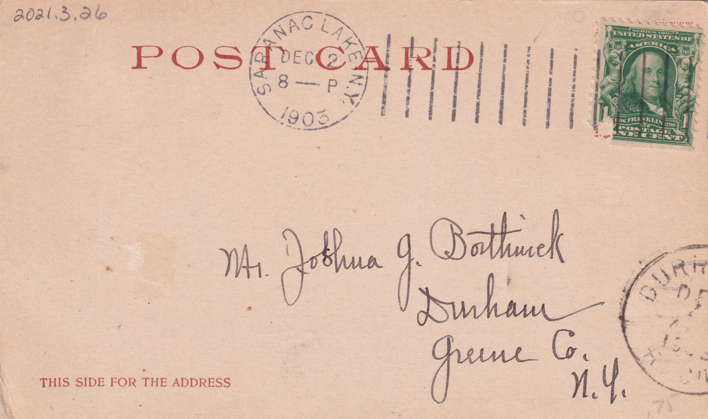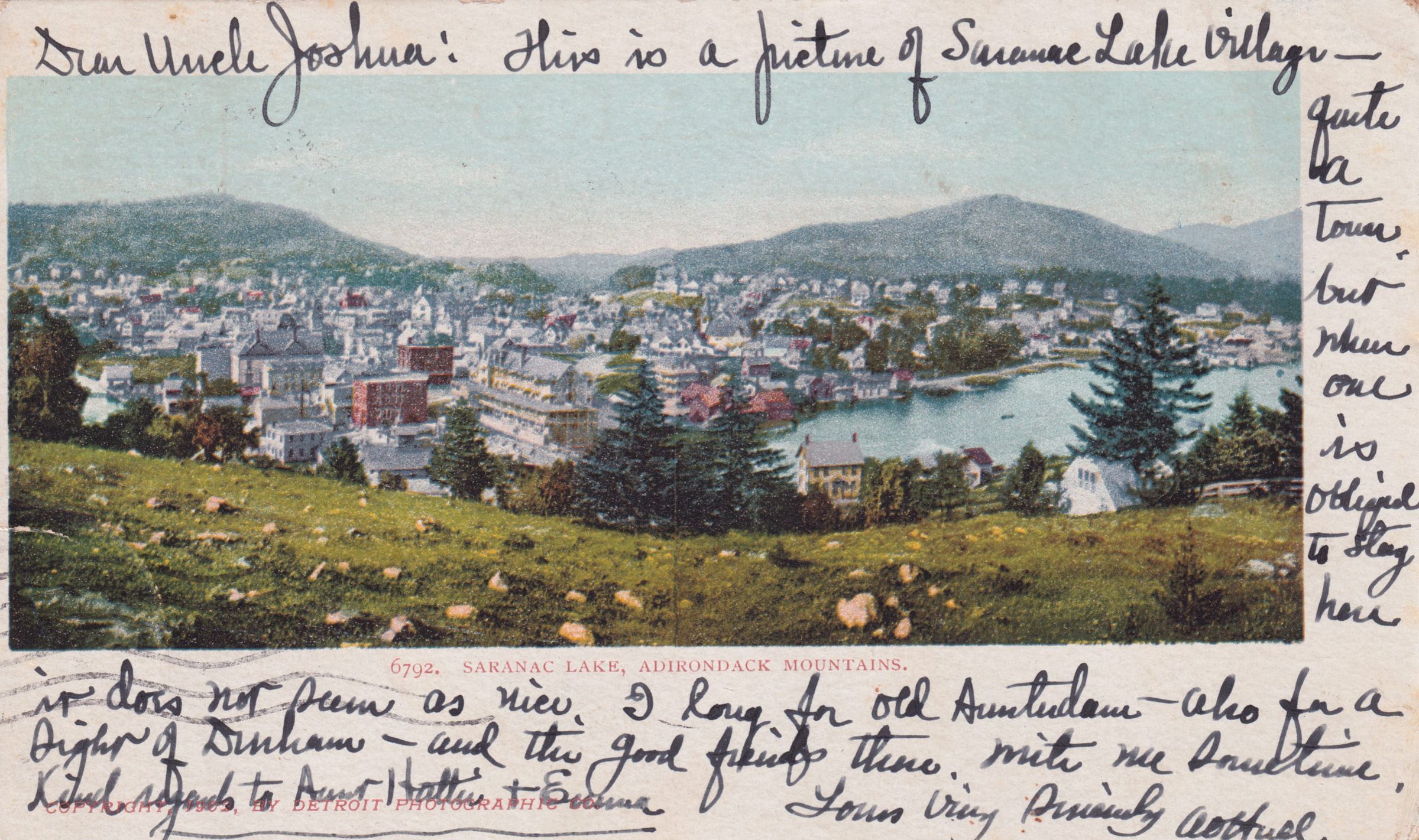 Color postcard of the village of Saranac Lake from Blood/Lake Street Hill. Used, undivided back, white border, postmarked December 2, 1903, Saranac Lake, NY. Printed by Detroit Photographic Co. Caption printed on front reads, "Saranac Lake, Adirondack Mountains." Handwritten message on front reads, "Dear Uncle Joshua: This is a picture of Saranac Lake Village. Quite a town, but when one is obliged to say here it does not seem so nice. I long for Old Amsterdam, also for a sight of Durham, and the good friends there. Write me sometime. Kind regards to Aunt Hattie and Emma. Yours very sincerely, Arthur." Mailed to Mr. Joshua G. Borthwick, Durham, Greene Co., N.Y.Subject Place