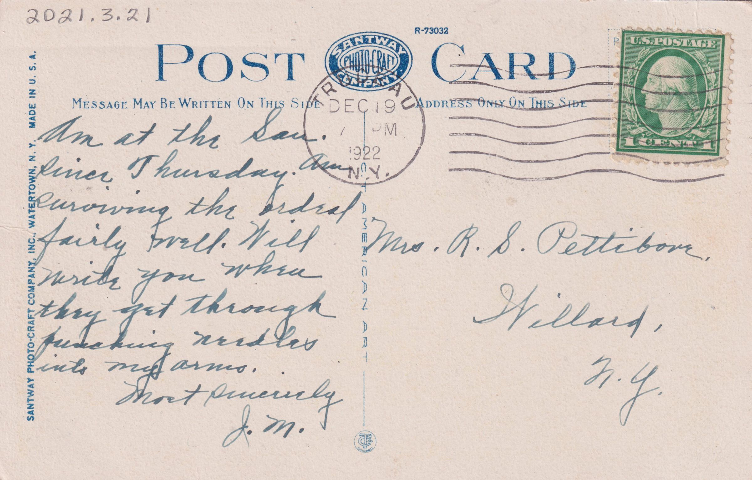 Color postcard of Lower Saranac Lake from the Algonquin Hotel. The tennis courts are visible in the foreground. Used, divided back, white border, postmarked December 19, 1922. Printed by Santway Photo - Craft Company, Inc. Watertown, NY. Caption printed on front reads, "Saranac Lake from Algonquin Hotel, Adirondacks." Handwritten message on back reads, "Am at the San since Thursday. Am surviving the ordeal fairly well. Will write you when they get through punching needles in my arms. Most sincerely, J.M." Mailed to Mrs. R. S. Pettibone, Willard, N. Y.Subject Place