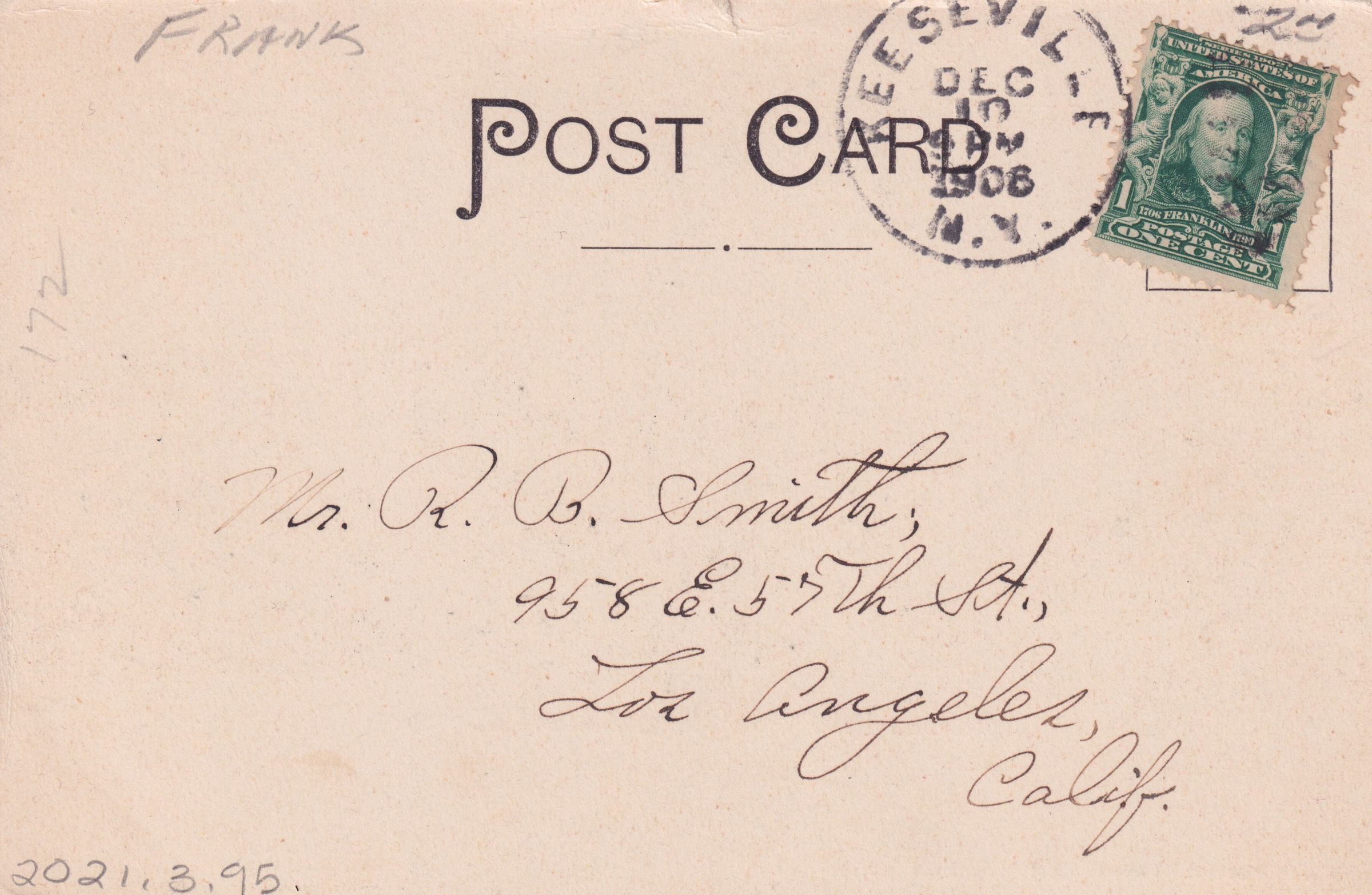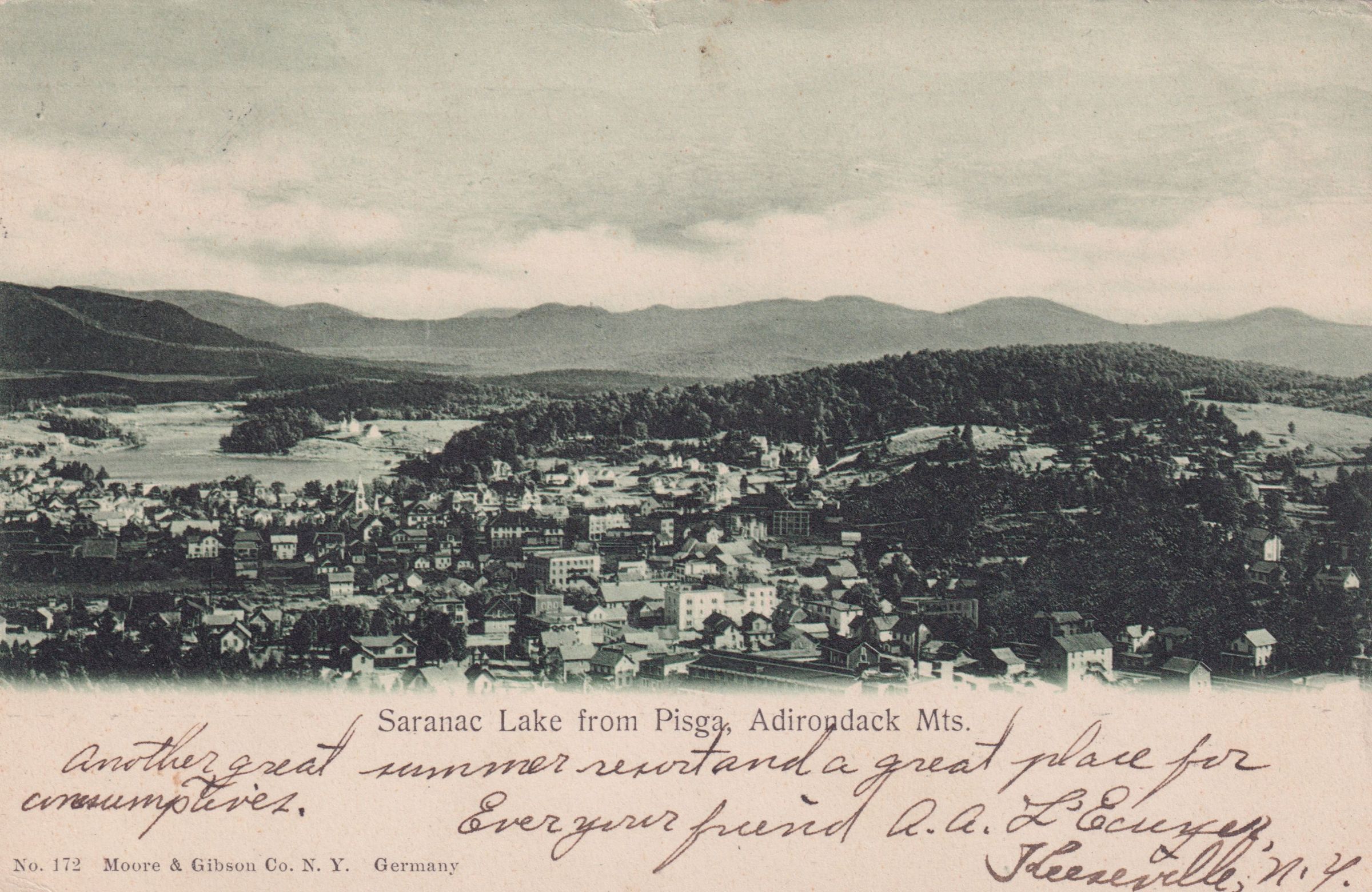 Black and white postcard showing an elevated view of Saranac Lake from Mt. Pisgah. looking south. Printed caption on front reads, "Saranac Lake from Pisga [sic], Adirondack Mts." Used, undivided back, postmarked Keeseville, NY, December 10, 1908. Printed by Moore & Gibson Co., NY. Handwritten message at bottom of front reads, "Another great summer resort and a great place for consumptives. Ever your friend, A. A. L'Ecuyer, Keeseville, N.Y." Mailed to Mr. R. B. Smith, 958 E. 57th St., Los Angeles, Calif.Subject Place