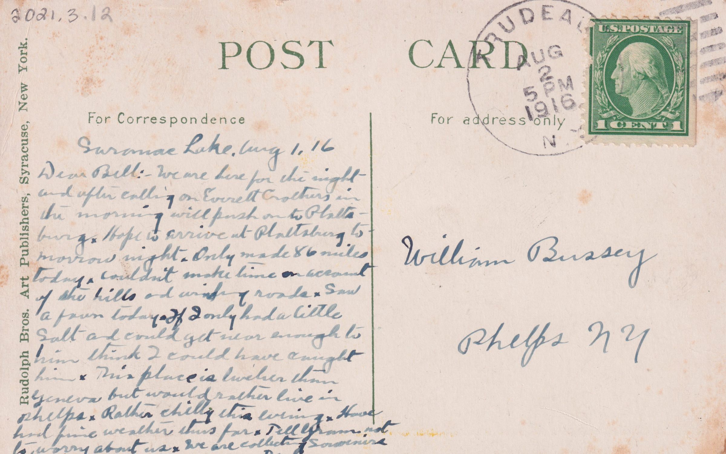 Color postcard showing a birds-eye view of Saranac Lake looking west from Lake Street hill over downtown Saranac Lake and Lake Flower. The old Harrietstown Town Hall, Riverside Inn, and other buildings are visible with mountains in the background. Used, divided back, postmarked August 2, 1916, Trudeau, NY. Published by Rudolph Bros. Art Publishers, Syracuse, New York. Caption printed on front reads, "Saranac Lake in the Adirondacks, N. Y." Handwritten message on the back reads, "Saranac Lake, Aug 1, 1916. Dear Bill: We are here for the night and after calling on Everett Crothers in the morning will push on to Plattsburg. Hope to arrive at Plattsburg tomorrow night. Only made 86 miles today. Couldn't make time on account of the hills and winding roads. Saw a fawn today. If I only had a little salt and could get near enough to him think I could have caught him. This place is livelier than Geneva but would rather live in Phelps. Rather chilly this evening. Have had fine weather thus far. Tell Gram not to worry about us. We are collecting souvenirs for you. Dad"Subject Place