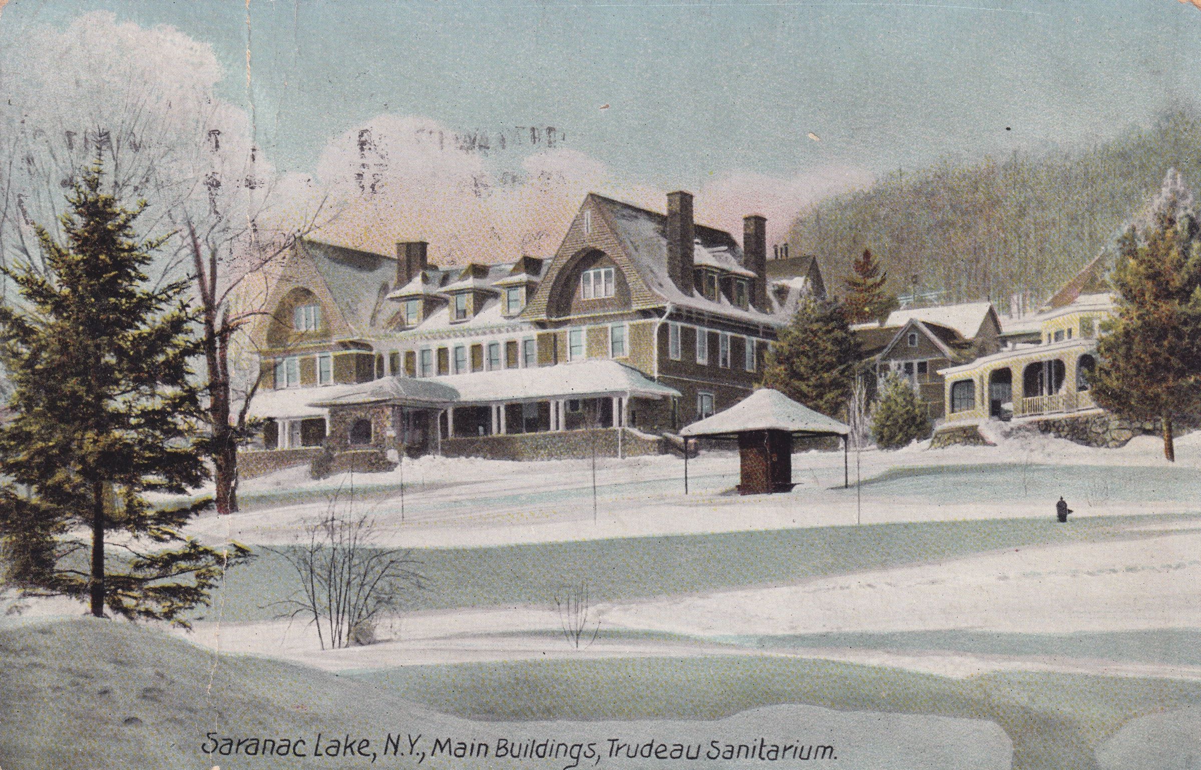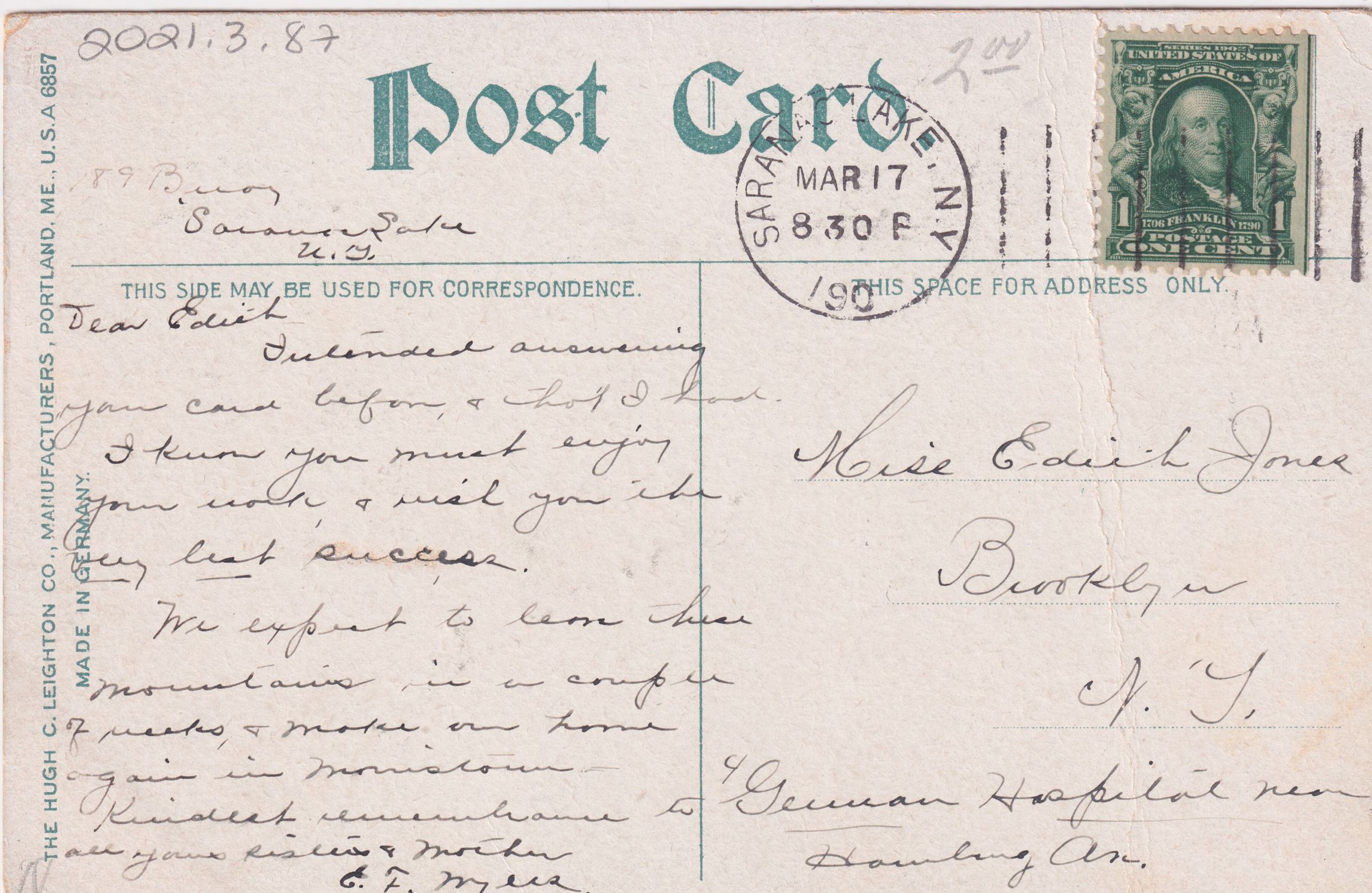 Color postcard showing the Administration/Main Building [later Dodd Hall] at Trudeau Sanatorium in the snow. Printed caption on front reads, "Saranac Lake, N.Y., Main Buildings, Trudeau Sanitarium [sic]." Used, divided back, postmarked Saranac Lake, March 17, 190[?]. Printed by the Hugh C. Leighton Co., Manufacturers, Portland, ME. Handwritten message on reverse reads, "Dear Edith, Intended answering your card before and that I did. I know you must enjoy your work and wish you the very best success. We expect to leave these mountains in a couple of weeks, and make our home again in Morristown. Kindest remembrance to your sister and mother. E. F. Myers." Mailed to Miss Edith Jones, Brooklyn, NY, German Hospital near Howling [?] Ave.Subject Place