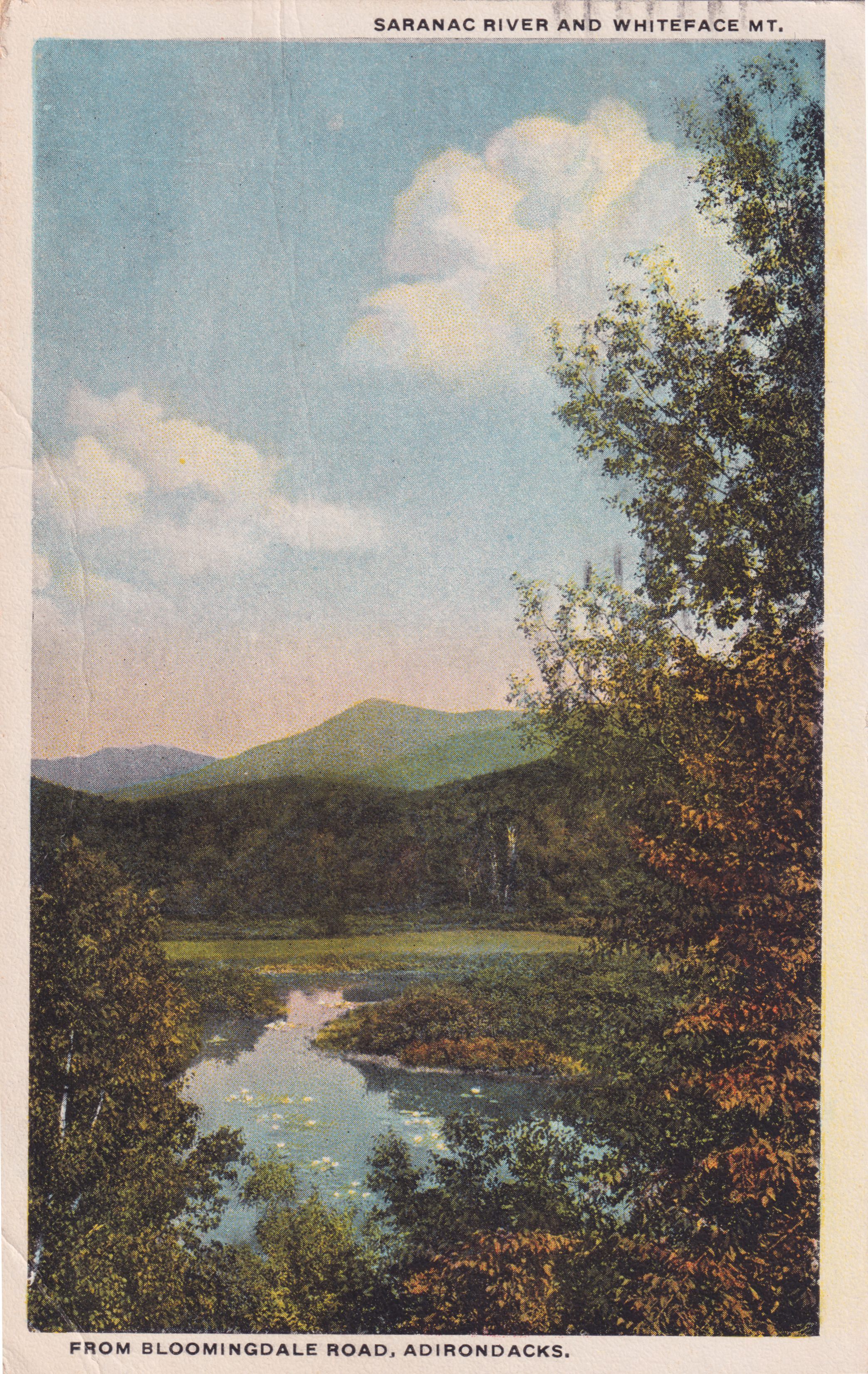 Color postcard of the Saranac River with Whiteface in the background. Used, divided back, white border, postmarked January 27, 1923. Printed by Santway Photo - Craft Company, Inc. Watertown, NY. Caption printed on front reads, "Saranac River and Whiteface Mt. from Bloomingdale Road, Adirondacks." Handwritten message on back reads, "Dear Mrs. Pettibone, I suppose Miss M told you I left the San Dec. 30 and am now at 33 Algonquin Ave and am feeling fine. Suppose you are looking forward to your southern trip and know you will enjoy it down there away from snow and cold weather. I am very tired of it and am just looking forward to going home but don't dare to now the weather is so bad there and my friends are all sick. J. Melville." Mailed to Mrs. Alice Pettibone, Willard Hospital, Willard, N.Y.Subject Place