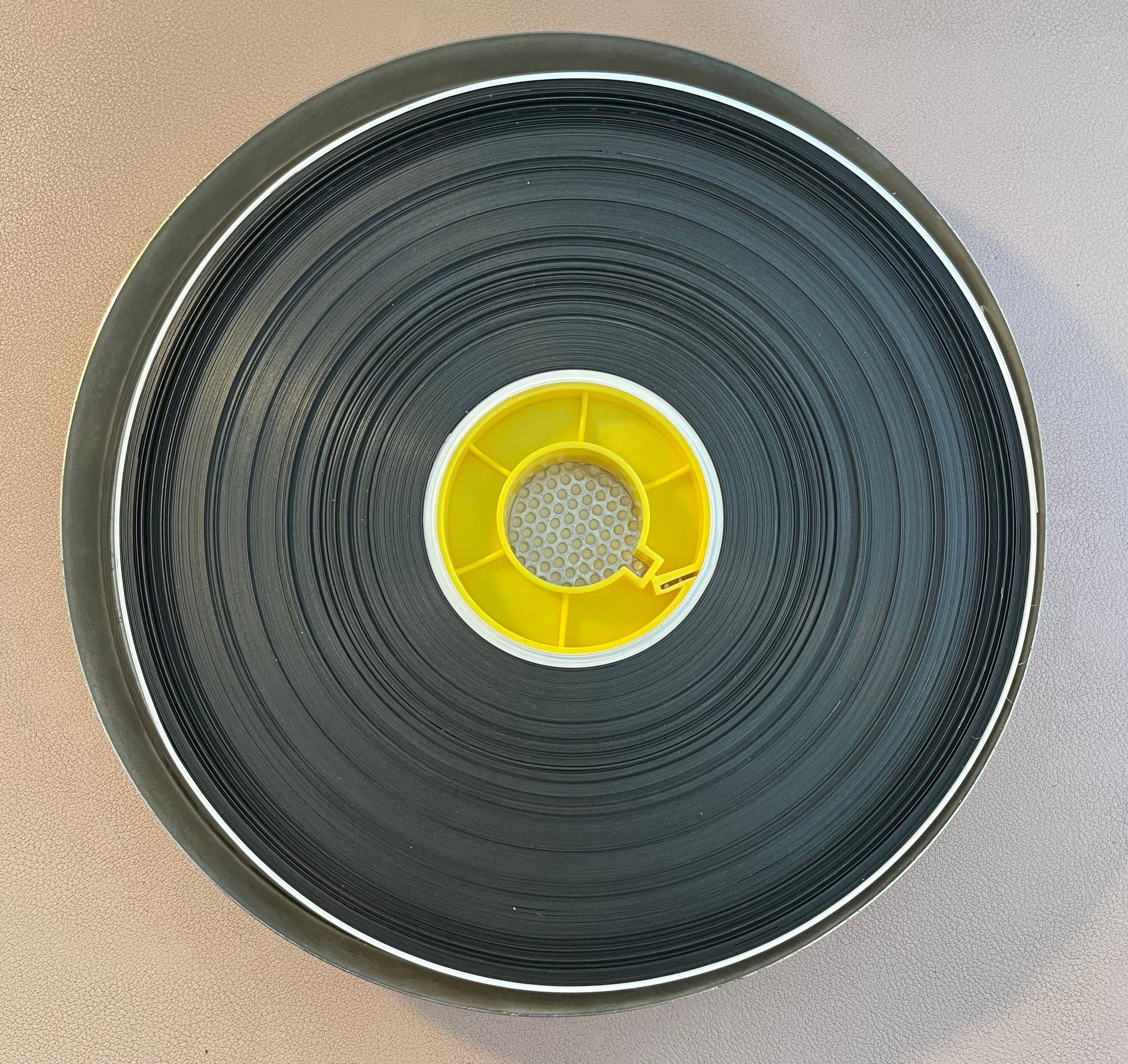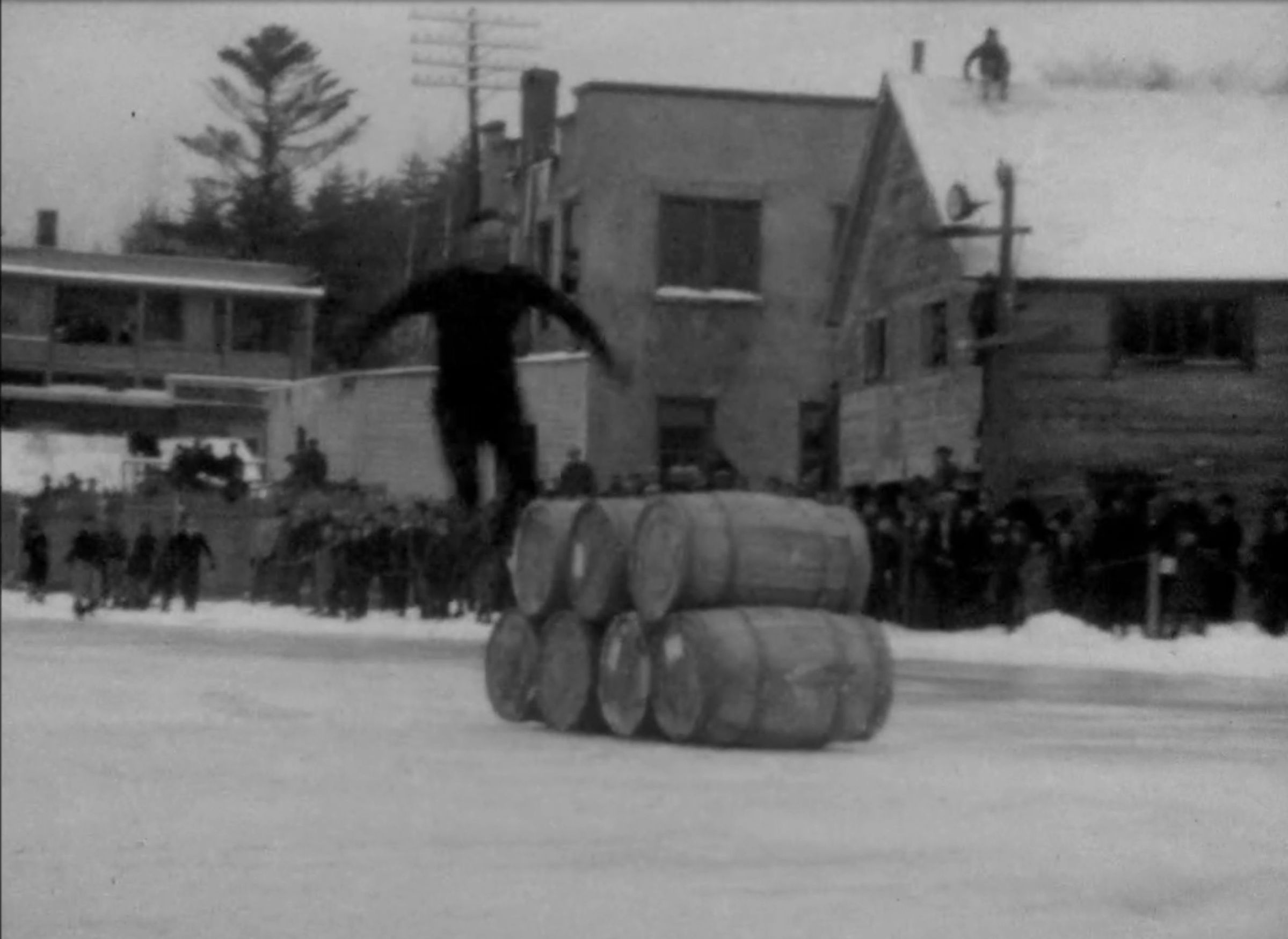 16mm film reel with label, "Skating, skiing, racing, daddy fishing." Recorded by family of Robert H. Baker in the early 1920s. Contains scenes of winter sporting events at Pontiac Bay, likely during Winter Carnival, including Ed Lamy jumping barrels. Also includes footage of children skiing and fishing, and track races.