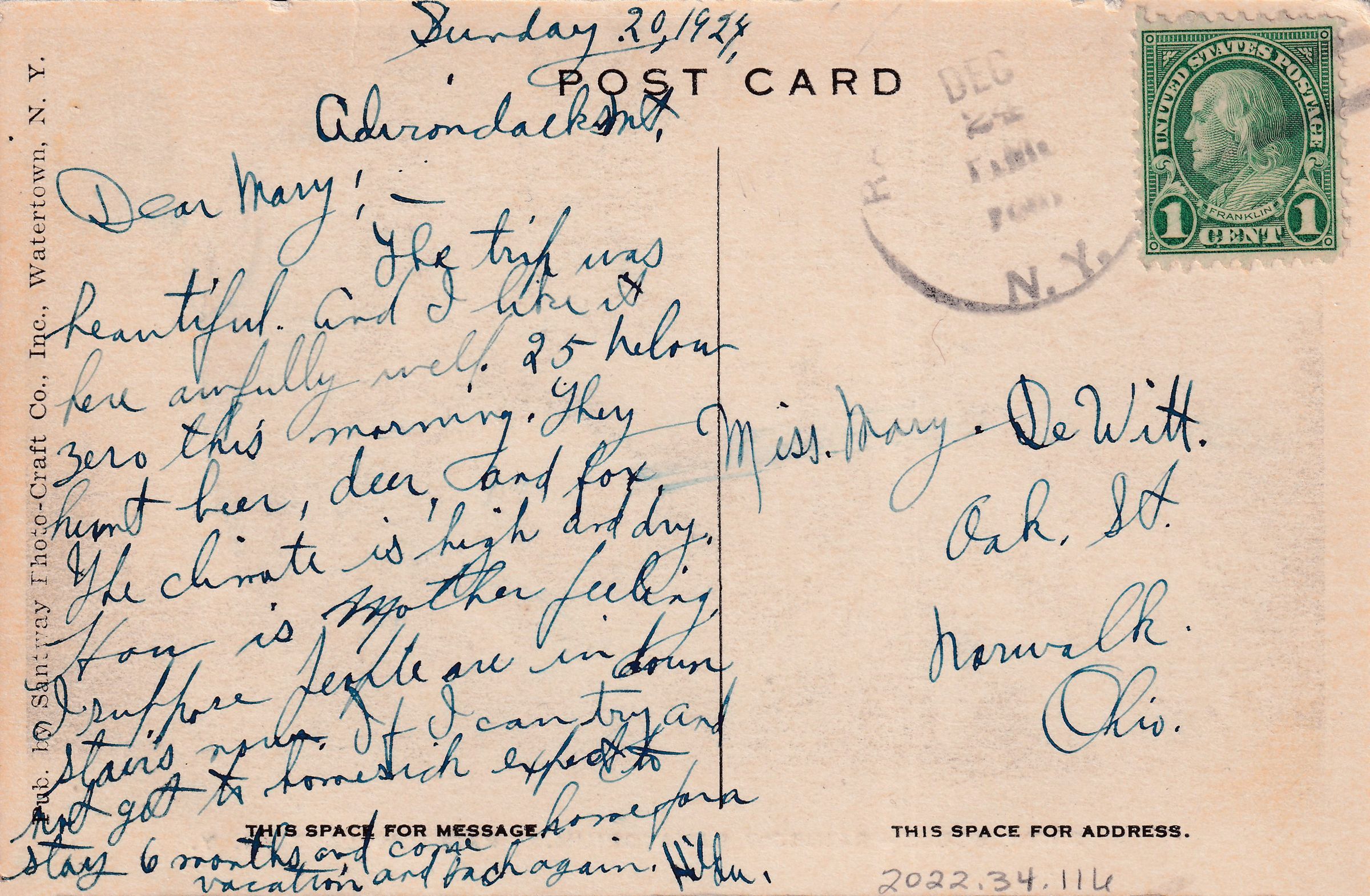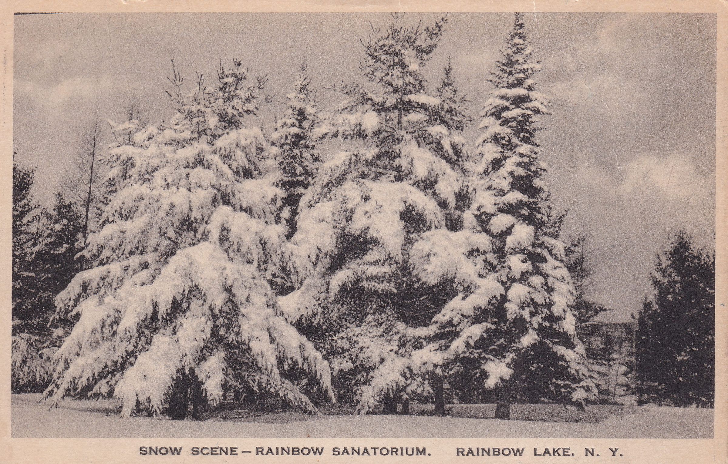 Black and white postcard showing snow-covered trees. Printed caption on front reads, "Snow Scene--Rainbow Sanatorium. Rainbow Lake, N. Y." Printed by the Santway Photo-Craft Co., Inc., Watertown, NY. Used, divided back, white border, postmarked [location illegible] December 24, 1924. Handwritten message on back reads, "Adirondacks Mt. Dear Mary:-- The trip was beautiful. And I like it here awfully well. 25 below zero this morning. They hunt bear, deer, and fox. The climate is high and dry. How is mother feeling. I suppose people are in downstairs now. If I can try and not get to homesick expect to stay 6 months and come home for a vacation and back again. Hilda." Mailed to Miss Mary DeWitt, Oak St., Norwalk, Ohio.Subject Place