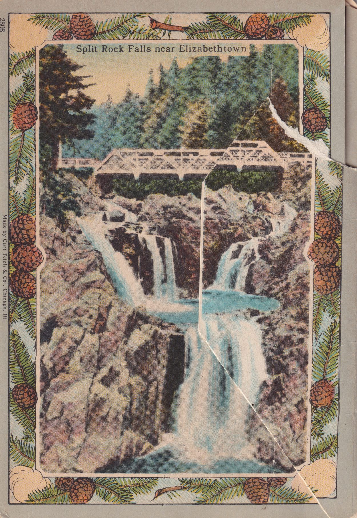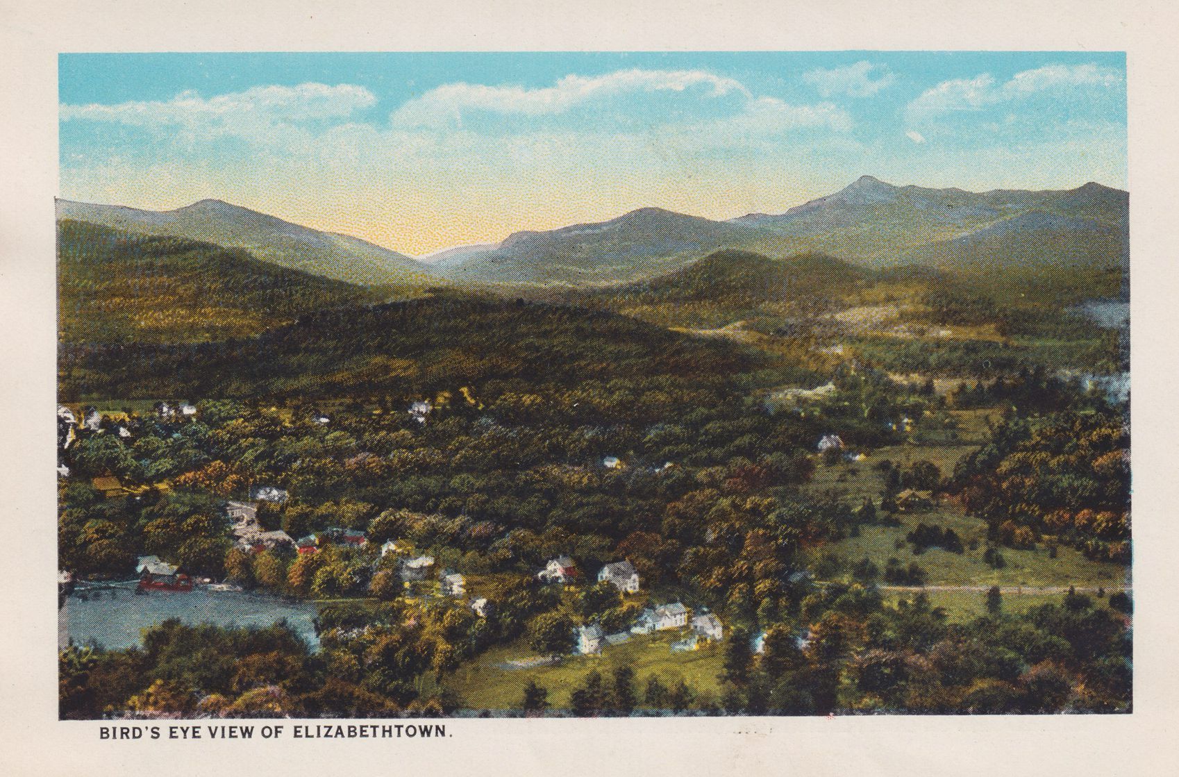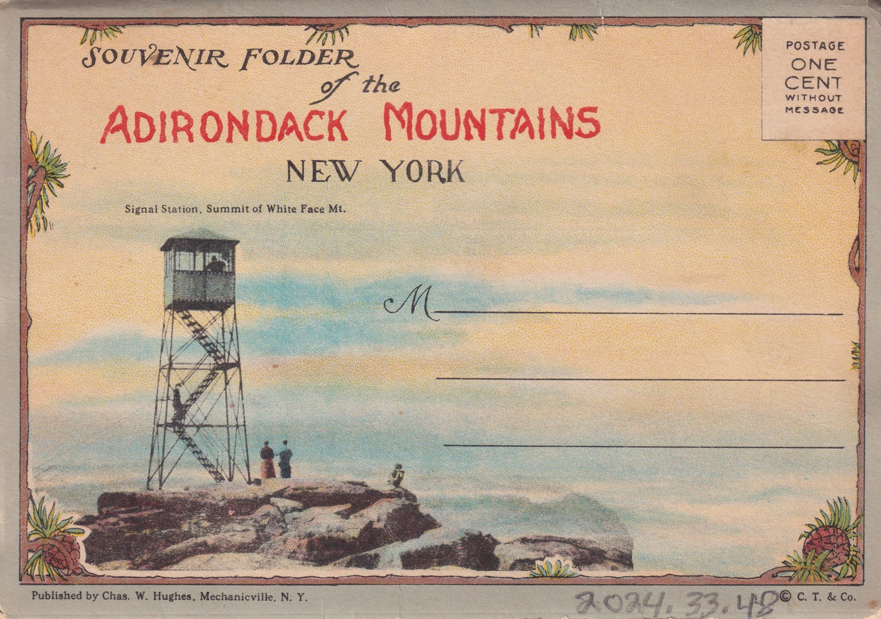 Color postcard folder with 16 accordion-folded images of communities and locations in the Adirondacks. Cover envelope has image of the Signal Station at the summit of Whiteface Mountain, and Split Rock Falls near Elizabethtown. Published by Chas. W. Hughes, Mechanicville, N.Y., printed by Curt Teich & Co., Chicago, IL.