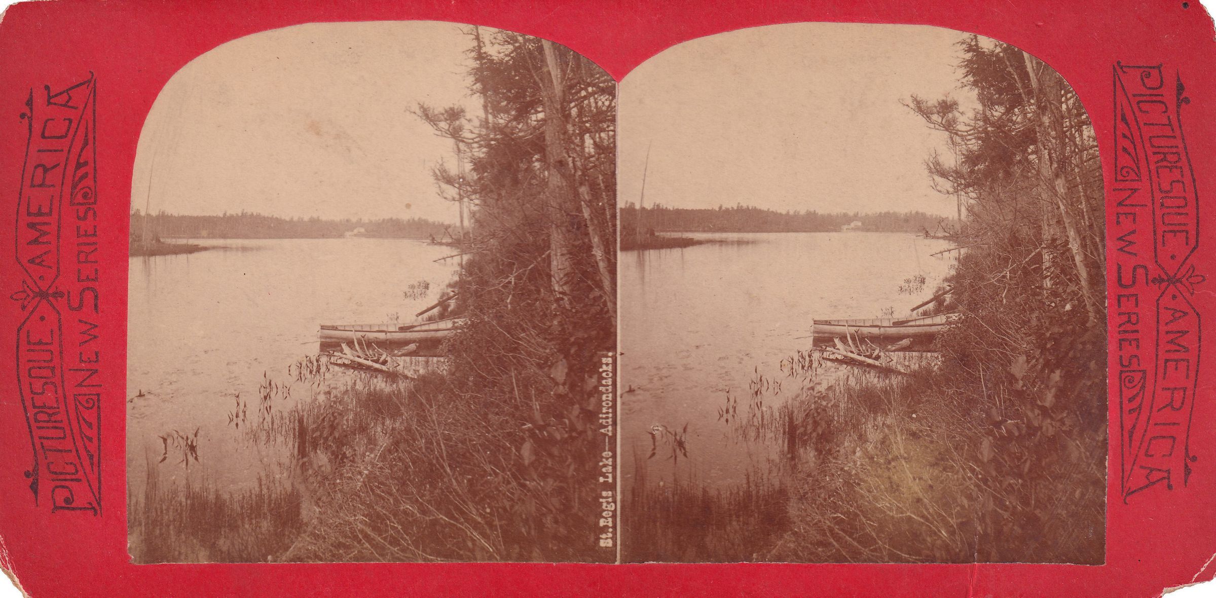 Black-and-white stereoview showing a guideboat along a wooded lakeshore. A building can be seen on the far shore. Printed caption on image reads, "St. Regis Lake--Adirondacks." Mounted on orange cardboard backing with "Picturesque America, New Series," printed up the sides.Photograph Details