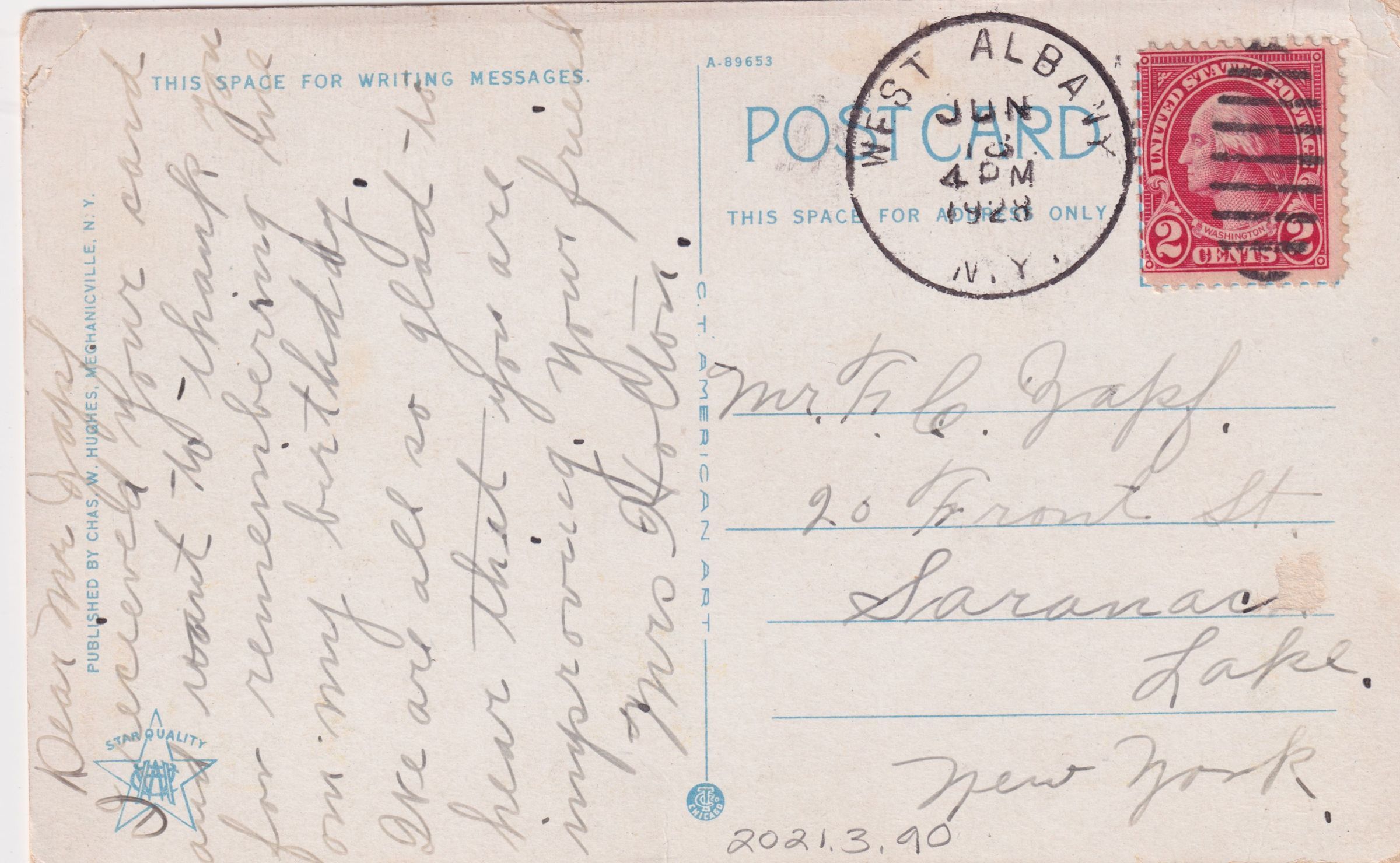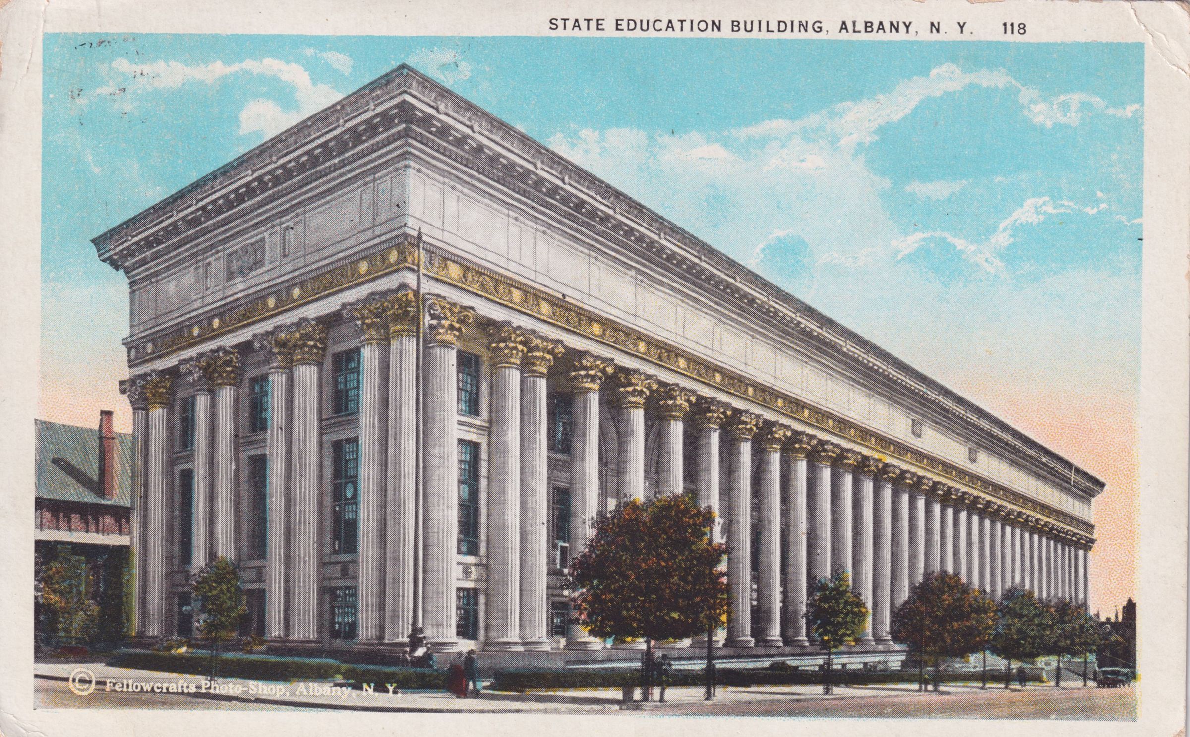 Color postcard showing the State Education Building in Albany, NY. Printed caption reads, "State Education Building, Albany, N.Y." Used, divided back, white border, postmarked West Albany, June 18, 1928. Printed by Charles W. Hughes, Mechanicville, NY. Handwritten message on reverse reads, "Dear Mr. Zapf, I received your card and want to thank you for remembering me on my birthday. We are all so glad to hear that you are improving. Your friend, Mrs. Holton." Mailed to Mr. F. C. Zapf, 20 Front St., Saranac Lake, NY.Subject Place