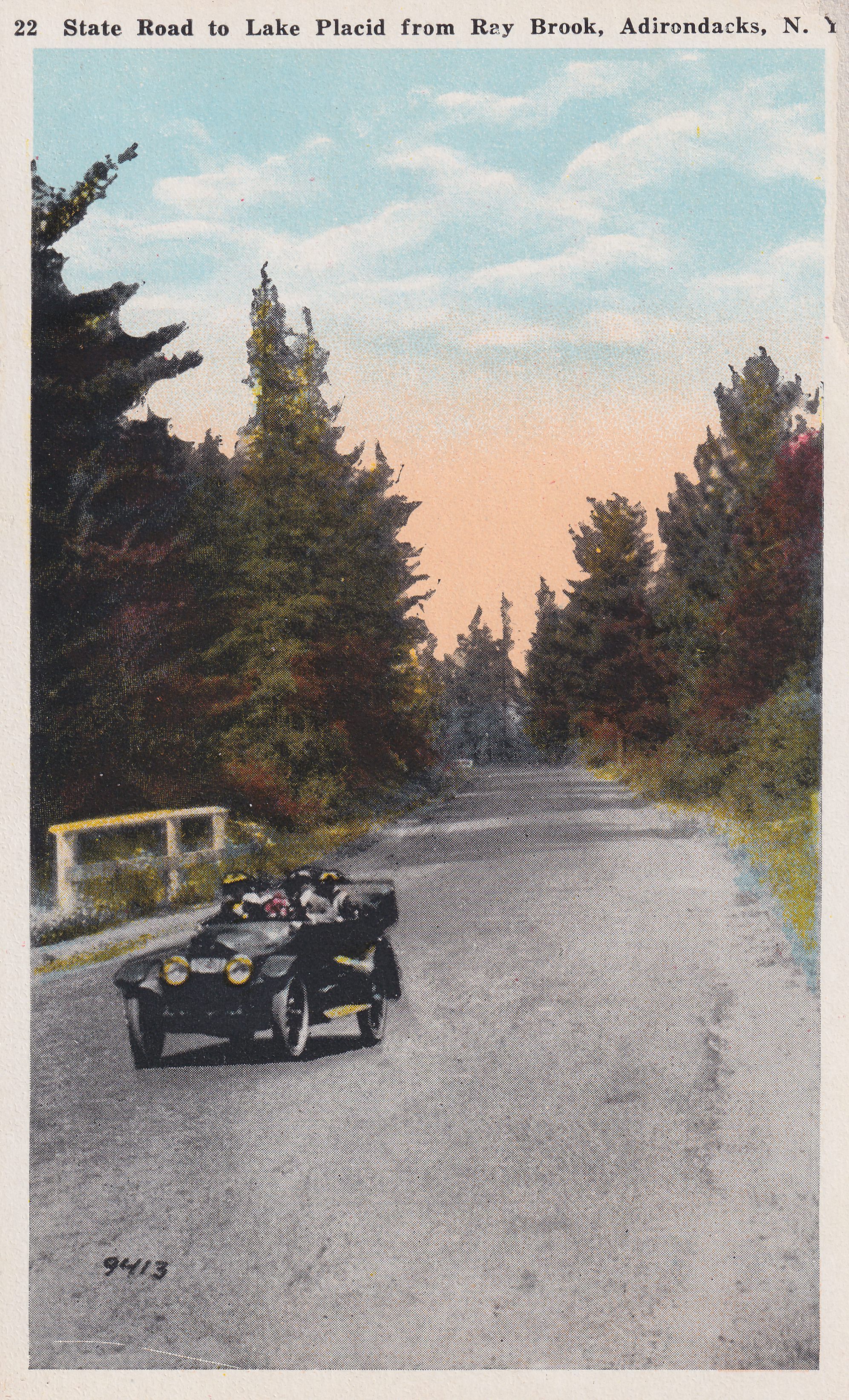 Color postcard showing an early model car driving down a road. Printed caption on front reads, "State Road to Lake Placid from Ray Brook, Adirondacks, N. Y." No printer's mark. Unused, divided back, white border.Subject Place