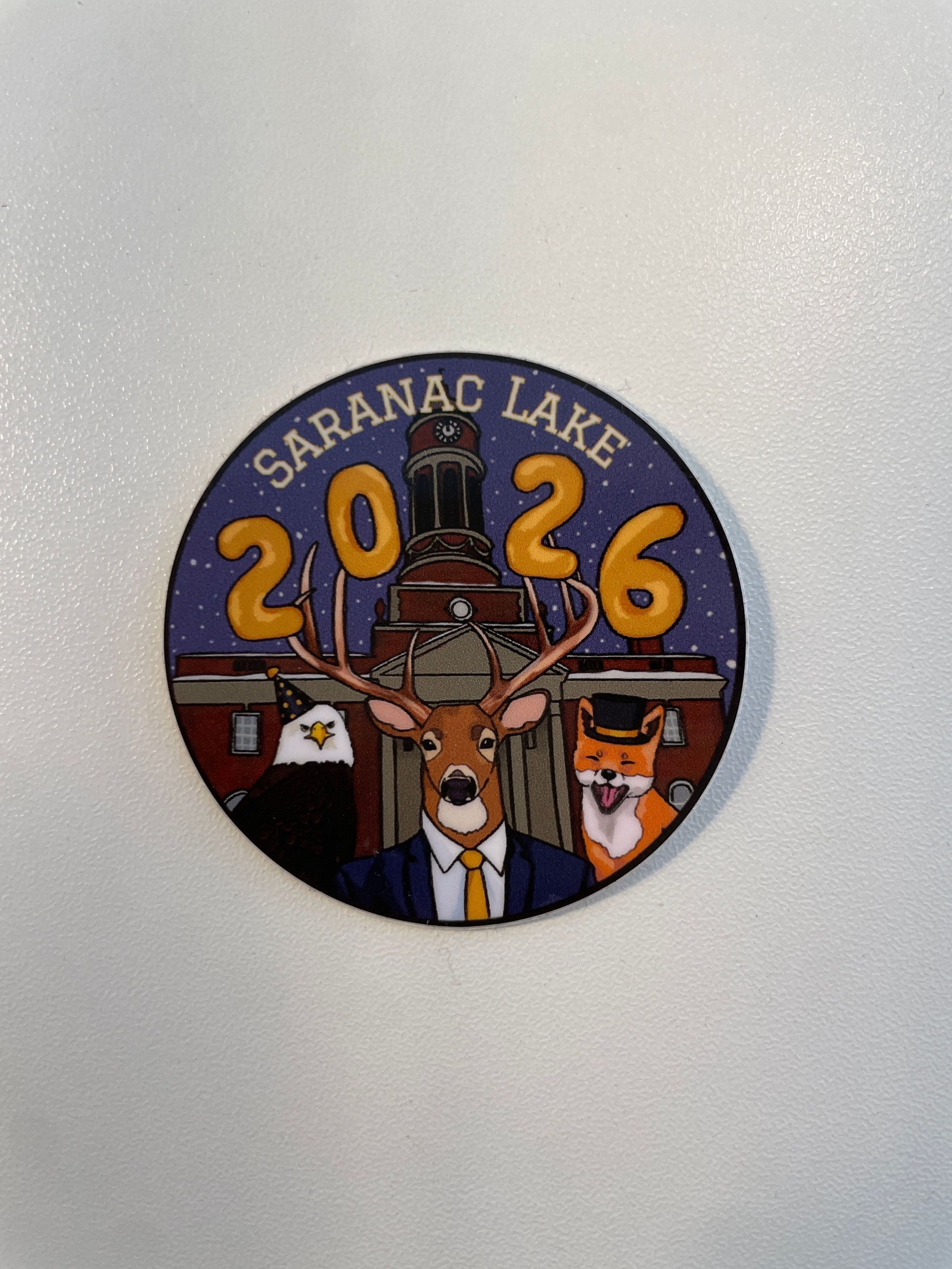 Sticker from the 2026 North Country New Year celebration. Features illustration of an eagle, deer, and fox in front of Harrietstown Town Hall.