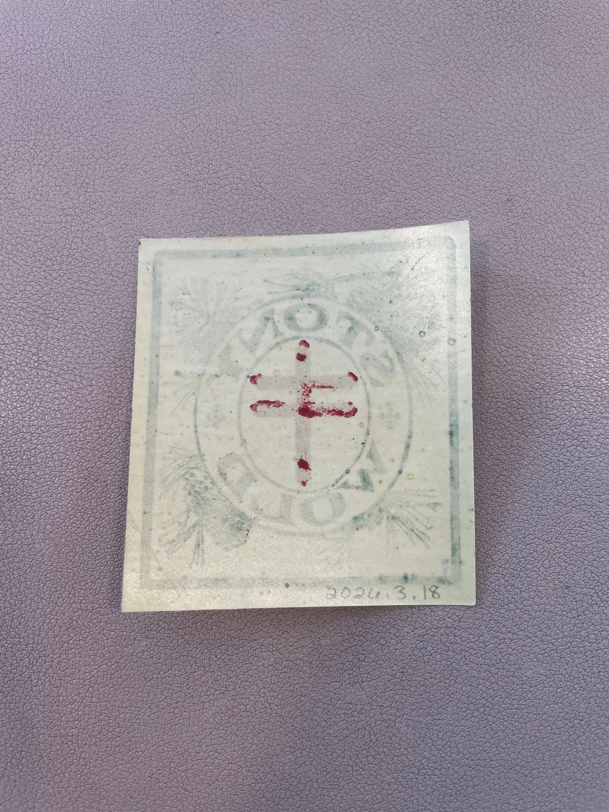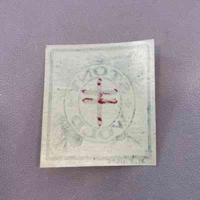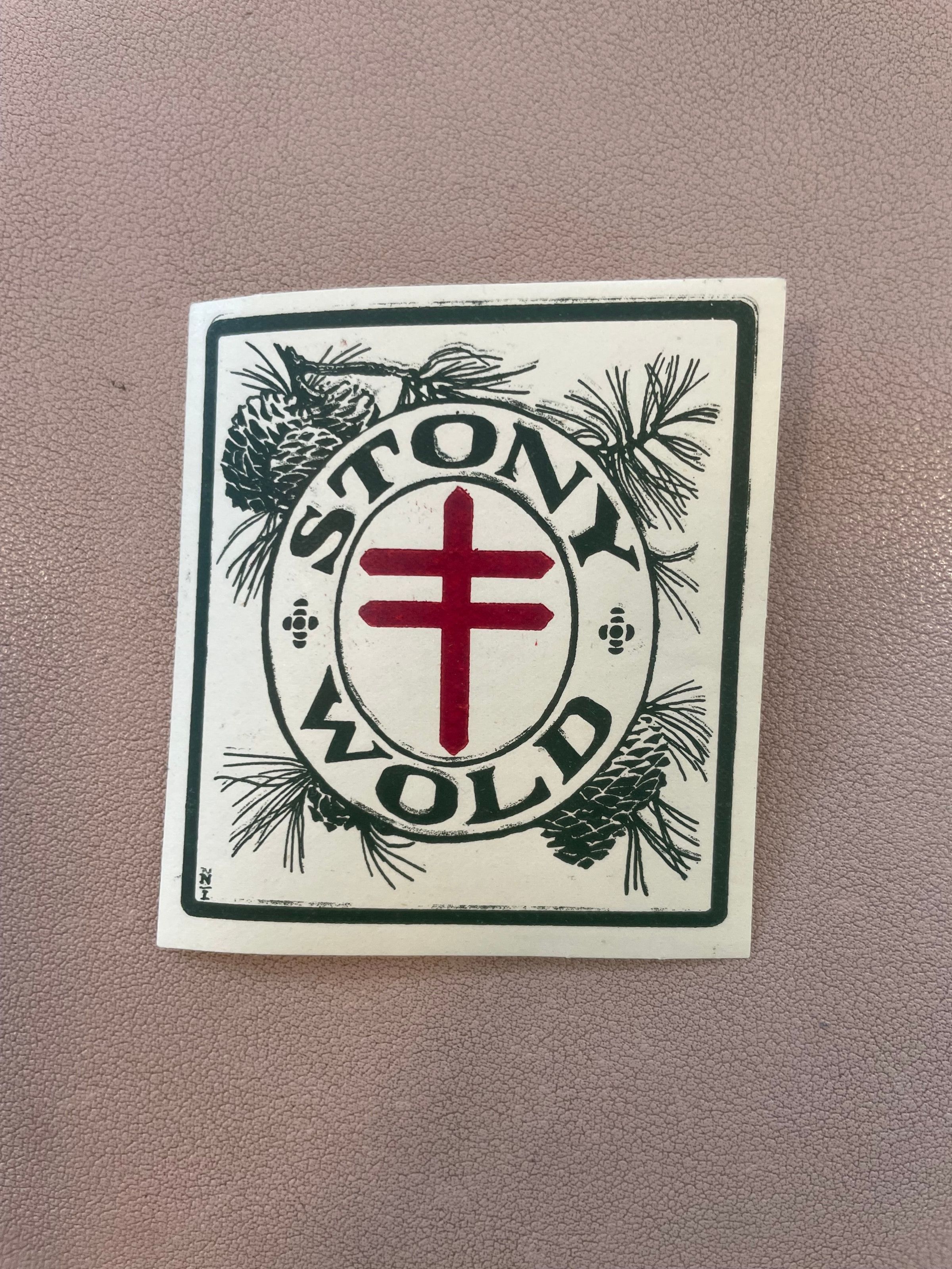 Large gummed stamp with illustration of pine needles and cones, and a red double-barred cross. "Stony Wold" is printed in the circle around the cross.