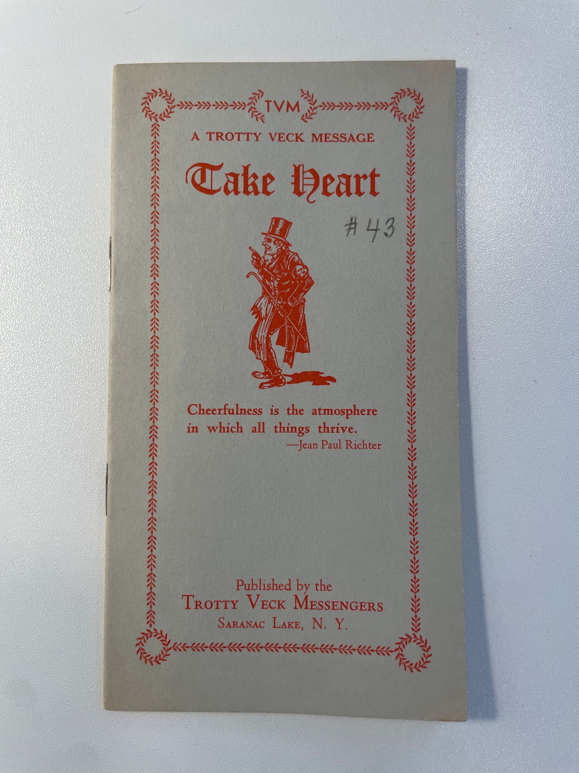 Trotty Veck Message: Take Heart. Printed in 1954. Handwritten note on front reads, "#43." Physical Description: Softcover. 3.25" w x 6" h. Light grey cover with orange ink.