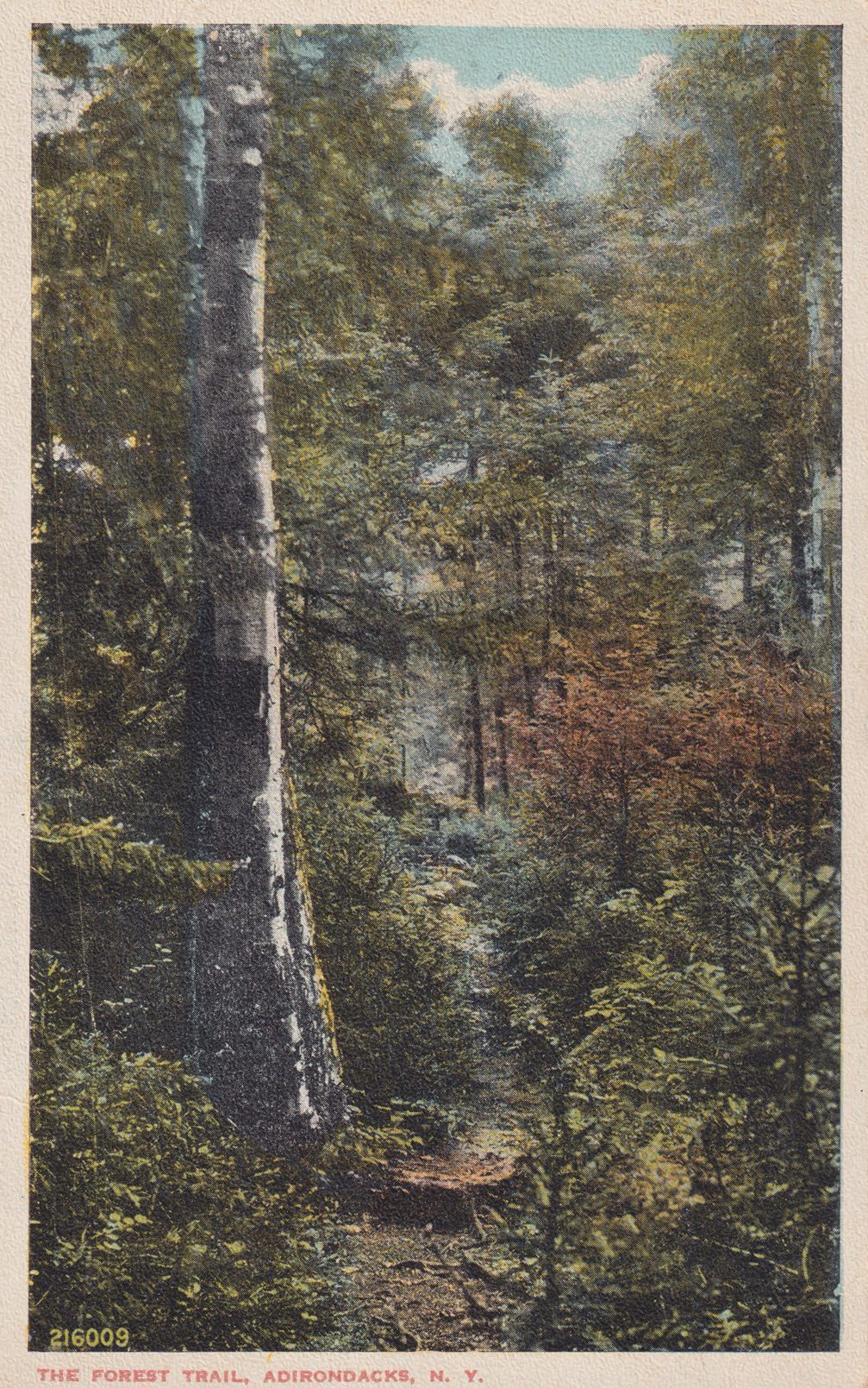 Color postcard showing a path through the woods. Printed caption on front reads, "The Forest Trail, Adirondacks, N.Y." No printer's mark. Unused, divided back, white border.Subject Place
