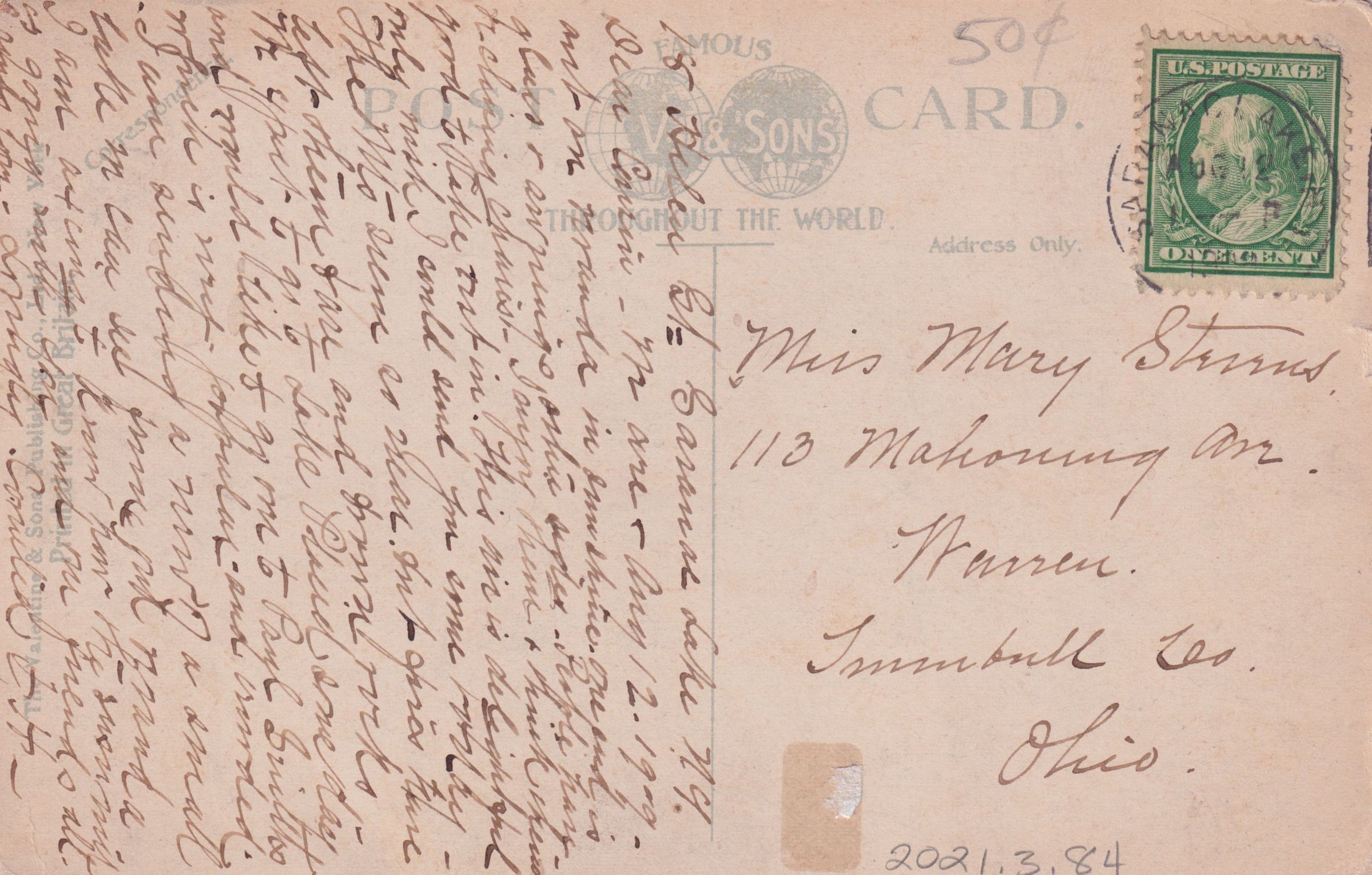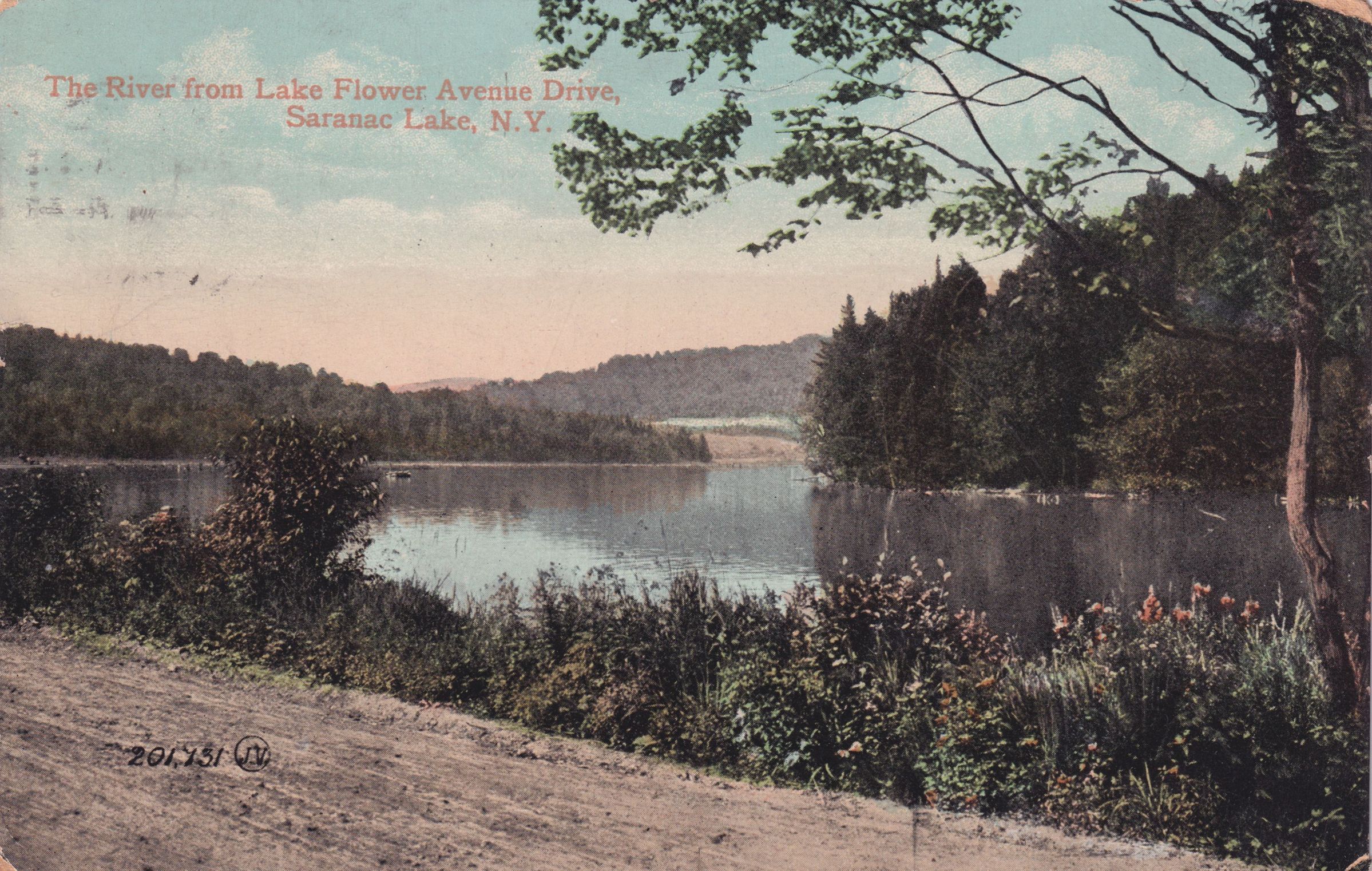 Color postcard showing a dirt road alongside a tree-lined river. Printed caption on the front reads, "The River from Lake Flower Avenue Drive, Saranac Lake, N.Y." Used, divided back, postmarked August 12, rest illegible. The Valentine & Sons Publishing Co. Ltd. New York. Handwritten message on the back reads, "18 Helen St, Saranac Lake, NY. Dear Cousin, August 12, 1909 We are out on veranda in sunshine. One end is glass and awnings on the sides. People have reclining chairs. I enjoy them and think them good to take rest in. This air is delightful and only wish I could send you some today. The mts seem so near but [?] time left them so bare and brown rocks. We expect to go to Lake Placid some day and would like to go over to Paul Smiths which is very popular and crowded. I am sending a view of a small lake we can see from our veranda. I am anxious to know how the summer is going with you and our friends all. [?] sends love. Lovingly, Cornelia H.H. " Mailed to Miss Mary Stevens, 113 Mahoning Ave., Warren, Trumbull Co., OhioSubject Place