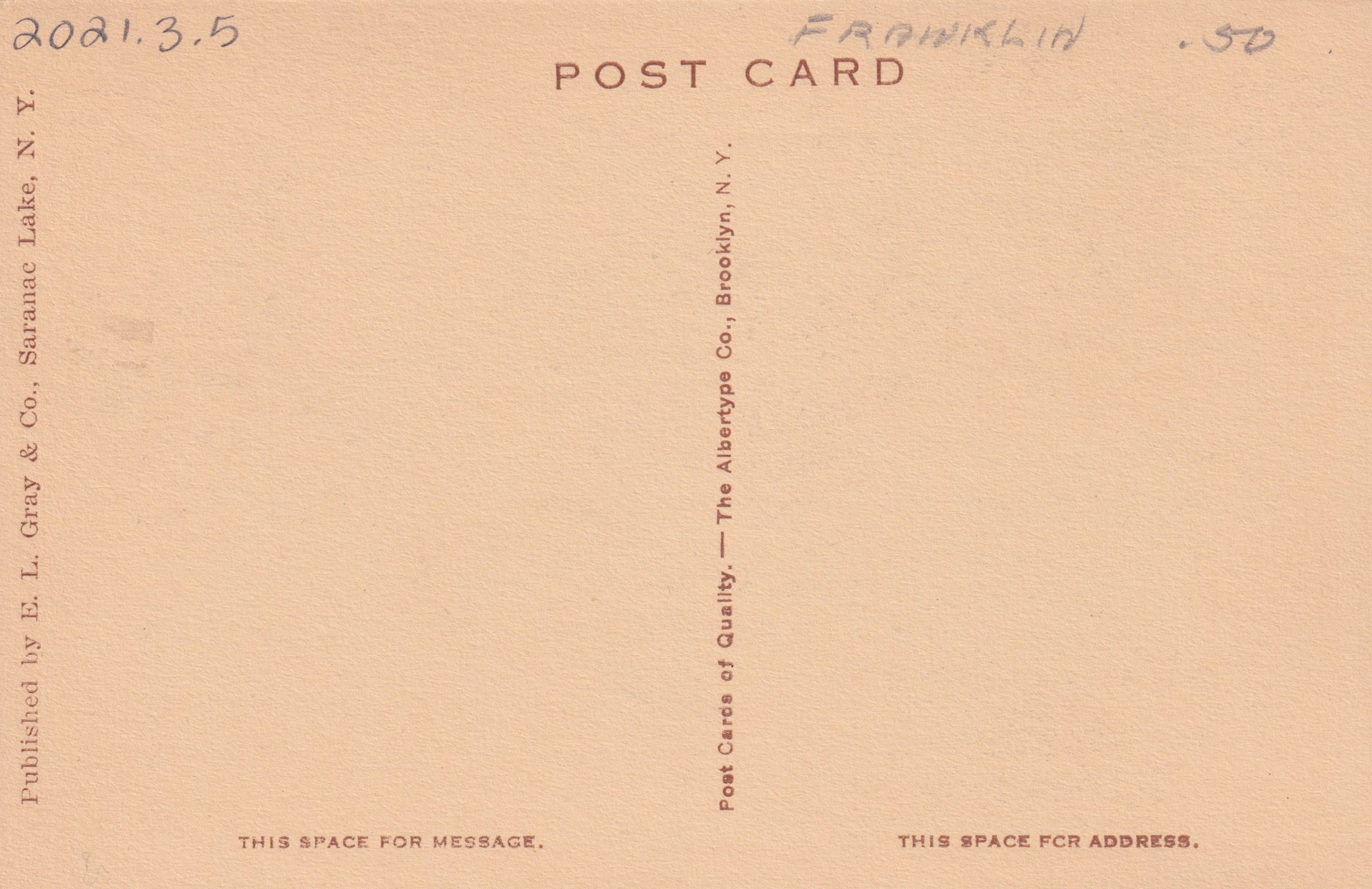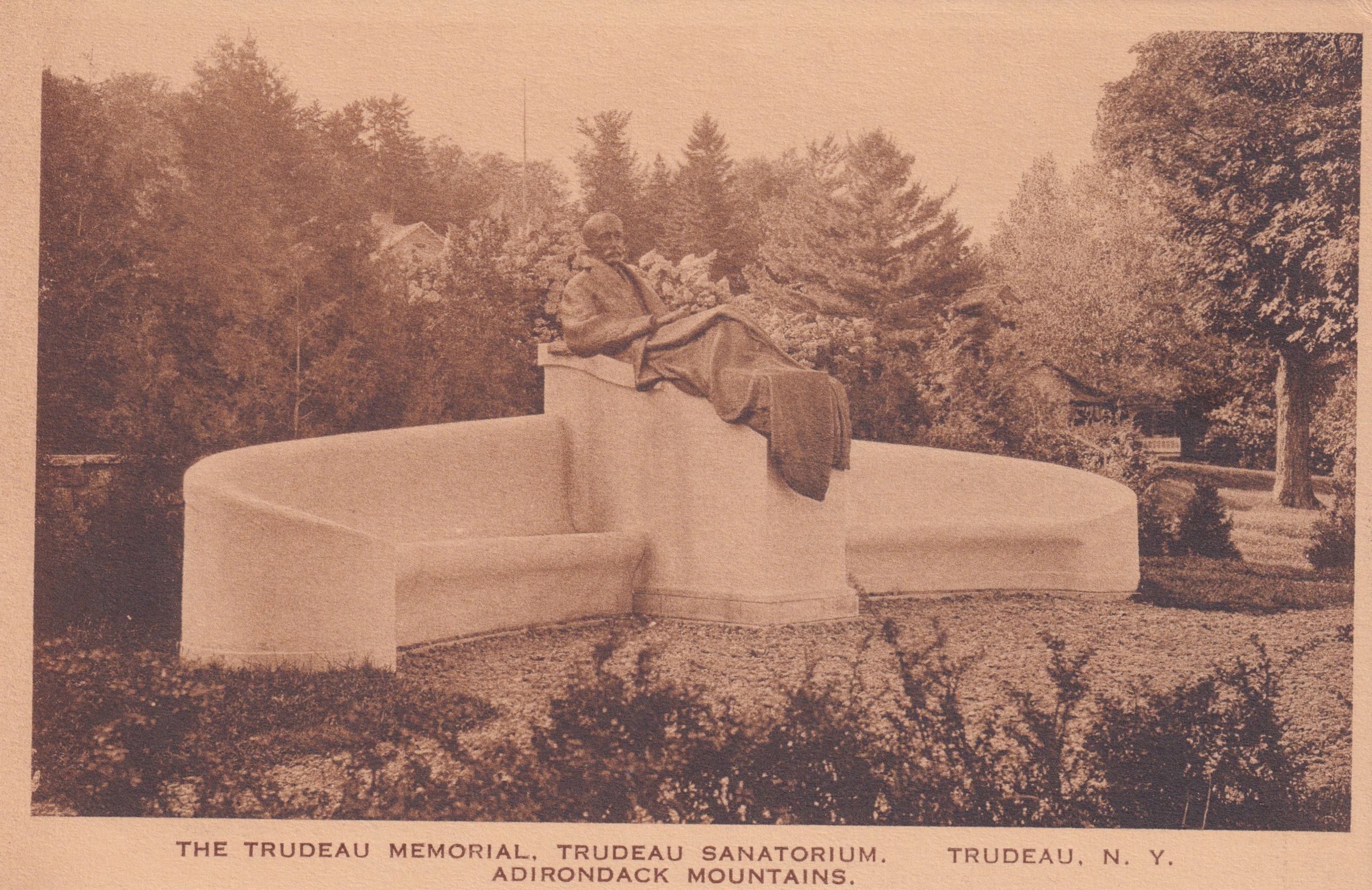 Sepia-toned postcard of the Trudeau Memorial Statue at Trudeau Sanatorium. Unused, divided back. Published by E. L. Gray & Co., Saranac Lake, N. Y. Caption on front reads, "The Trudeau Memorial, Trudeau Sanatorium, Adirondack Mountains. Trudeau, N.Y."Subject Person/Organization