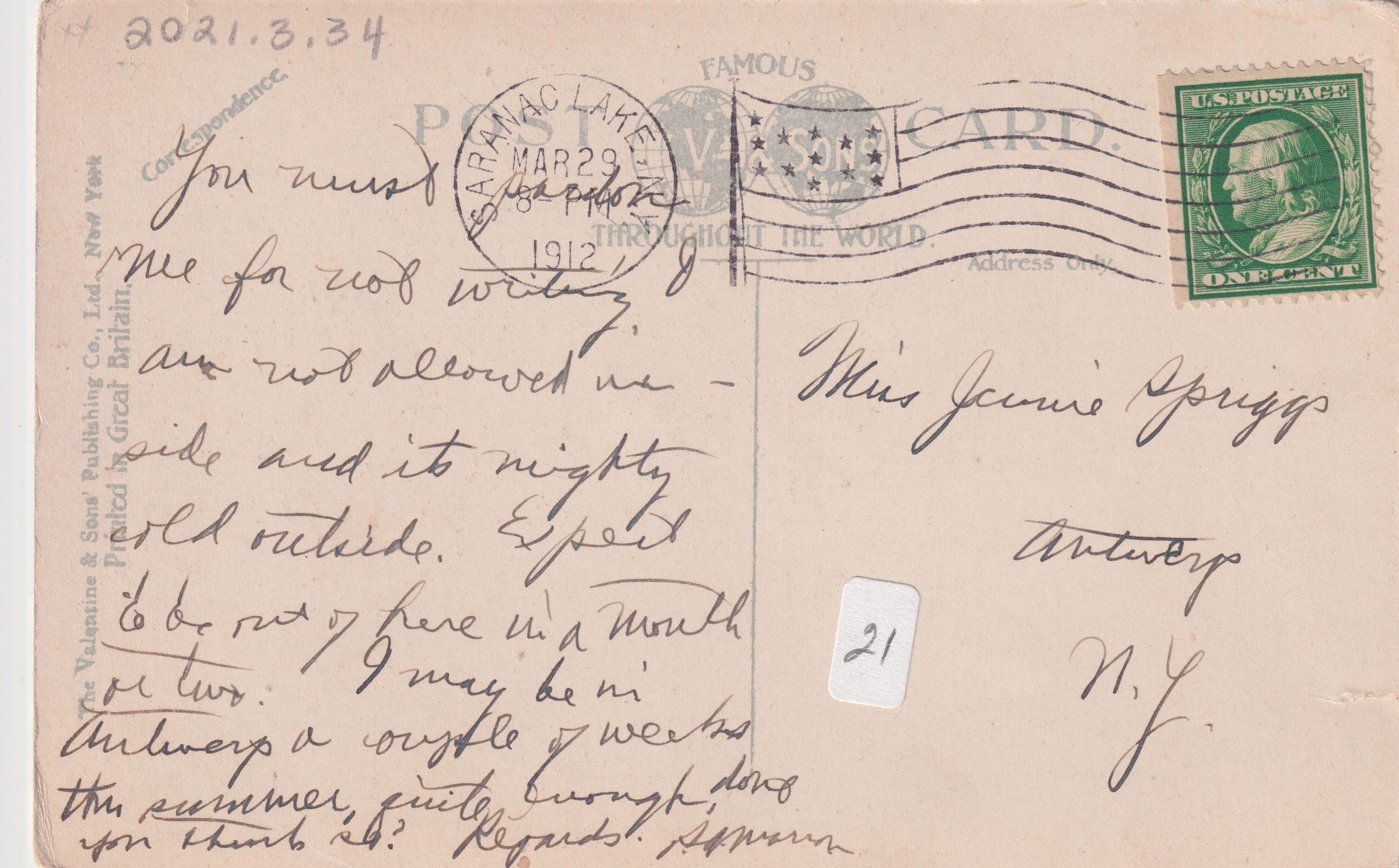 Color postcard showing the view across Lake Flower looking west. Houses and buildings in town are visible across the lake, including the Harrietstown Town Hall. Used, divided back, postmarked March 29, 1912, Saranac Lake, NY. Printed by the Valentine & Sons Publishing Co. Ltd., New York. Caption printed on front of card reads, "the Village from Lake Flower Avenue Drive, Saranac Lake, N.Y." Handwritten message on back reads, "You must pardon me for not writing. I am not allowed inside and it's mighty cold outside. Expect to be out of here in a month or two. I may be in Antwerp a couple of weeks this summer. Quite enough, don't you think so? Regards, [illegible name]." Mailed to Miss Jeanie Spriggs, Antwerp, N.Y.Subject Place