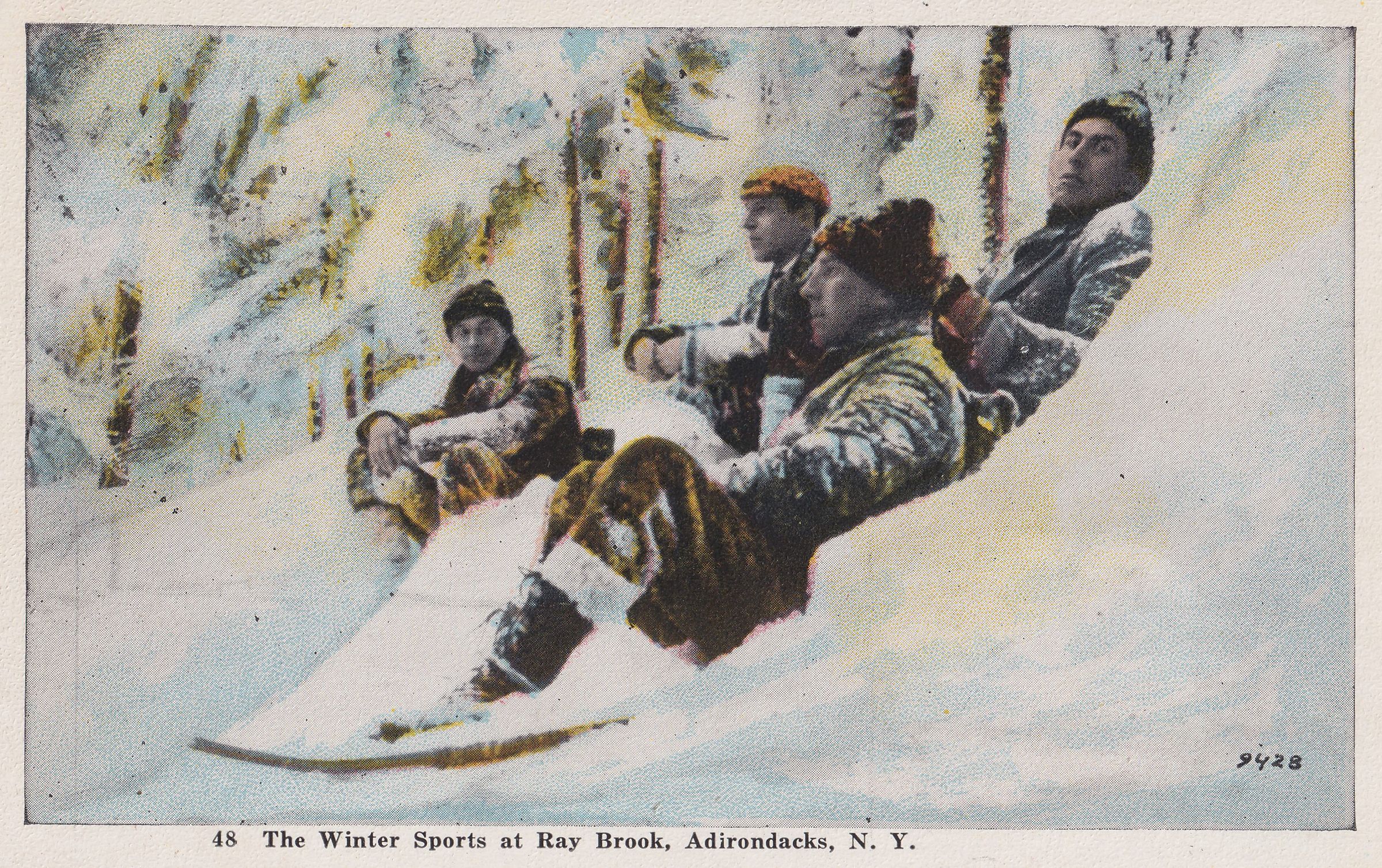 Color postcard showing four men sitting in the snow, possibly wearing snowshoes. Printed caption on front reads, "The Winter Sports at Ray Brook, Adirondacks, N.Y." No printer's mark. Unused, divided back, white border.Subject Place