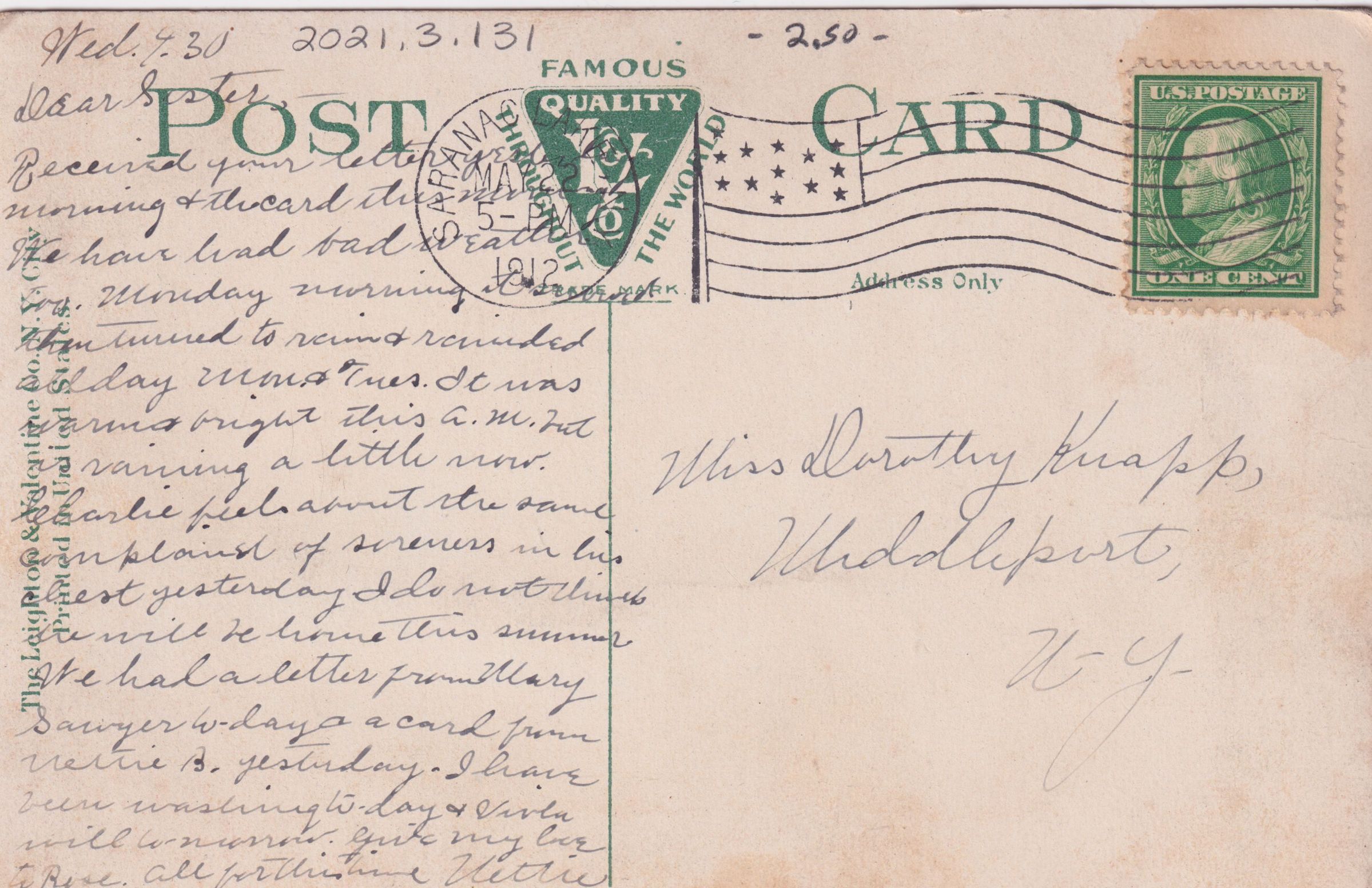 Color postcard showing a group of people standing on top of a mountain. Printed caption on front reads, "Top of Whiteface Mountain, Adirondacks, N. Y." Used, divided back, postmarked Saranac Lake, May 22, 1912. Printed by the Leighton & Valentine Co., NY. Handwritten caption on back reads, "Wed. 4:30. Dear sister - Received your letter yesterday morning & the card this morning. We have had bad weather too. Monday morning it snowed then turned to rain & remained all day Mon. & Tues. It was warm & bright this a.m. but is raining a little now. Charlie feels about the same. Complained of soreness in his chest yesterday. I do not think he will be home this summer. We had a letter from Mary Sawyer w-day & a card from Nettie B. yesterday. I have been washing to-day & Viola will to-morrow. Give my love to Rose. All for this time, Nettie." Mailed to Miss Dorothy Knapp, Middleport, NY.Subject Place