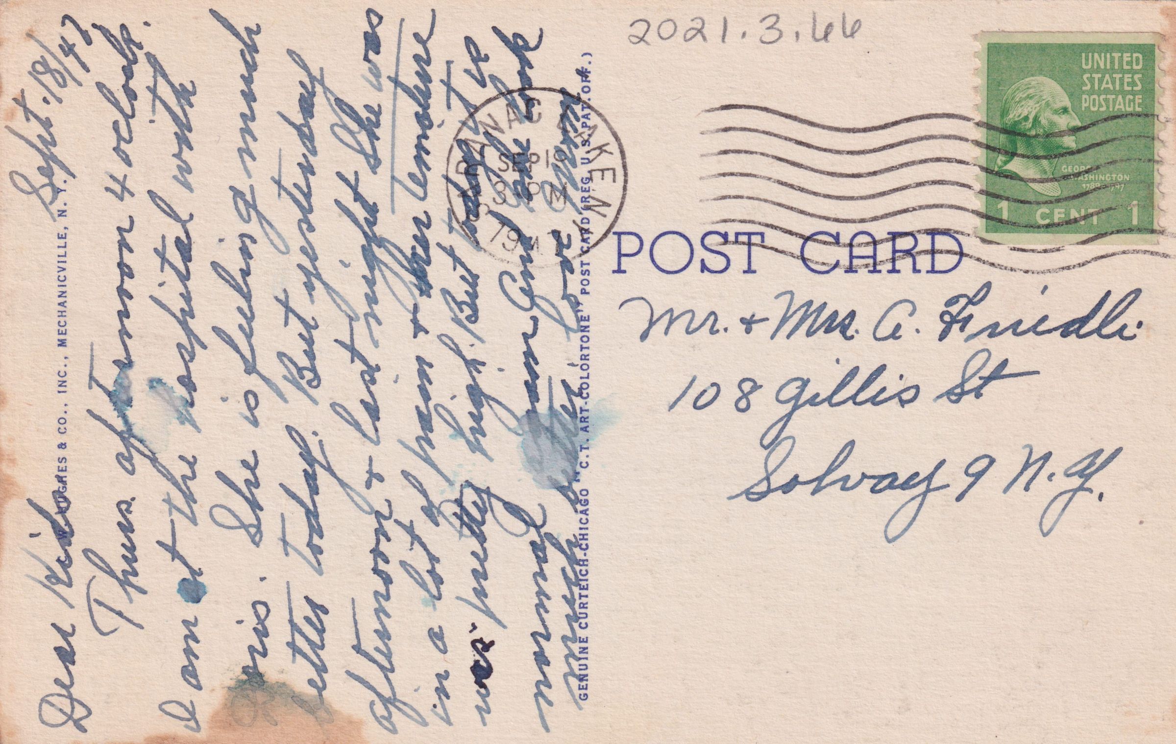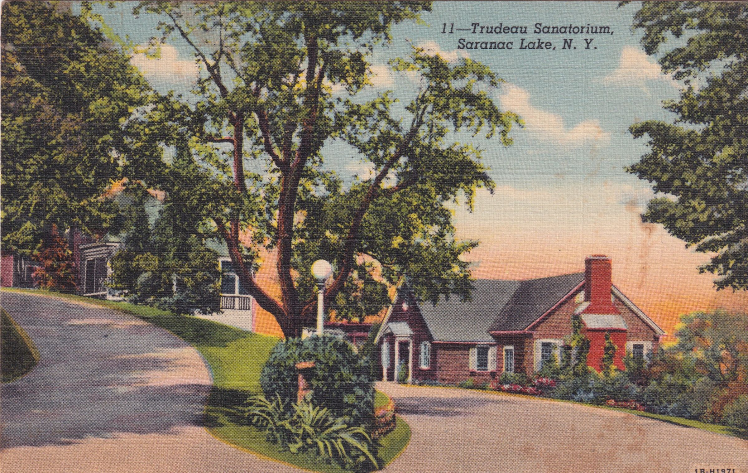 Color postcard of the grounds of Trudeau Sanatorium with the Recreation Pavilion visible in the distance. Printed caption on the front reads, "11--Trudeau Sanatorium, Saranac Lake, N.Y." Used, divided back, postmarked September 19, 1947, Saranac Lake, NY. Printed by C. W. Hughes & Co., Inc., Mechanicville, NY. Handwritten message on the back reads, "Dear Kids, Thursday afternoon 4:00 O'Clock. I am at the hospital with Doris. She is feeling much better today but yesterday afternoon and last night she was in a lot of pain and her temperature was pretty high. But today it is normal again and she looks much better. Love Mom." Mailed to Mr. & Mrs. A. Friedli, 108 Gillis St., Sobray, NY.Subject Place