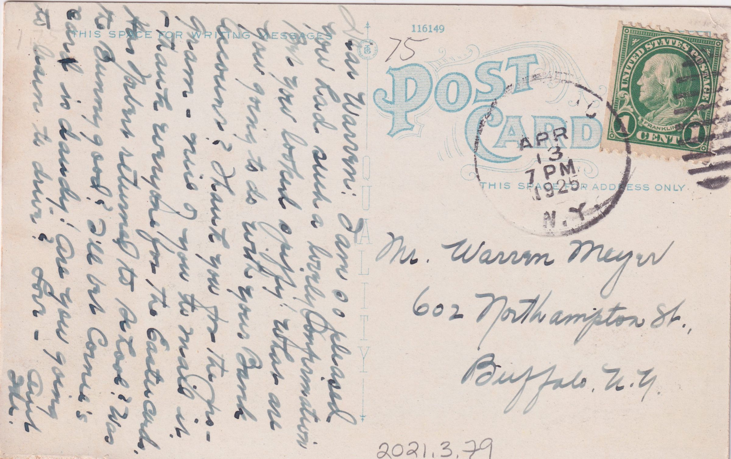 Color postcard showing the stone chapel, Baker Chapel, at Trudeau Sanatorium. Printed caption on the front reads, "Trudeau Sanitarium [sic] Chapel. Saranac Lake, N. Y." Used, divided back, postmarked April 13, 1925. Printed in Cambridge, Mass. Handwritten message on the back reads, "Dear Warren - I am so pleased you had such a lovely confirmation bet you looked spiffy. What are you going to do with your bank account? Thank you for the program - nice of you to mail it. Thank everyone for the Easter cards. Has Norbert returned to school? Was the bunny good? I'll bet Cornie's card is dandy. Are you going to learn to drive? Love Aunt Ida." Mailed to Mr. Warren Meyer, 602 Northampton St., Buffalo, NY.Subject Place