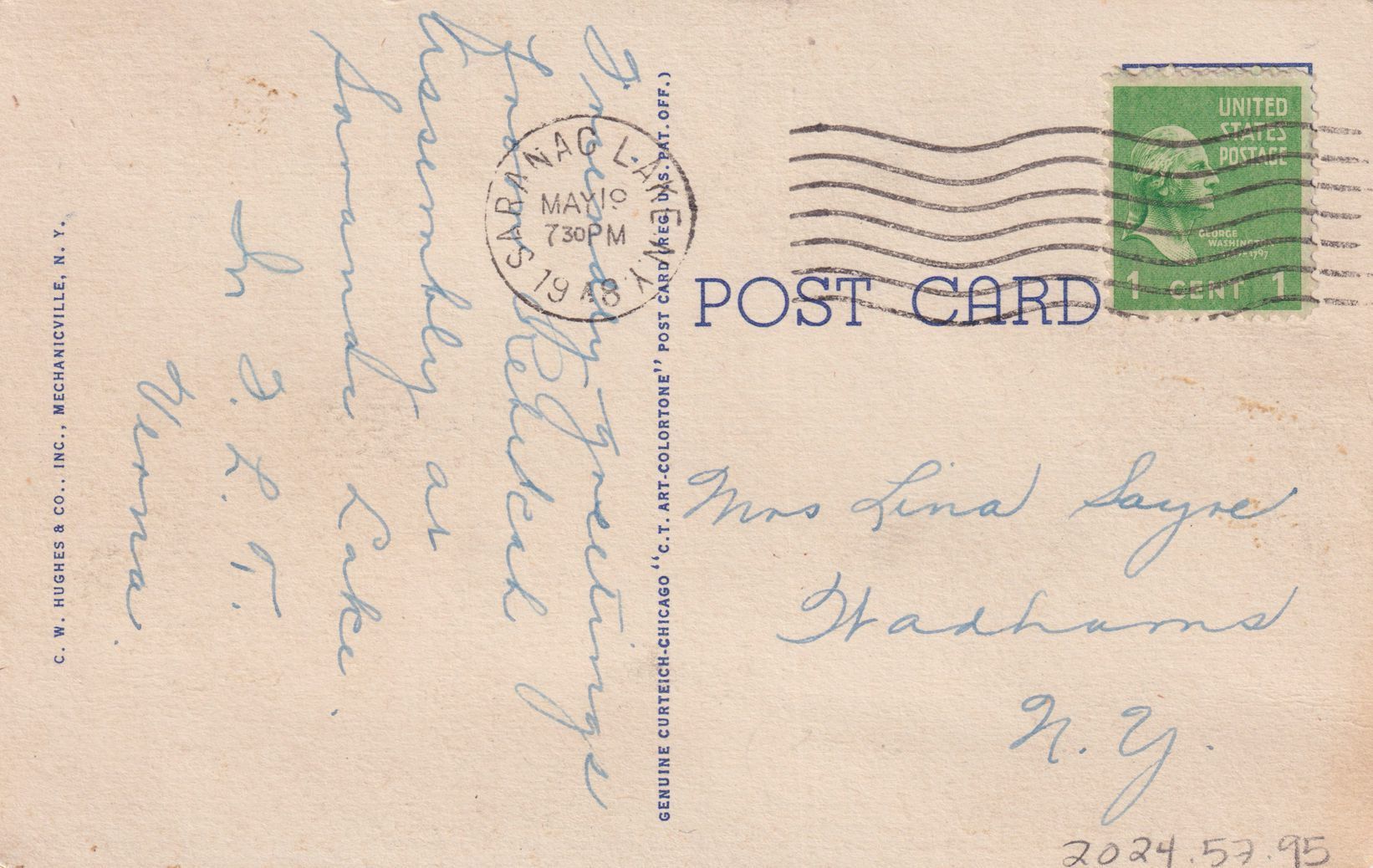 Color linen postcard showing a view of Upper Saranac Lake with a sunset in the distance. Printed caption on front reads, "Upper Saranac Lake from Bartlett Carry, Saranac Lake, N. Y. Adirondack Mts." Printed by C. W. Hughes & Co., Inc., Mechanicville, NY. Used, divided back, white border, postmarked Saranac Lake, May 19, 1948. Handwritten message on reverse reads, "Friendly greetings from Rebekah Assembly at Saranac Lake. In F. L. T. Verna." Mailed to Mrs. Lina Sayre, Wadhams, NY.Subject Place