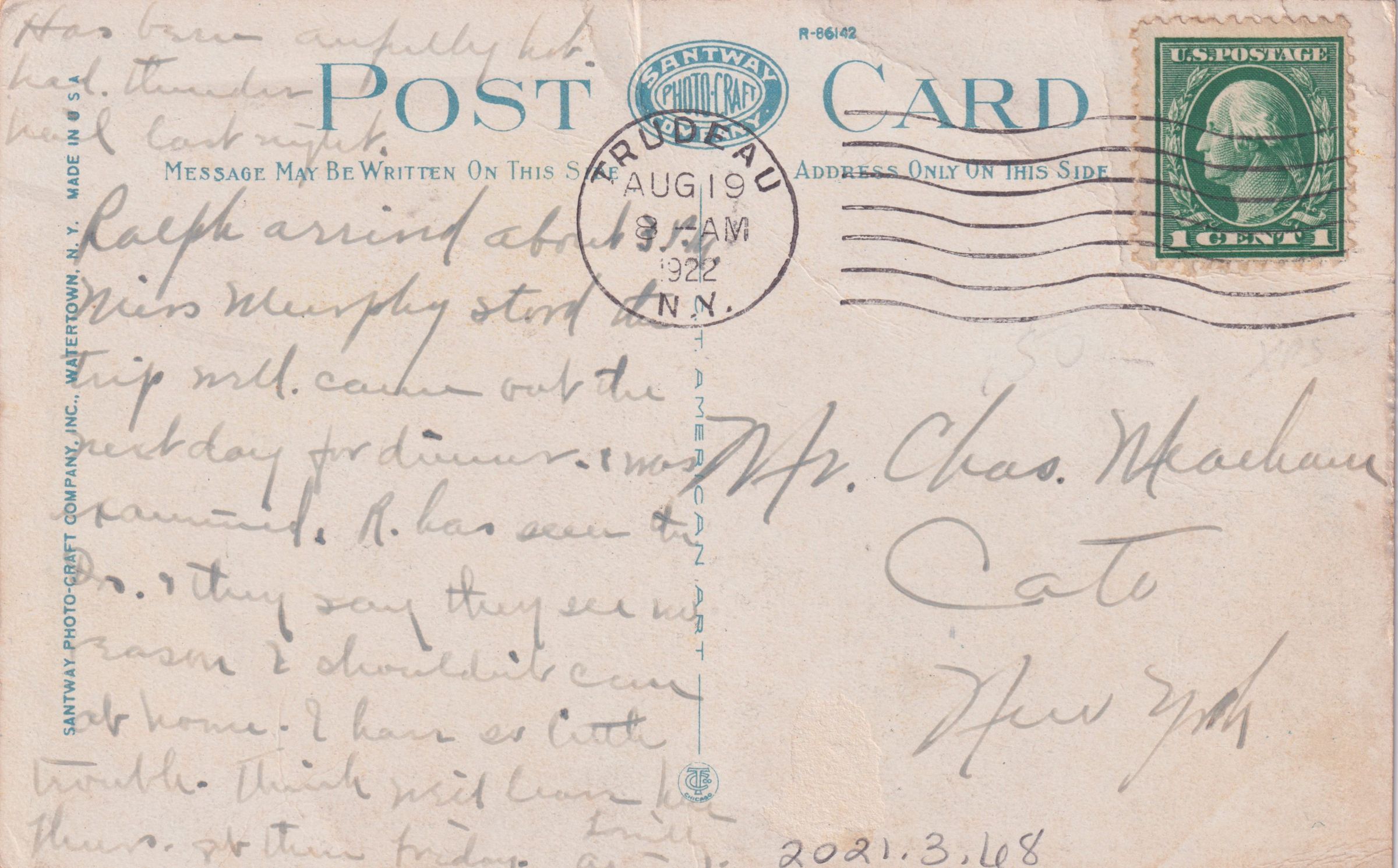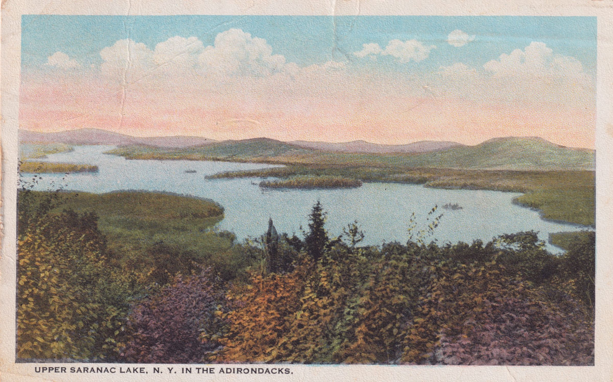 Color postcard showing the view out over Upper Saranac Lake. Printed caption on the front reads, "Upper Saranac Lake, N.Y. in the Adirondacks." Used, divided back, postmarked August 19, 1922, Trudeau, NY. Printed by Santway Photo-Craft Company, Inc., Watertown, NY. Handwritten message on the back reads, "Ralph arrived about 3:00 PM. Miss Murphy stood the trip well. The next day before dinner I was examined. R has seen the Dr. and they see no reason I shouldn't cure at home. I have so little trouble. Think will leave here Thursday and get there Friday. Has been awfully hot, had thunder, hail last night." Mailed to Mr. Chas. Meacham, Cato, New York.Subject Place