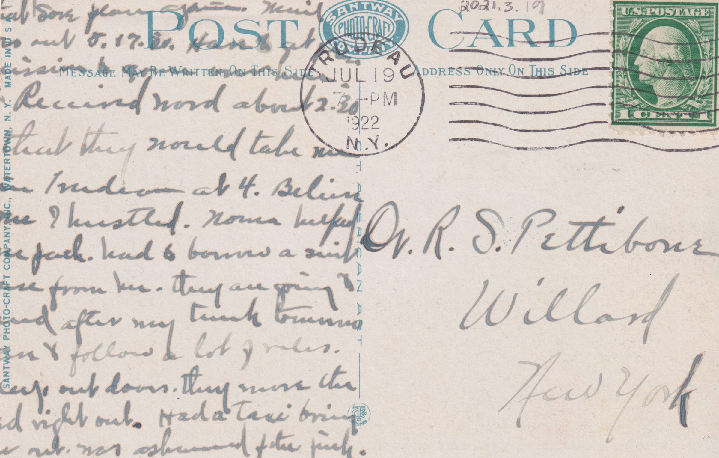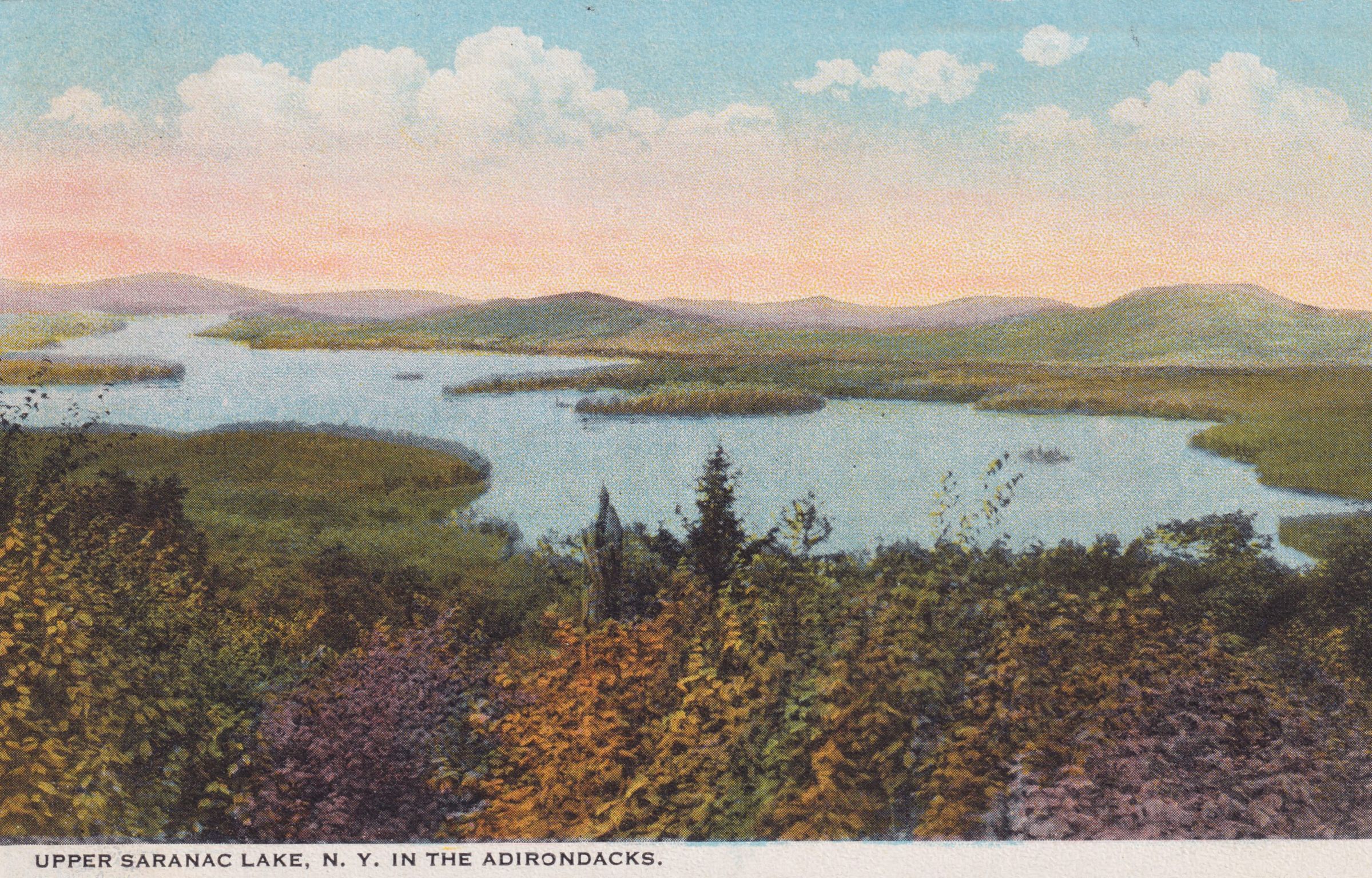 Color postcard looking across Upper Saranac Lake to the north [possibly from Panther Mountain]. Used, divided back, partial white border [appears to have been trimmed on top and sides], postmarked July 19, 1922. Printed by Santway Photo - Craft Company, Inc. Watertown, NY. Caption printed on front reads, "Upper Saranac Lake, N. Y. in the Adirondacks." Handwritten message on back reads, "[first few lines are cropped/illegible] ...Received word at 2:30 that they would take me at Trudeau at 4. Believe me I hustled. Norma helped me pack. Had to borrow suitcase from her. They are going to send after my trunk tomorrow. [?] & follow a lot of rules. Sleep outdoors. They move the [?] right out. Had a taxi bring me out, was ashamed of the [price?]." Mailed to Dr. R. S. Pettibone, Willard, New York.Subject Place