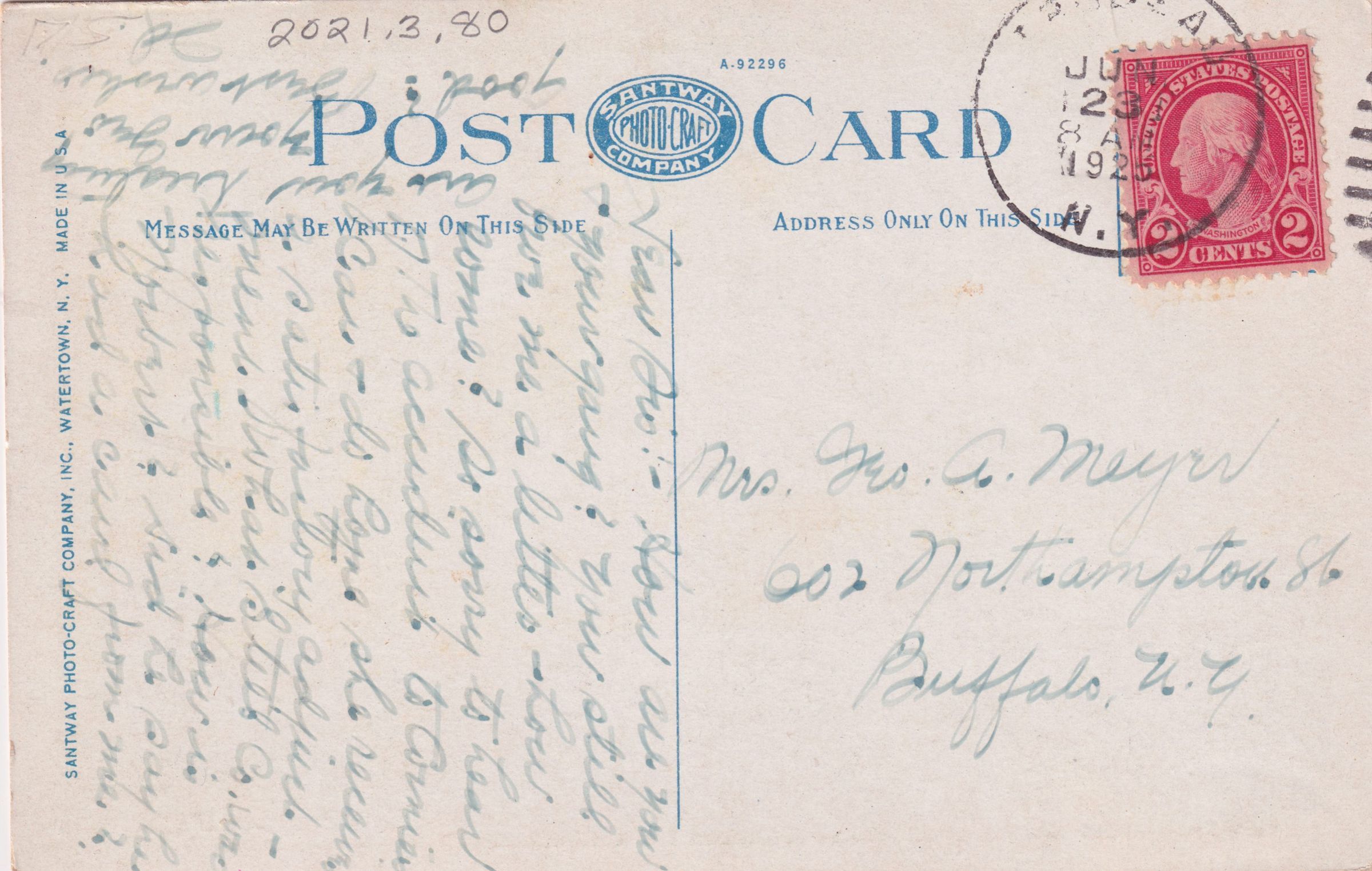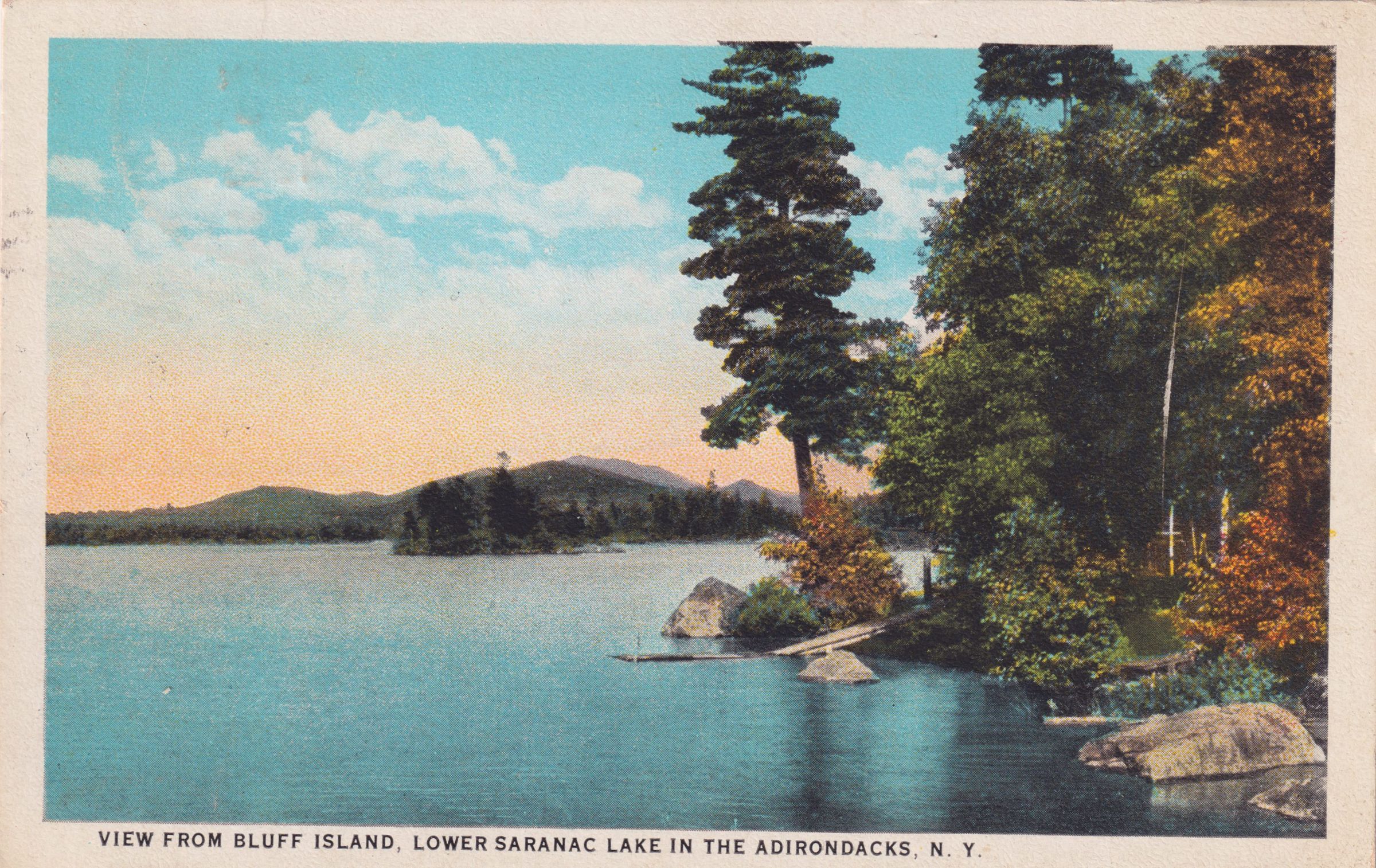 Color postcard showing a tree-lined lake shore with mountains in the distance. Printed caption on the front reads, "View from Bluff Island, Lower Saranac Lake in the Adirondacks, N. Y." Used, divided back, postmarked June 23, 1925. Printed by the Santway Photo-Craft Company, Inc., Watertown, NY. Handwritten message on the back reads, "Dear Sis - How are you and your gang? You still owe me a letter - how come? So sorry to hear of the accident to Cornie's car - do hope she receives a satisfactory adjustment. What Stelb Co. was responsible? How is Norbert? Did he say he had a card from me? Are you treating your Geo good? Best Wishes, Id." Mailed to Mrs. Geo. A. Meyer, 602 Northampton St., Buffalo, NY.Collection