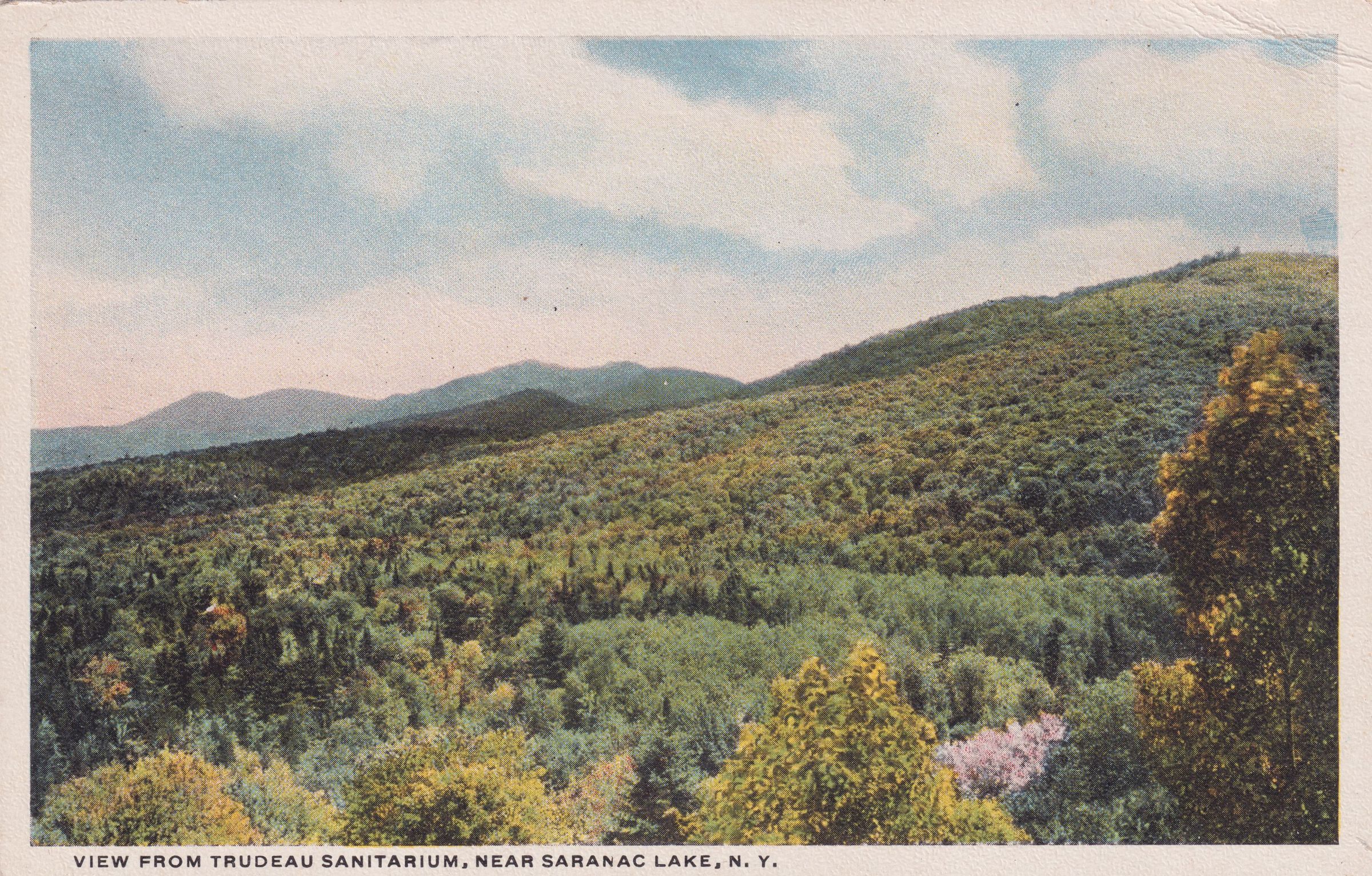 Color postcard showing a tree-covered hillside, likely Mt. Baker. Printed caption on front reads, "View from Trudeau Sanitarium, Near Saranac Lake, N. Y." Unused, divided back, white border. Printed by Santway Photo-Craft Company, Inc., Star Lake, NY.Subject Place