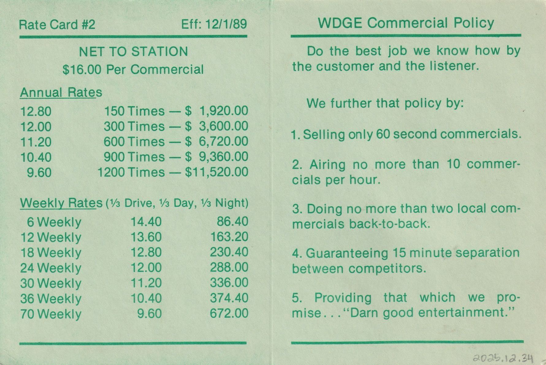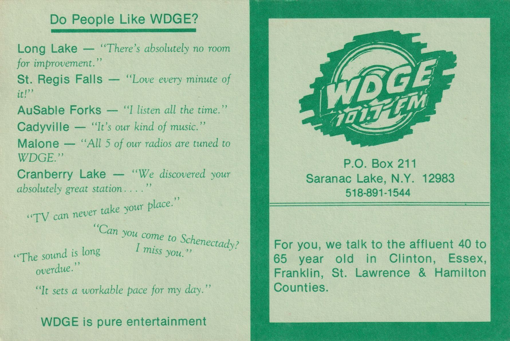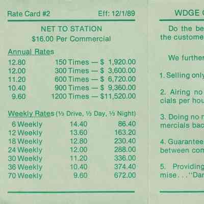 Advertising card for the radio station WDGE 101.7 FM. The front side has the station's logo, address, and positive reviews from listeners. The back side has a rate card for the station and their commercial policy. Published 1989. Light green with darker green ink.Lexicon