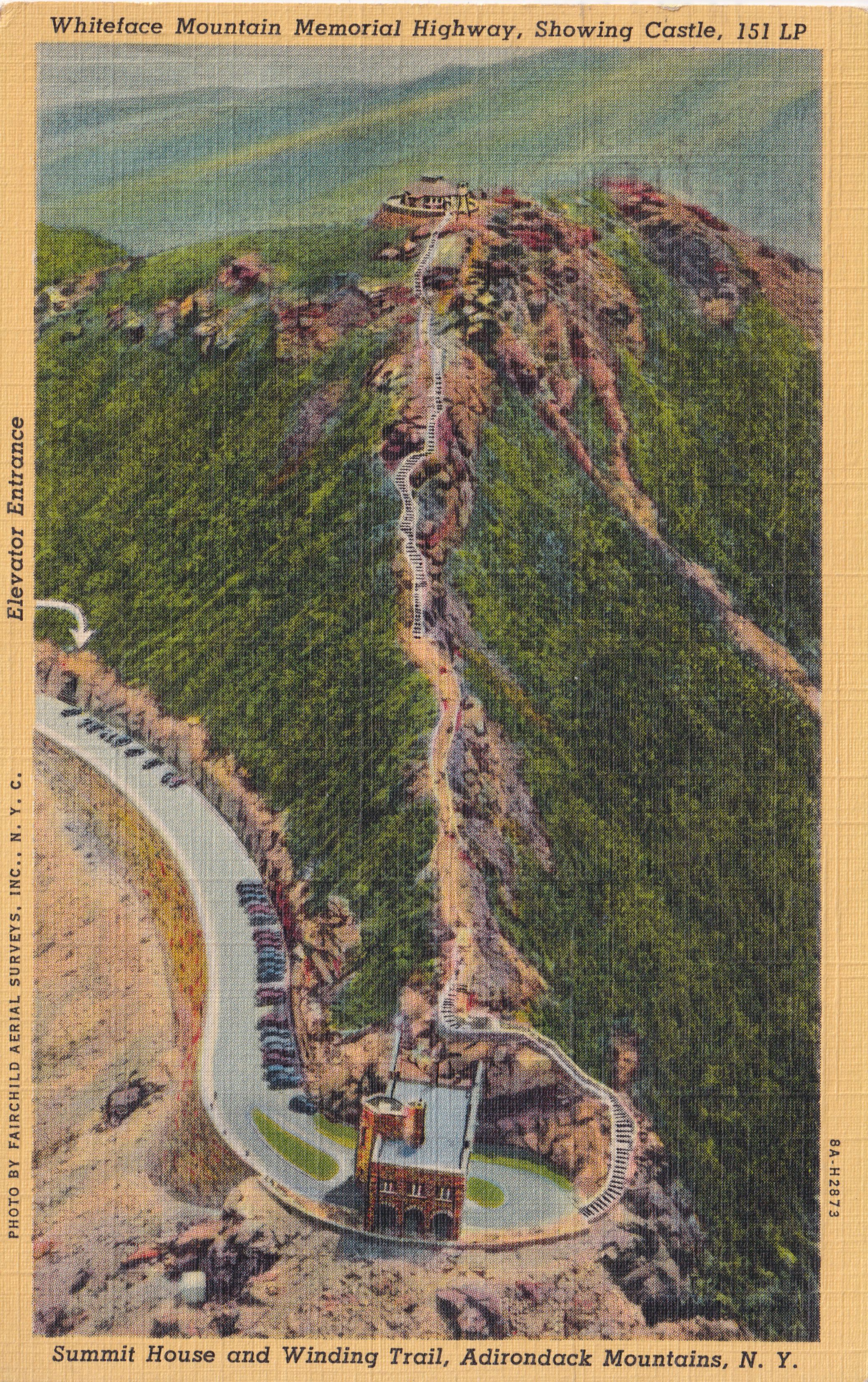 Color postcard showing an image of the highway and observation deck on Whiteface Mountain. Printed caption on the front reads, "Whiteface Mountain Memorial Highway, Showing Castle, 151 LP. Summit House and Winding Trail, Adirondack Mountains, N. Y." The elevator entrance is indicated with an arrow as well. Photo by Fairchild Aerial Surveys, Inc., N.Y.C. Used, divided back, postmarked June 15, 1940, Saranac Lake, NY. Printed by C. W. Hughes & Co., Inc., Mechanicville, NY. Handwritten message on the back reads, "Dear Victoria, I meant to come and see you before I left but have been oh so blue. I arrived here yesterday, Thursday after a 338 mile drive. Its nice up here now. I drove up this mountain last year a nice sight. Say hello to all and a kiss to Maryann. Mrs. S. 16 Helen St, Saranac Lake, NY." Mailed to Mrs. G. Murray, 394 Amherst, Bflo, N.Y.Subject Place