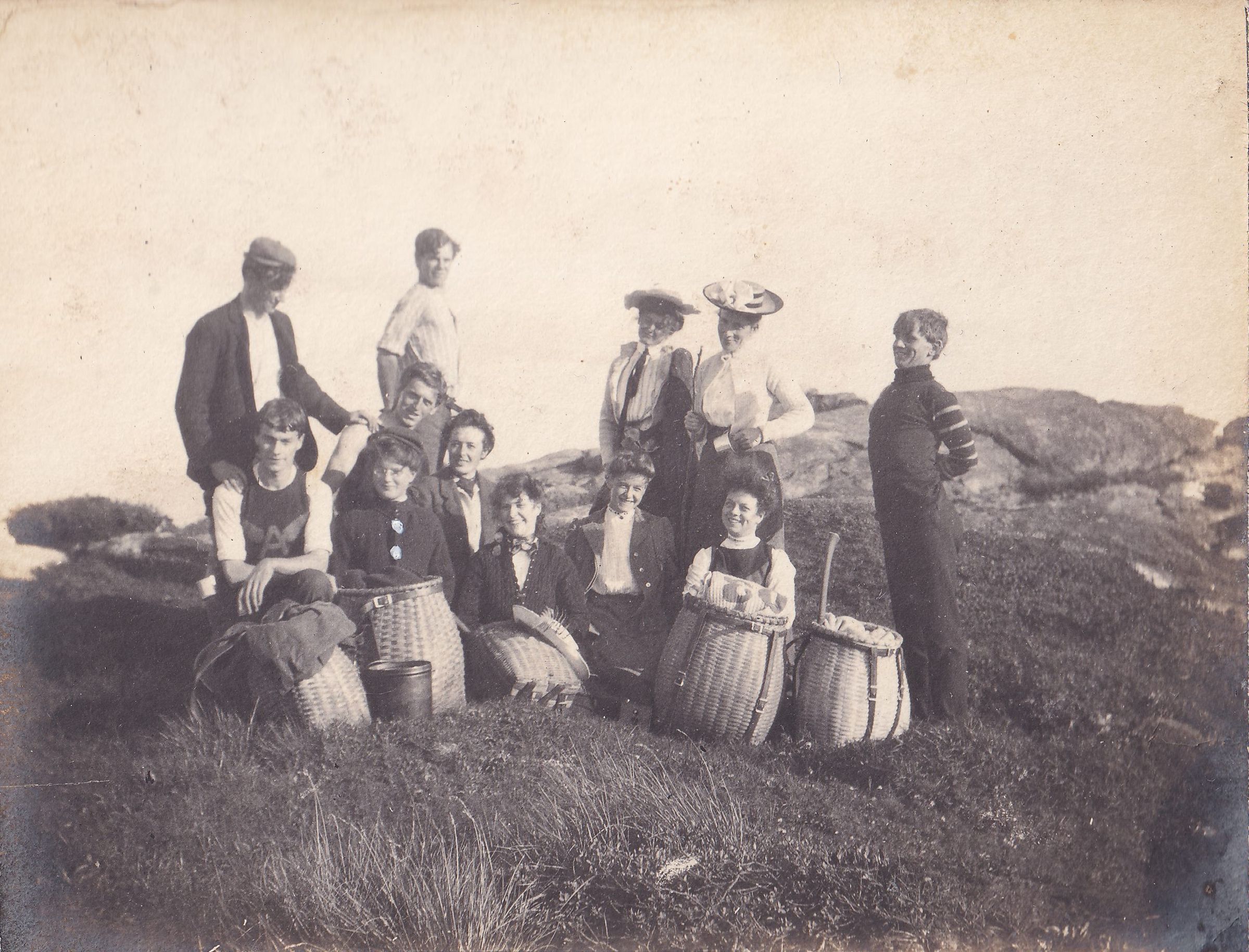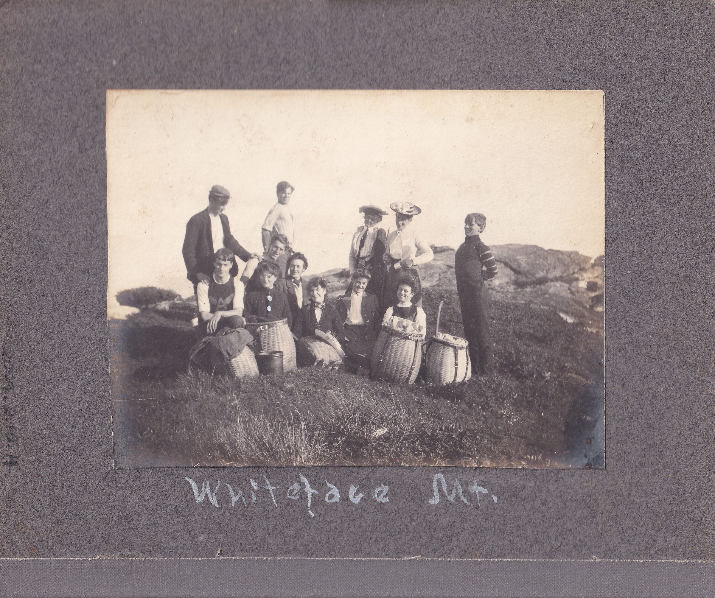 Photograph of a group of young people in a field. William (Bill) Distin is kneeling at left, wearing a Saranac Lake High School Alumni vest, and Blanche Smith is seated to his left. There are five pack baskets on the ground in front of them. Handwritten caption on page reads, "Whiteface Mt."Photograph Details