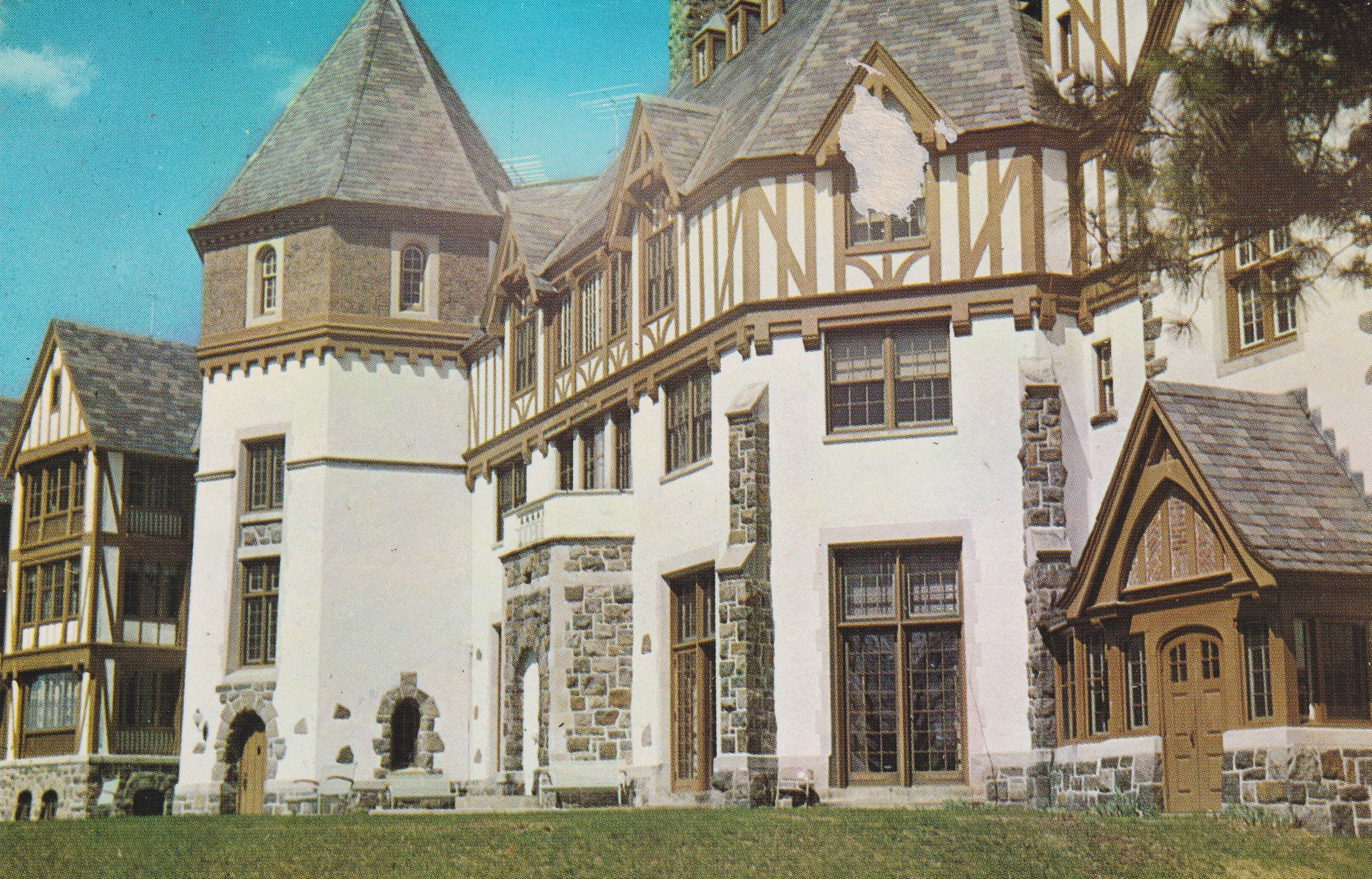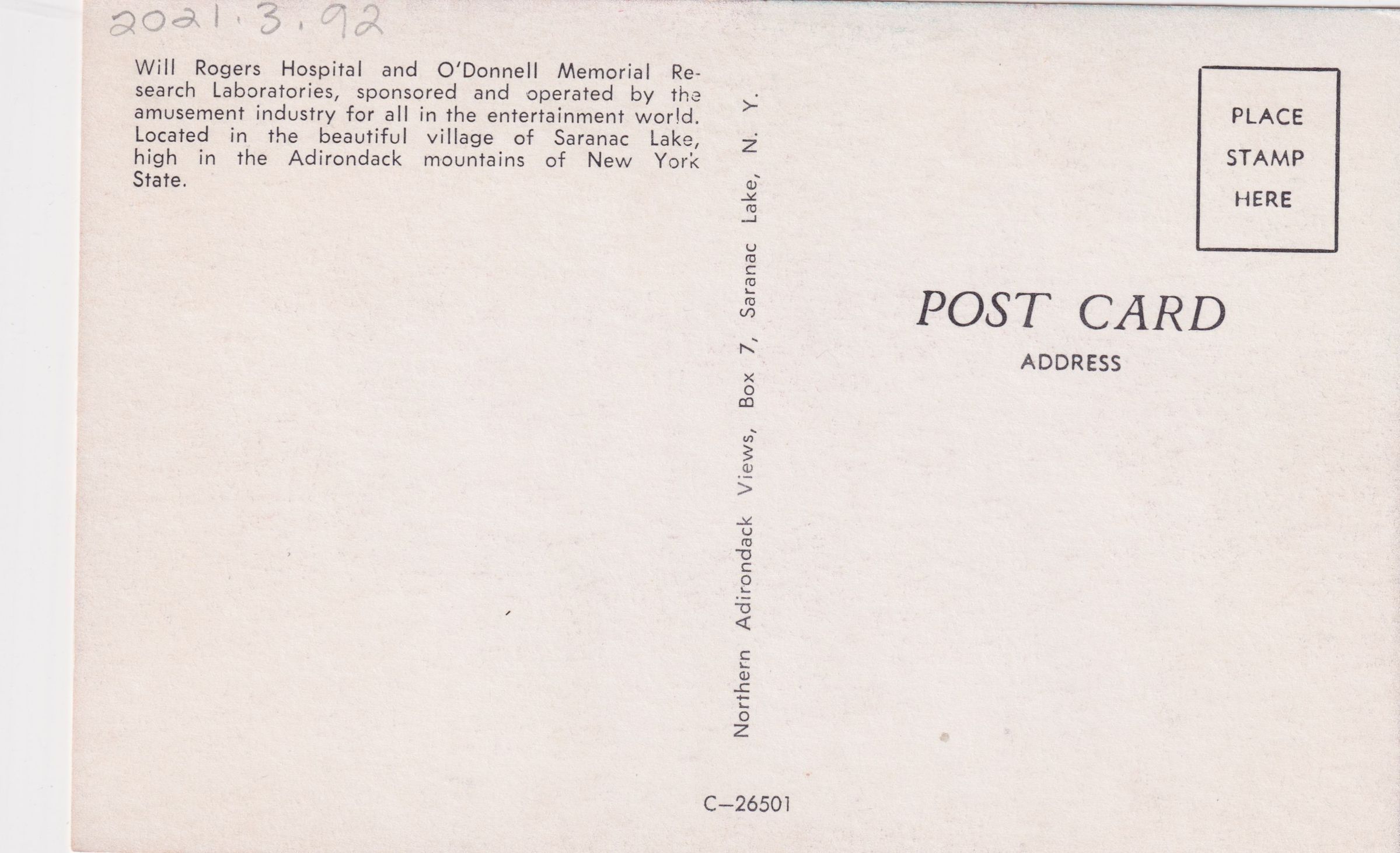 Color postcard showing the east face of the Will Rogers Hospital main building. Printed caption on reverse reads, "Will Rogers Hospital and O'Donnell Memorial Research Laboratories, sponsored and operated by the amusement industry for all in the entertainment world. Located in the beautiful village of Saranac Lake, high in the Adirondack Mountains of New York State." Unused, divided back. Printed by Northern Adirondack Views, Saranac Lake, NY.Subject Place