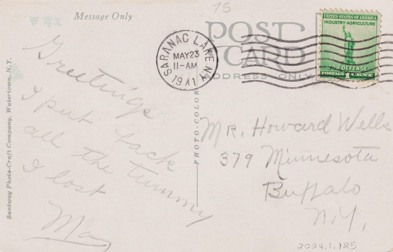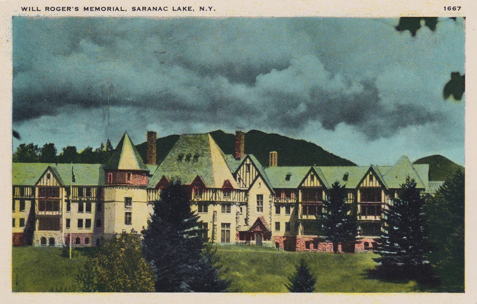Color postcard showing the west face of Will Rogers Memorial Hospital (AKA the National Vaudeville Artists' Home). Printed caption on front reads, "Will Roger's Memorial, Saranac Lake, N.Y." Printed by the Santway Photo-Craft Company, Watertown, NY. Used, divided back, white border, postmarked Saranac Lake, May 23, 1941. Handwritten message on back reads, "Greetings, I put back all the tummy I lost. Ma." Mailed to Mr. Howard Wells, 379 Minnesota, Buffalo, NY.Subject Place