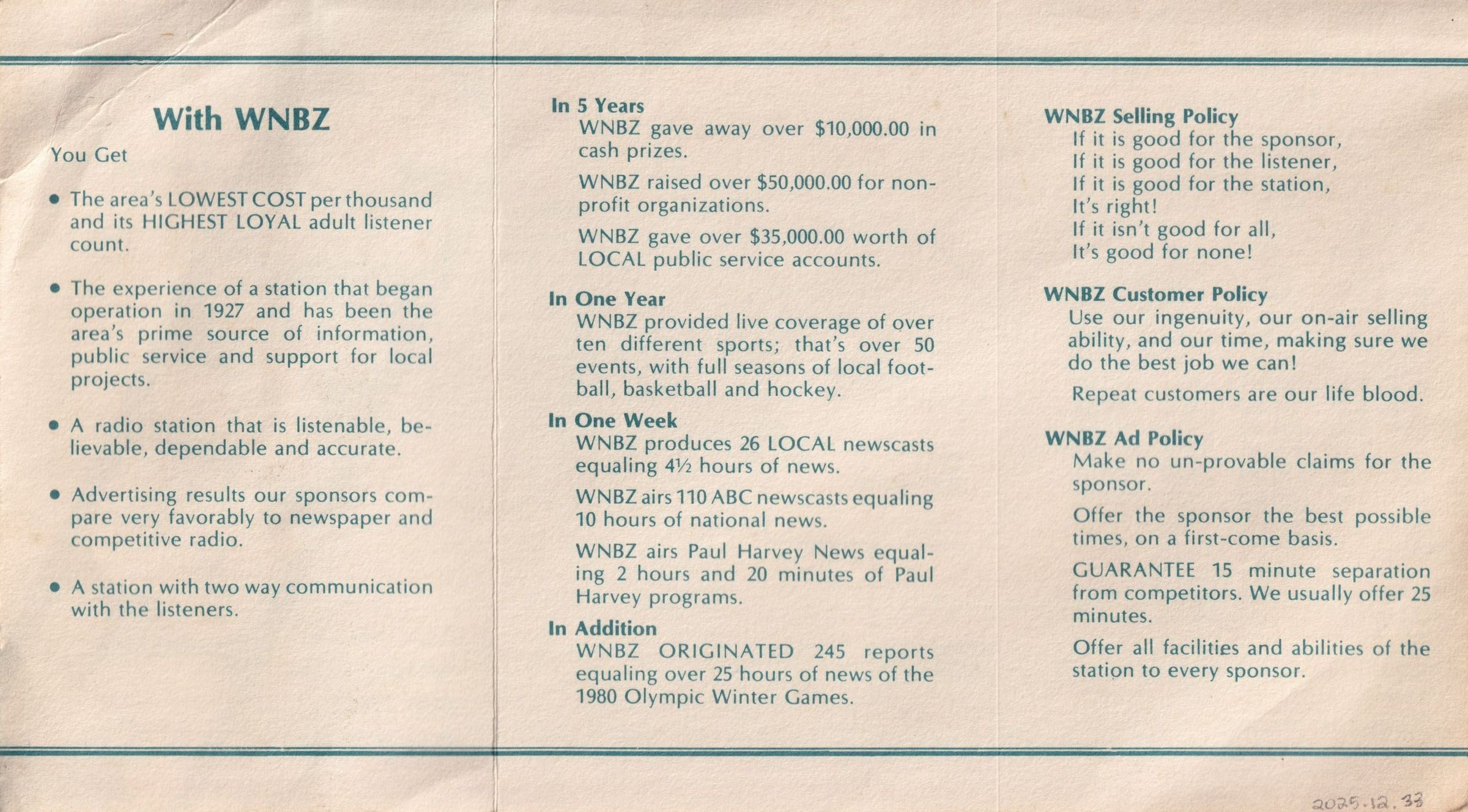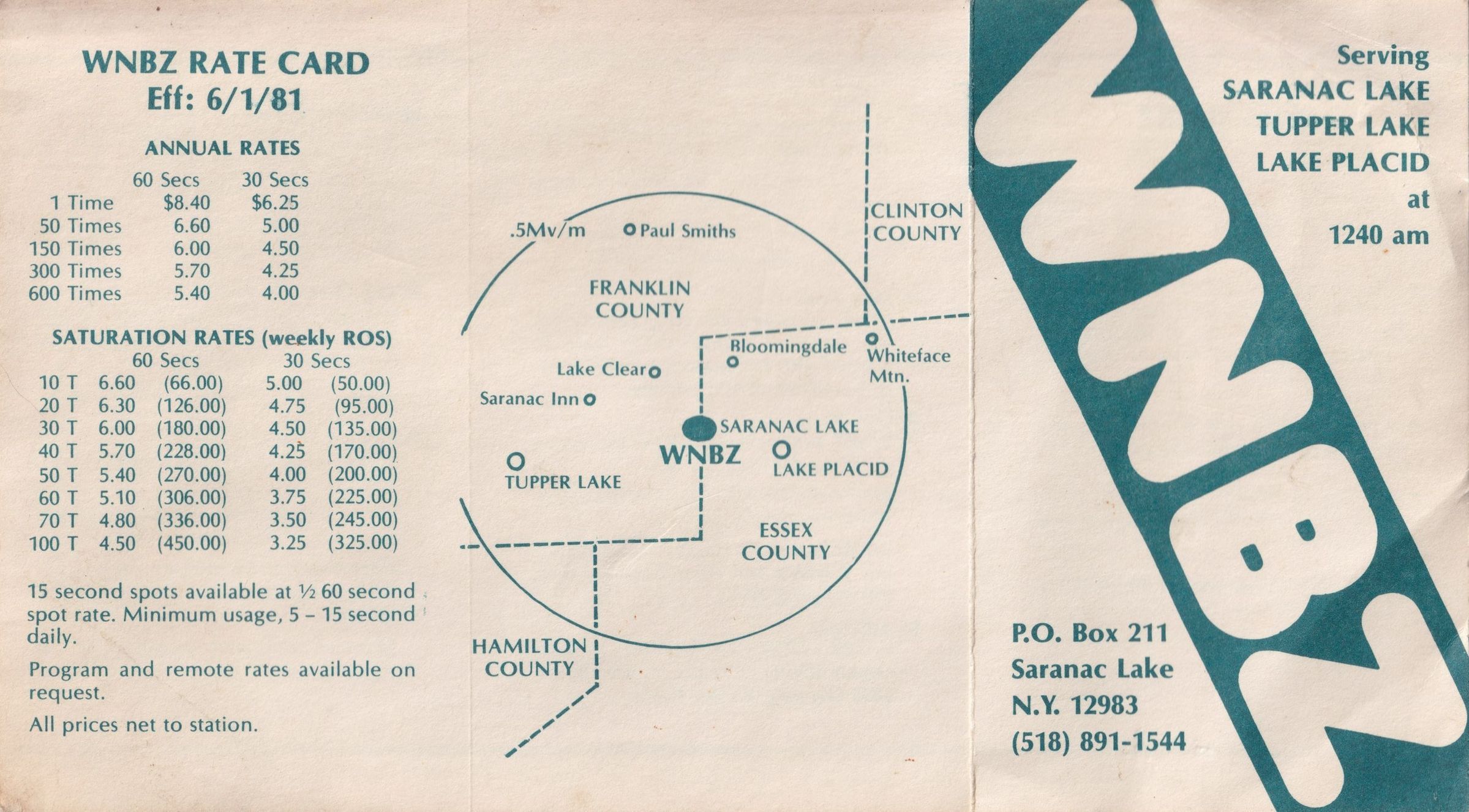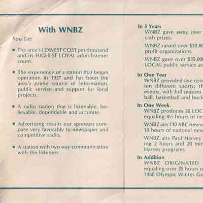 Brochure for the radio station WNBZ, "Serving Saranac Lake, Tupper Lake, Lake Placid at 1240 am" as it says on the front flap. The rest of the front of the unfolded brochure has a map showing the station's coverage area and a rate card. The other side of the unfolded brochure details what WNBZ has accomplished and their policies. Published 1981. White with blue ink.Lexicon